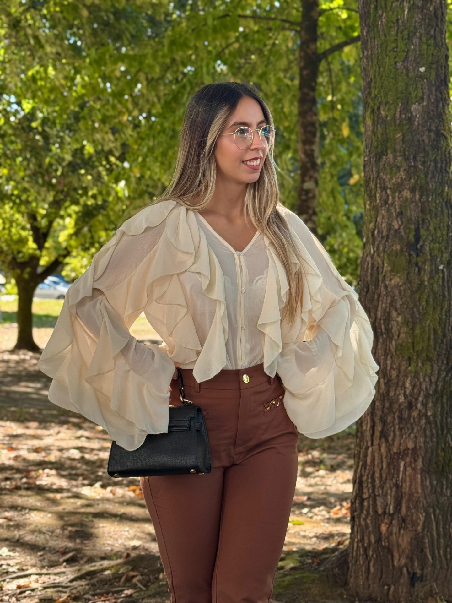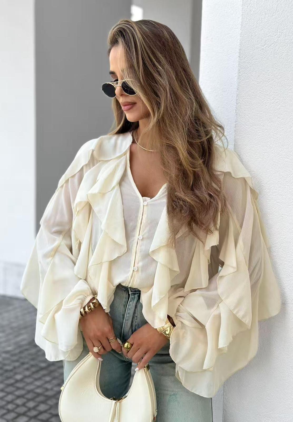 Blusa fluída em tecido leve e semi-transparente, com um design romântico e sofisticado. Apresenta folhos em camadas na parte frontal e nas mangas, criando um movimento delicado e cheio de charme.