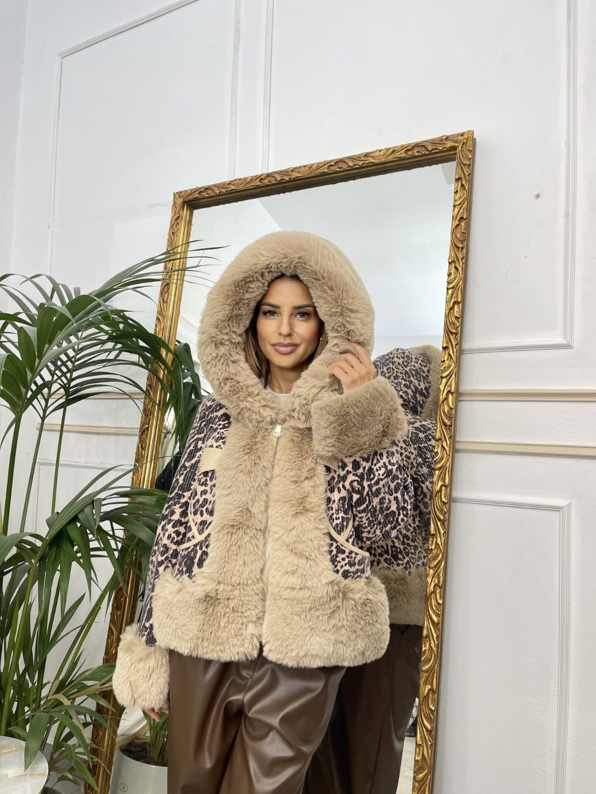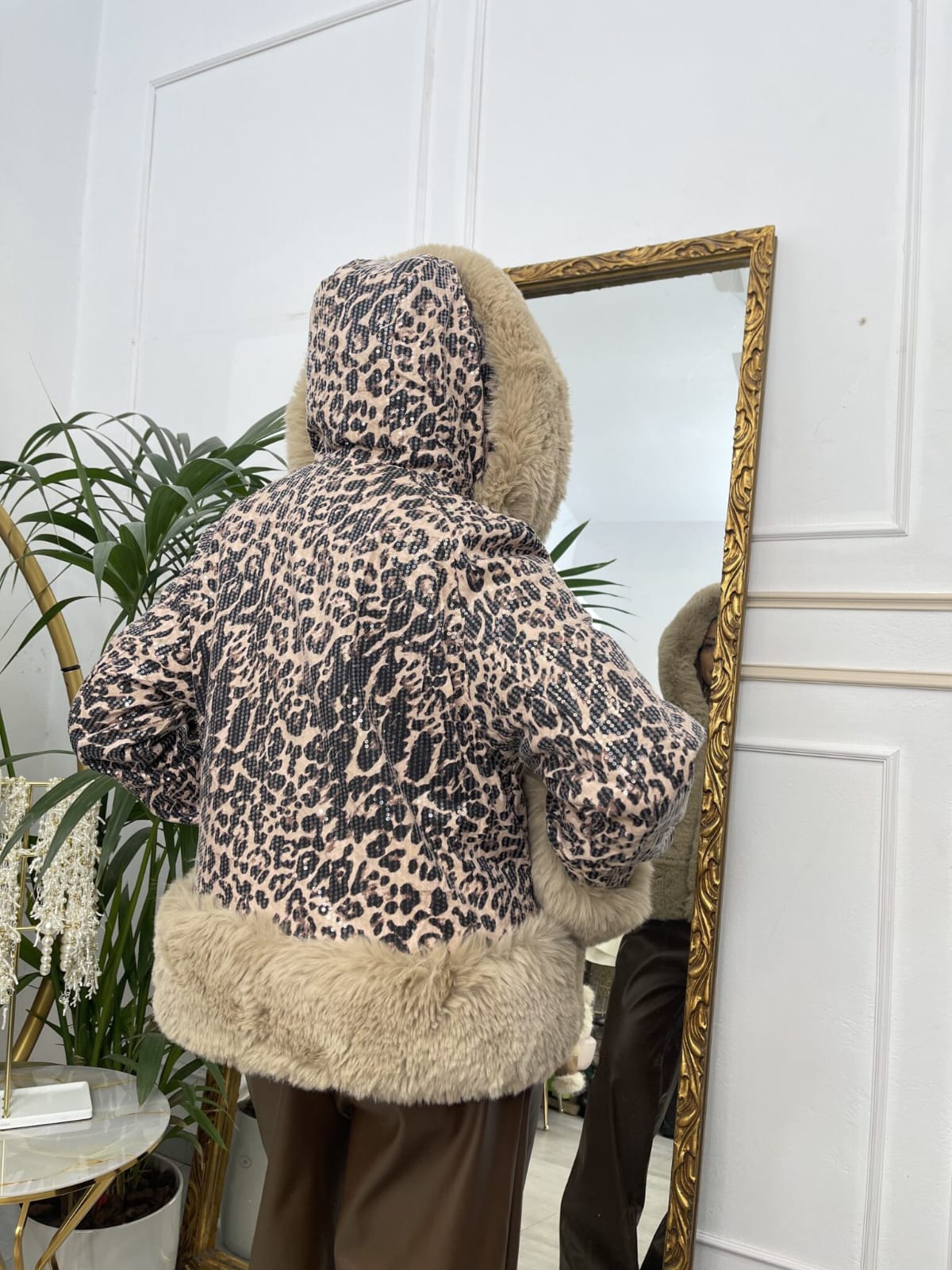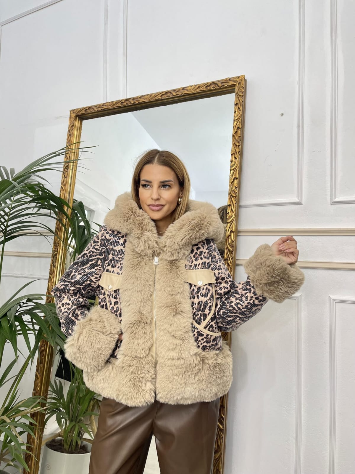 O modelo apresenta um design moderno e arrojado, com padrão animal print em tons neutros e aplicações de lantejoulas discretas, que acrescentam um toque de glamour. A parte frontal, punhos e barra inferior são revestidos em pêlo sintético macio, criando um contraste sofisticado e aconchegante.