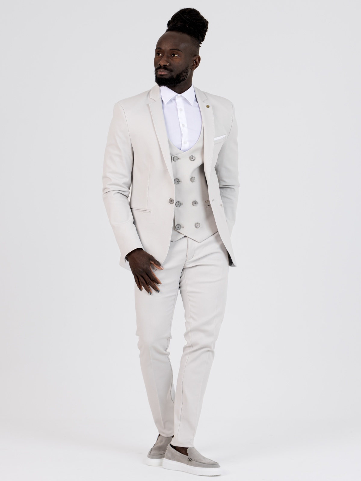 - Frente com abotoamento duplo (6 botões funcionais), que confere um toque clássico com um visual de alfaiataria;