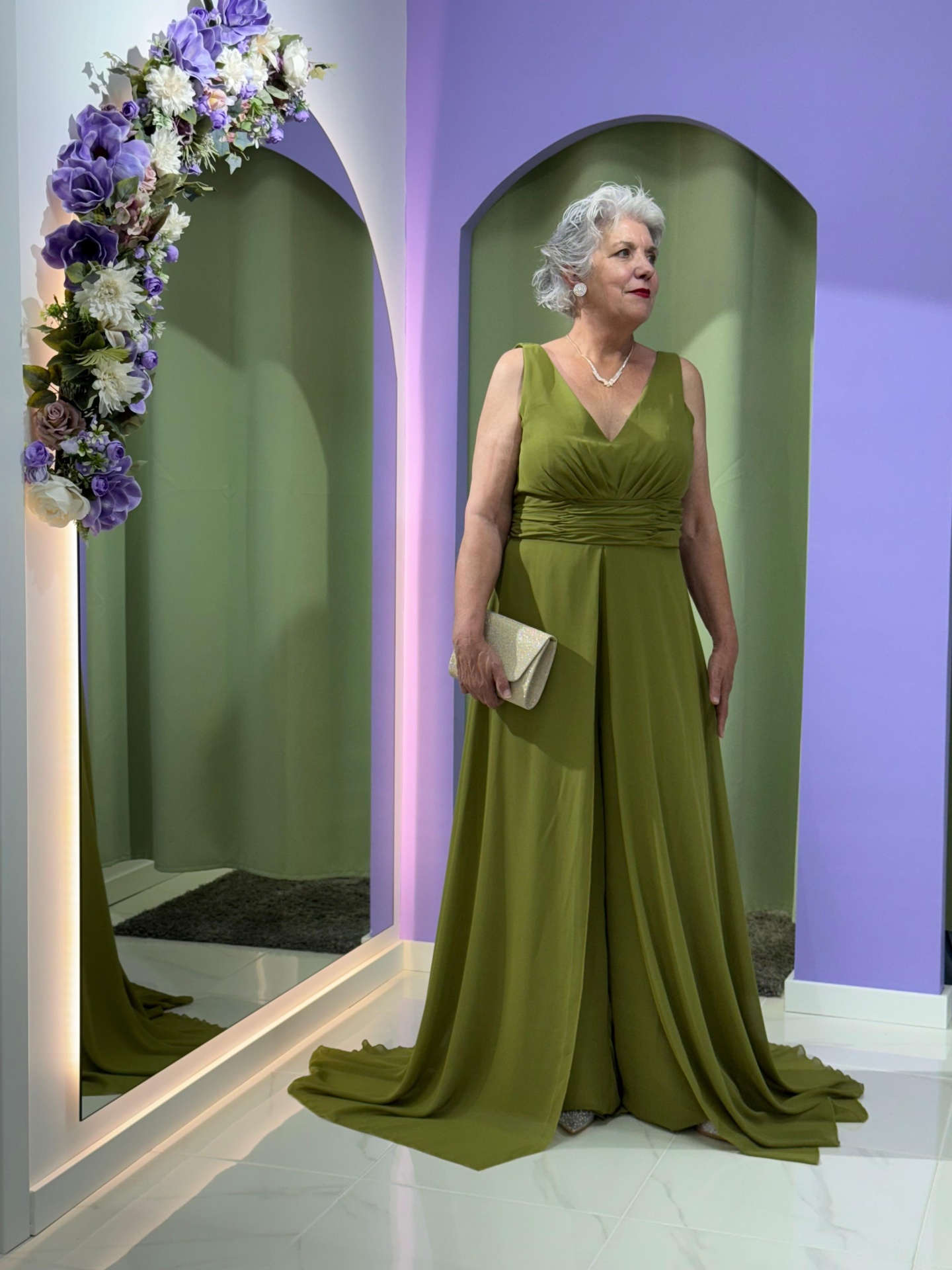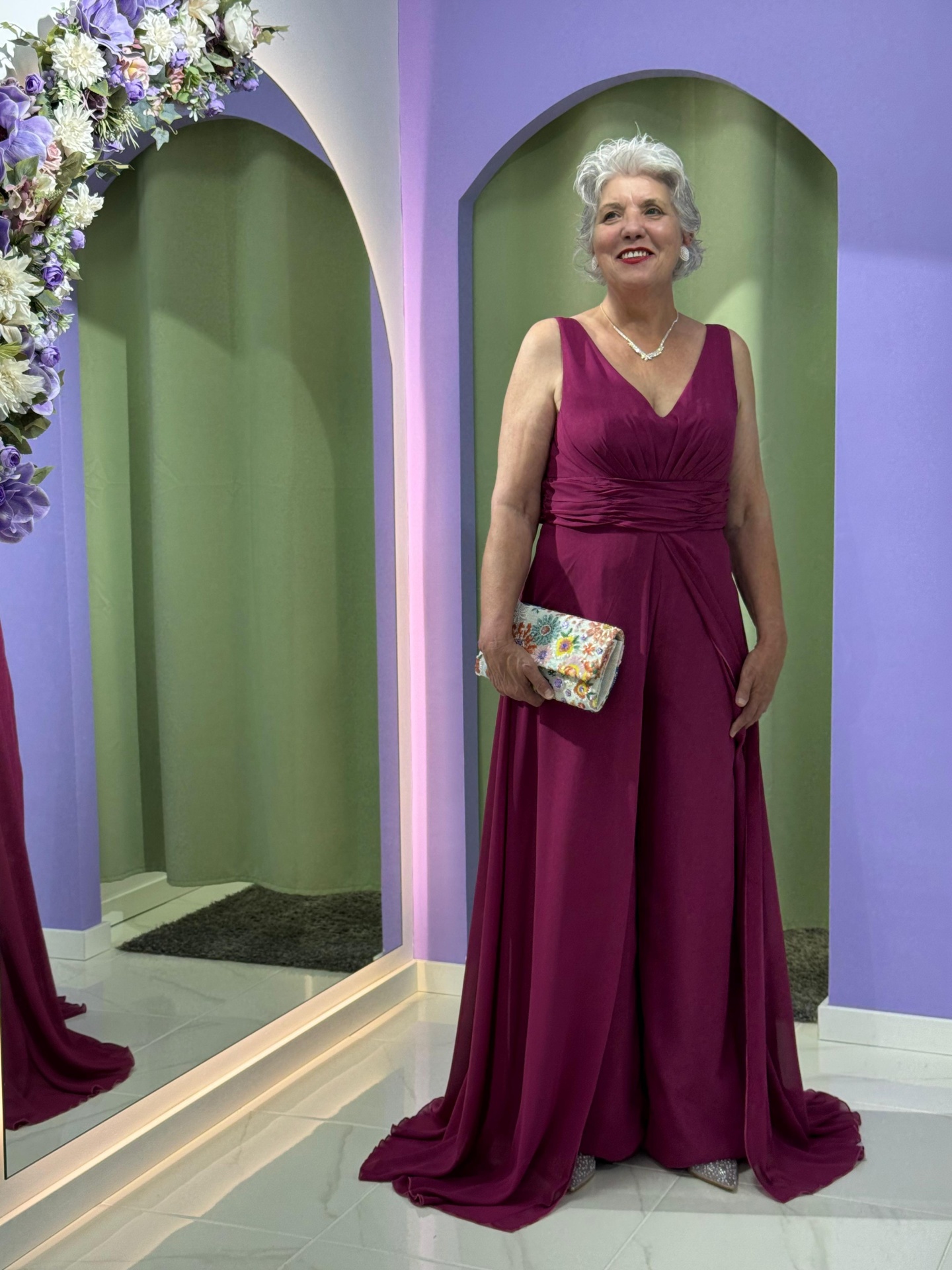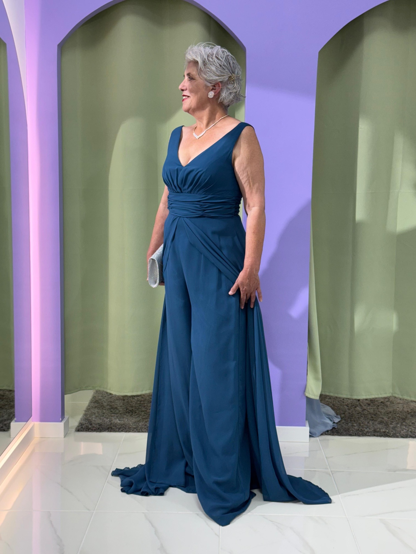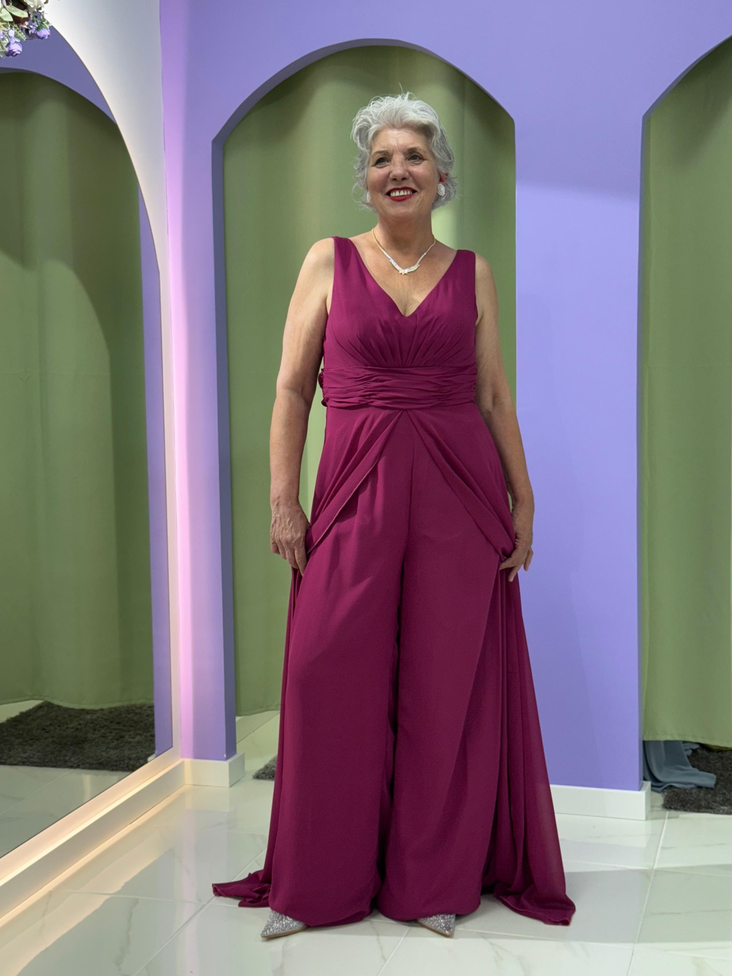 Com corte fluído e movimento leve, este macacão-vestido apresenta um decote em V que valoriza o colo e drapeado na cintura, realçando a silhueta de forma harmoniosa. O tecido suave e fluído garante um cair impecável, proporcionando conforto durante todo o evento.