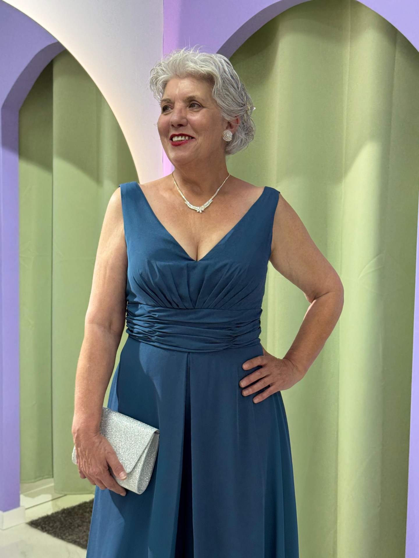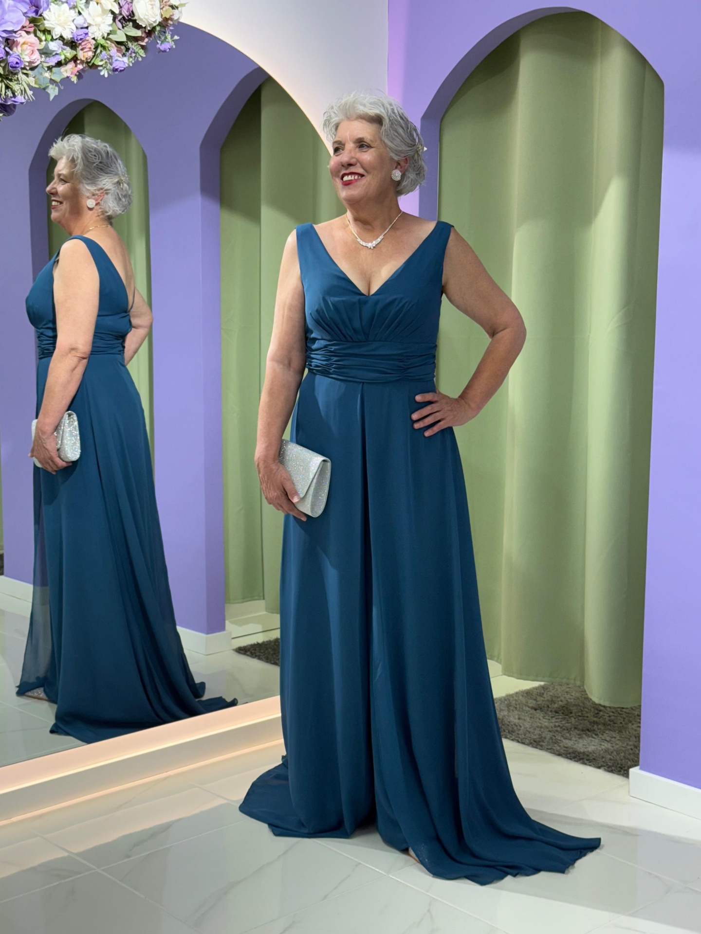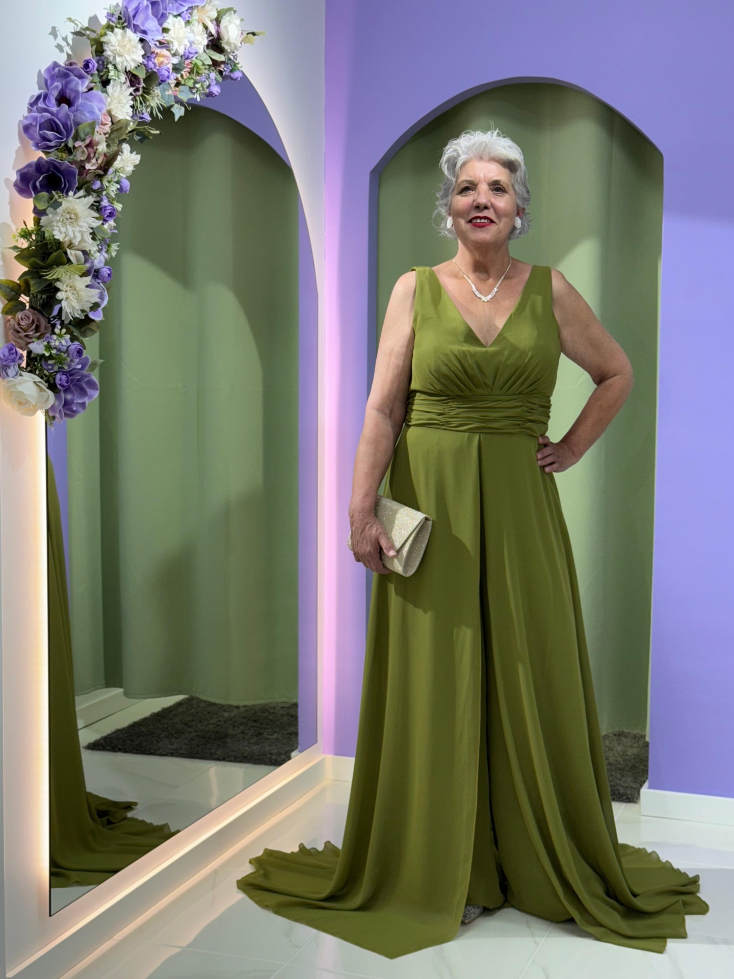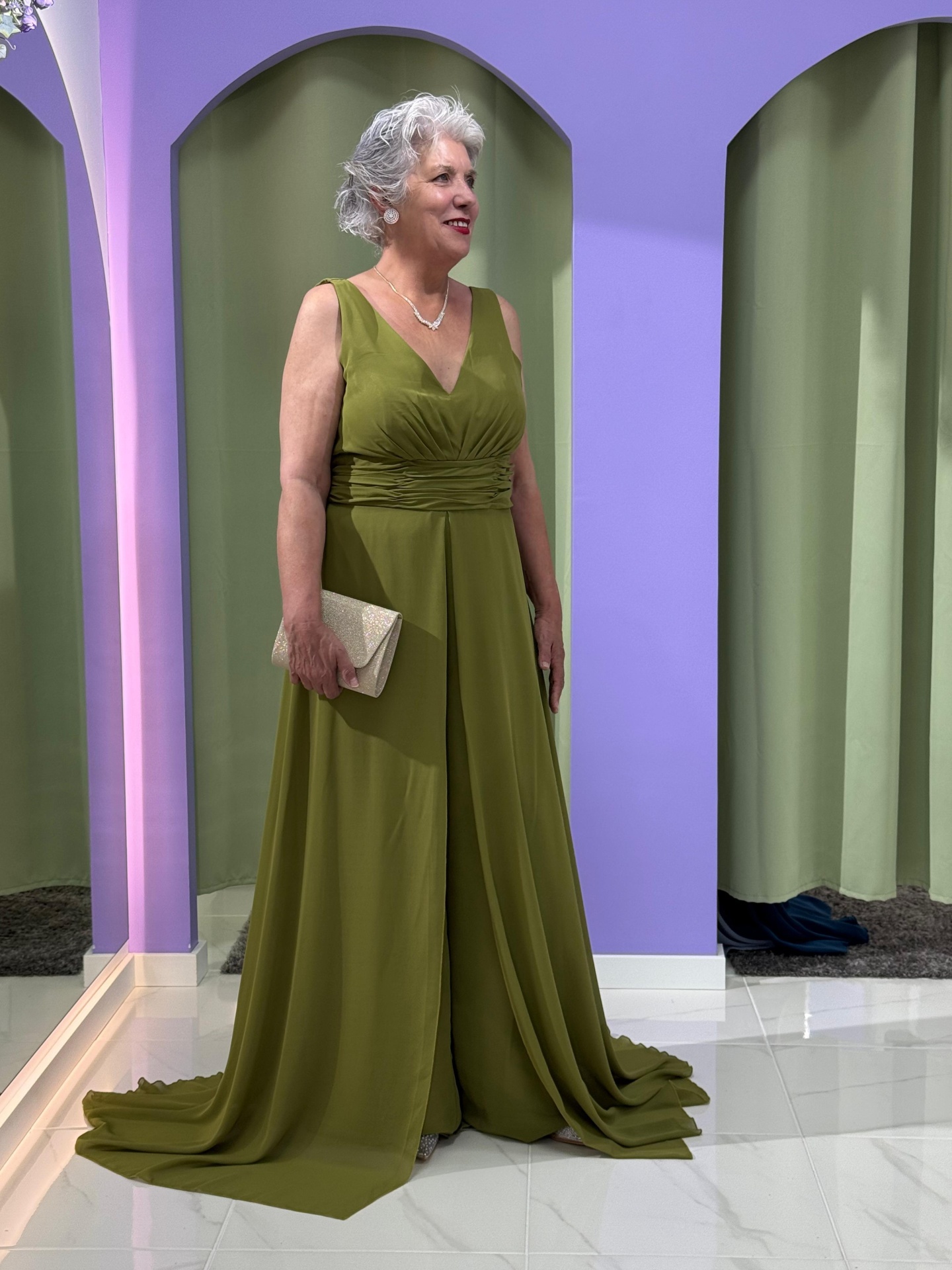 Com corte fluído e movimento leve, este macacão-vestido apresenta um decote em V que valoriza o colo e drapeado na cintura, realçando a silhueta de forma harmoniosa. O tecido suave e fluído garante um cair impecável, proporcionando conforto durante todo o evento.