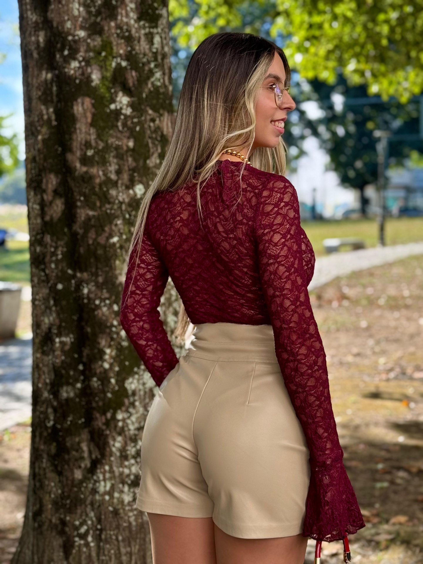 O modelo apresenta uma sobreposição frontal estilo saia, garantindo um visual feminino e elegante, enquanto o corte posterior em calção oferece total conforto e liberdade de movimento. O cinturão com aplicação metálica dourada confere um toque de requinte e realça a cintura de forma subtil.
