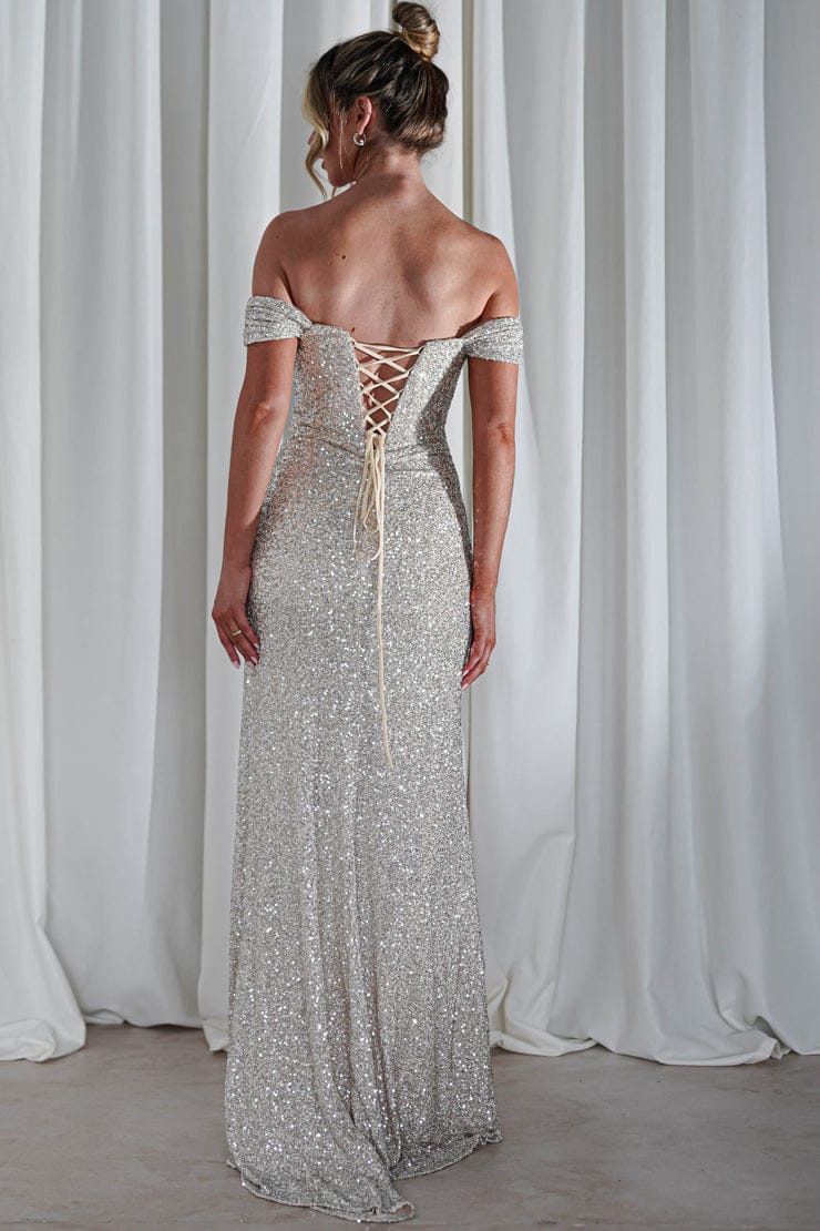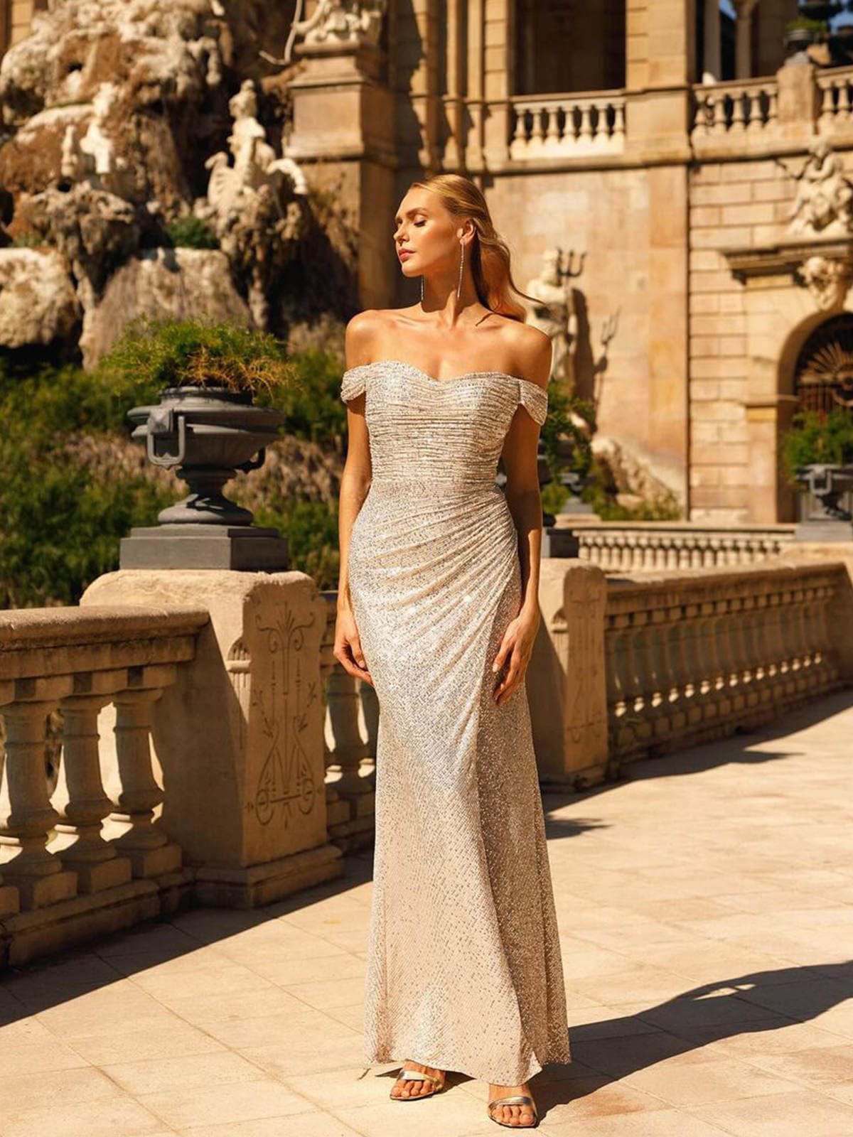 Confecionado em tecido totalmente bordado com lantejoulas, este modelo reflete a luz com um brilho intenso e sofisticado. O decote em coração com ombros descobertos valoriza o colo e os ombros, criando um visual feminino e sedutor. As mangas caídas proporcionam um toque romântico, enquanto o corpete ajustado com atilhos permite um encaixe perfeito e confortável.
