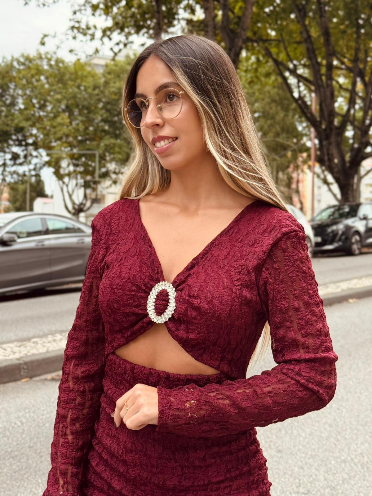 Este vestido curto em tecido rendado destaca-se pelo decote em V profundo e recorte frontal com argola decorativa, que valoriza a silhueta de forma subtil e feminina.