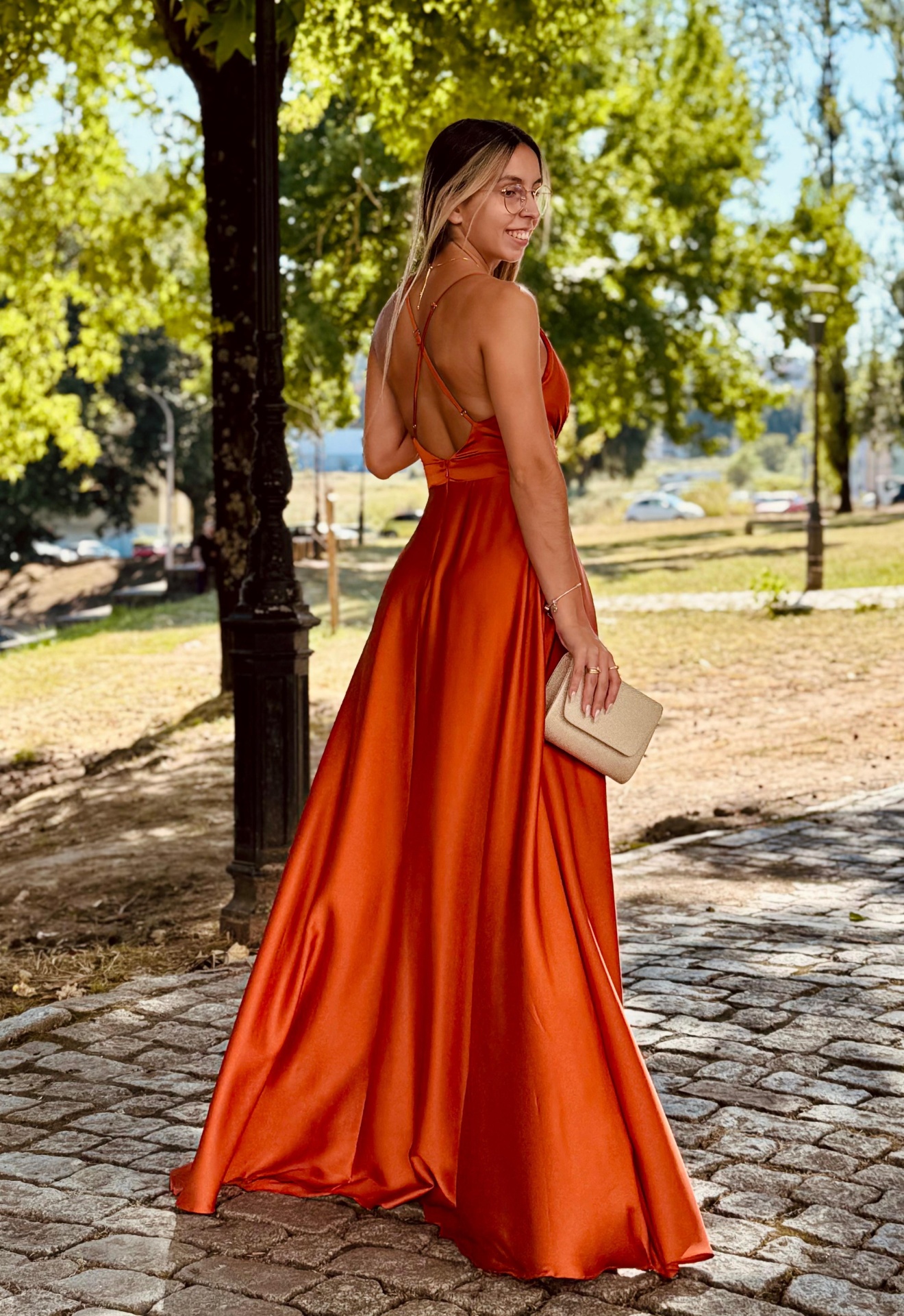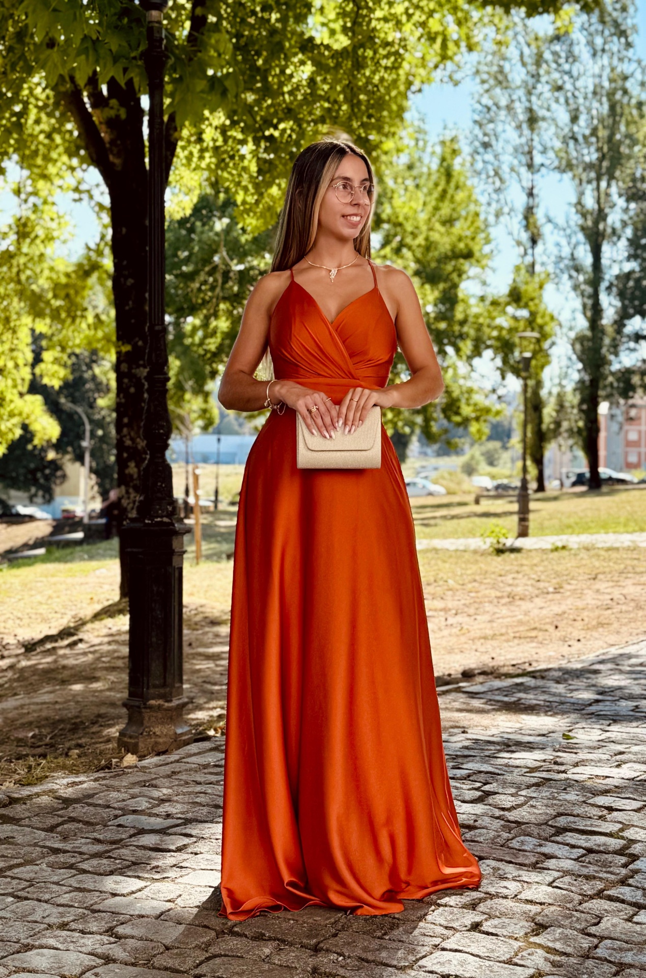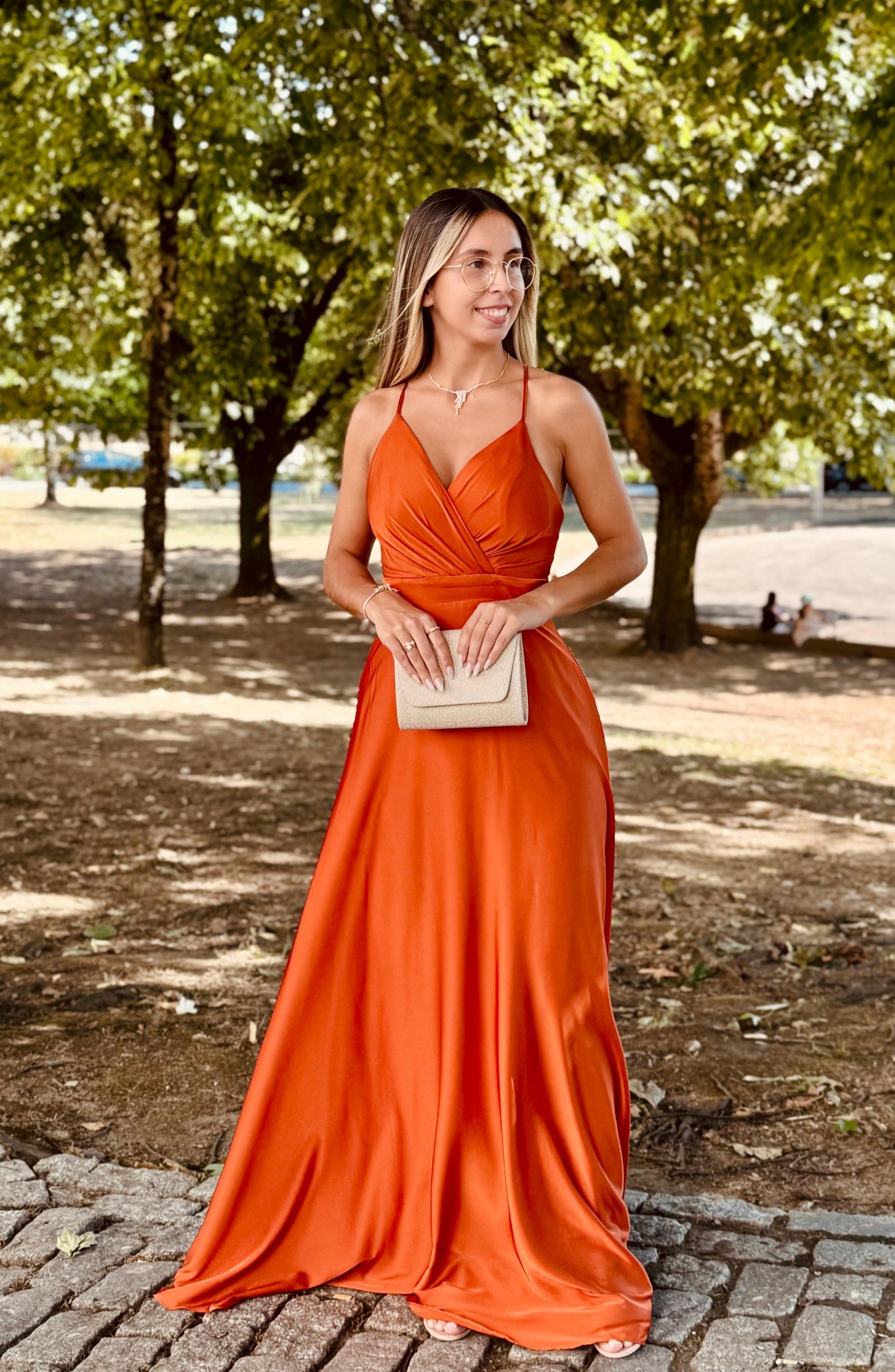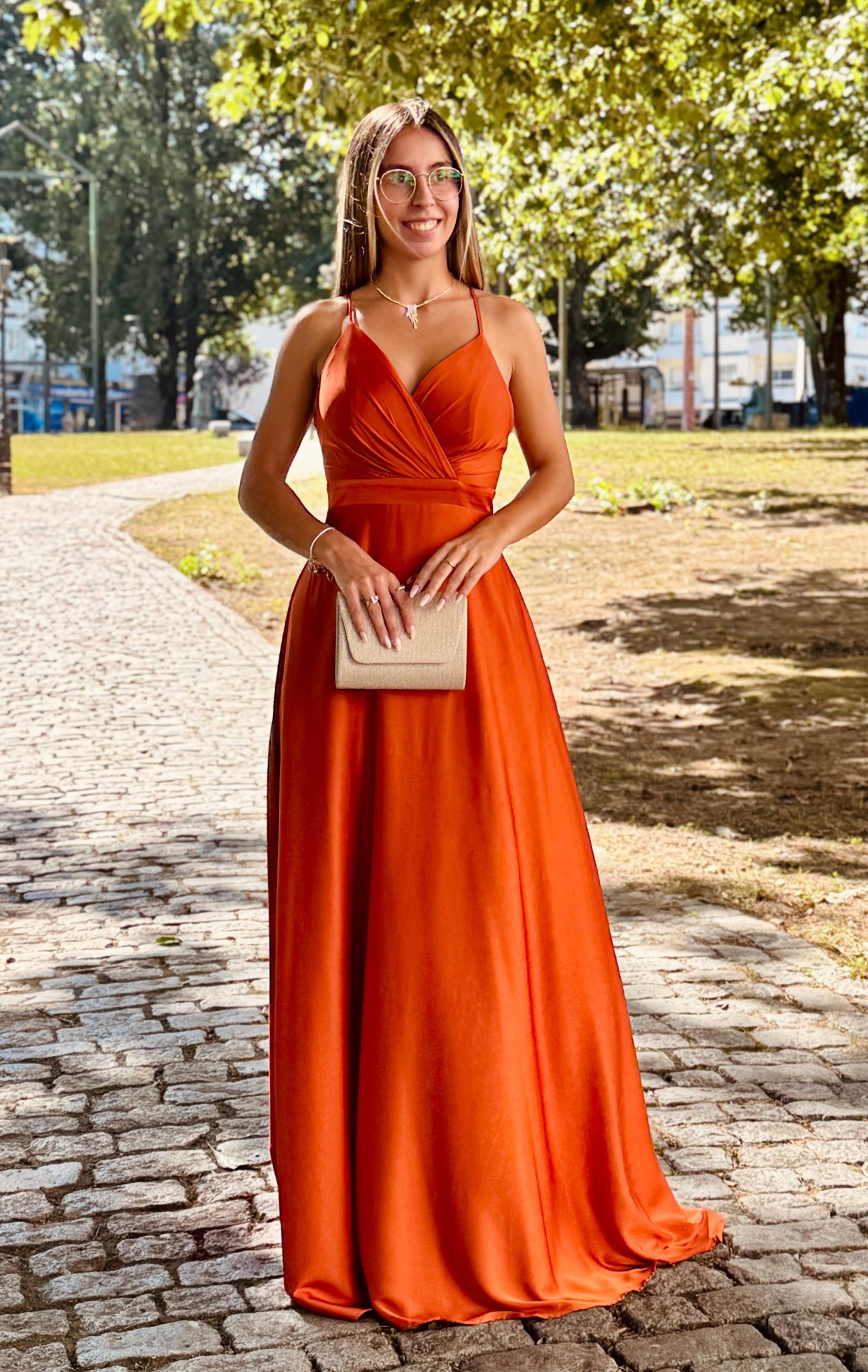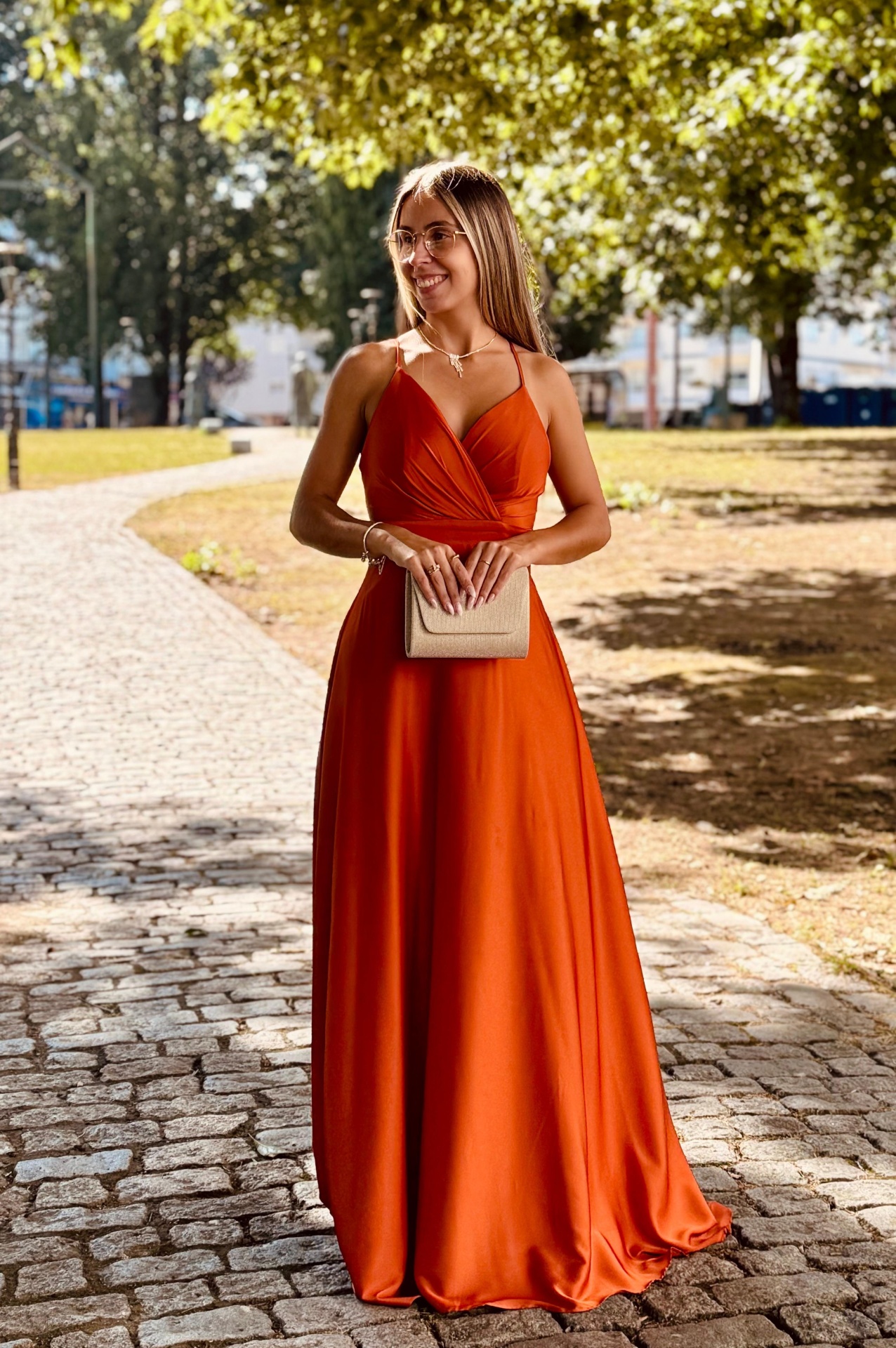 Deslumbre em qualquer ocasião especial com este vestido longo em cetim. Com um design sofisticado, destaca-se pelo decote transpassado que valoriza o busto e pelas alças finas cruzadas nas costas, conferindo um toque moderno e sensual. Possui copas embutidas para maior conforto e sustentação, além de um caimento fluído que garante movimento e elegância. Disponível nos tamanhos XS, S, M e L.