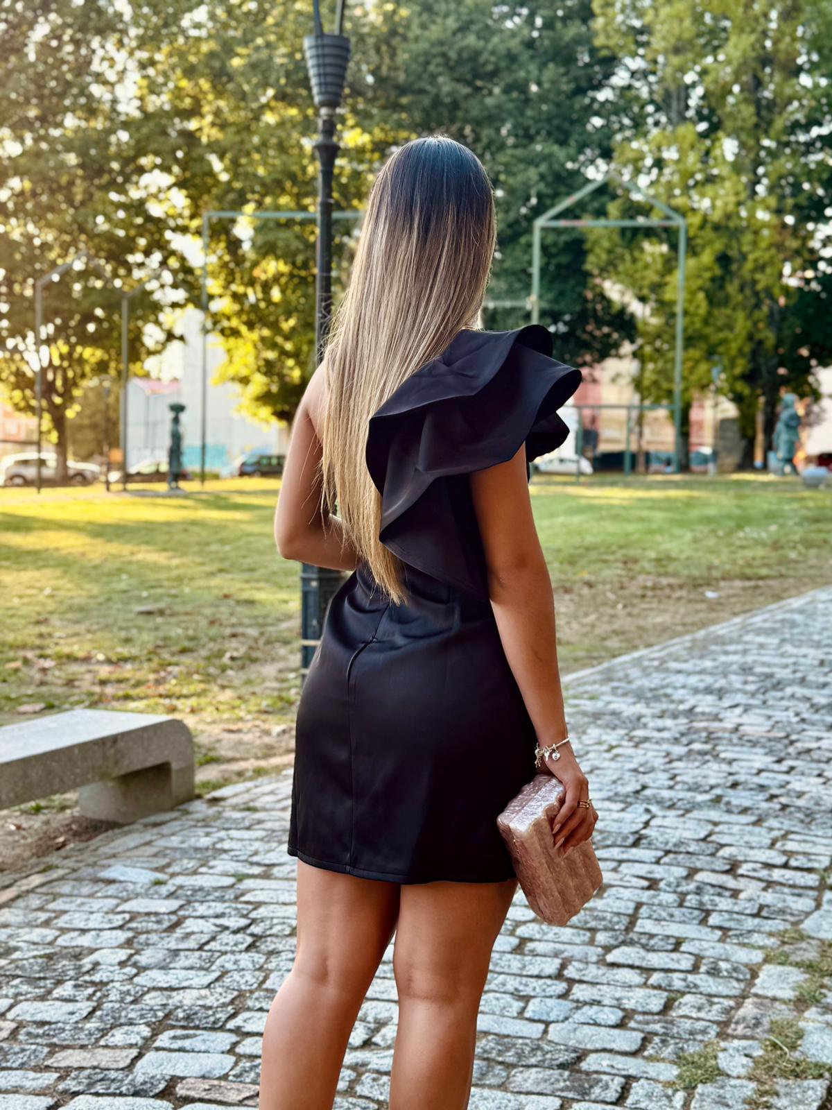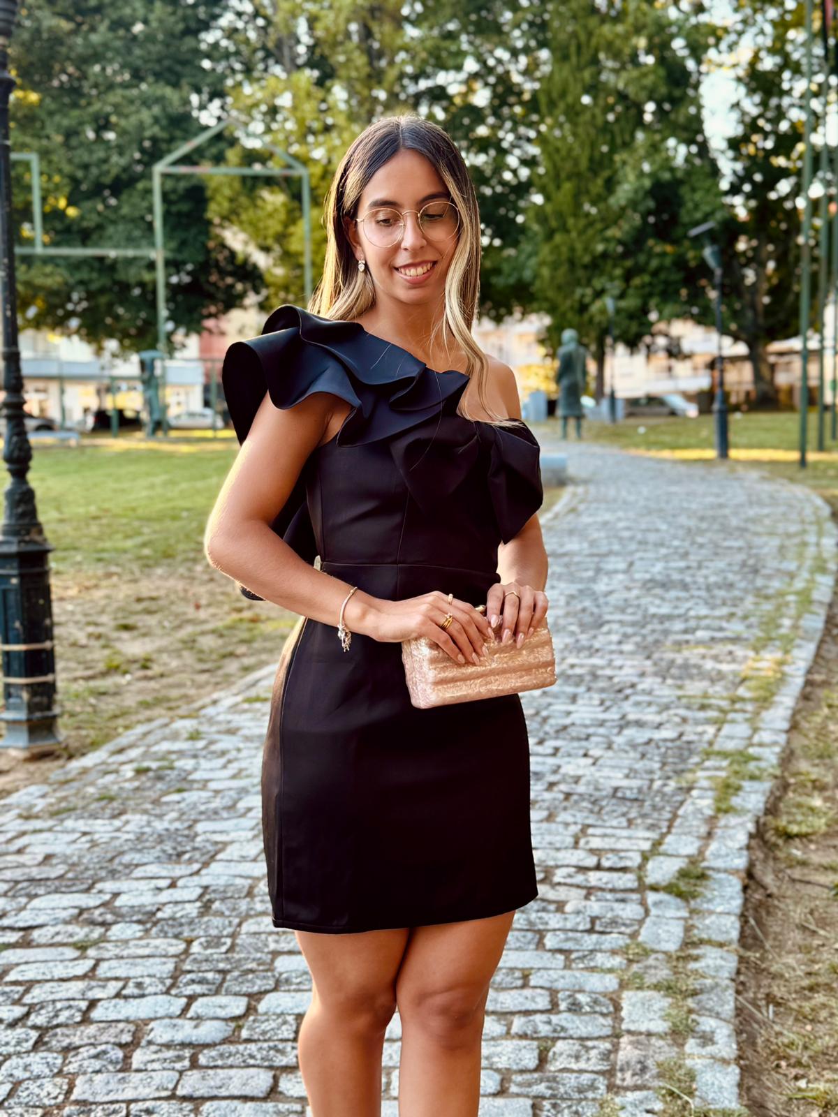 Um vestido curto elegante e cheio de charme, ideal para ocasiões especiais.