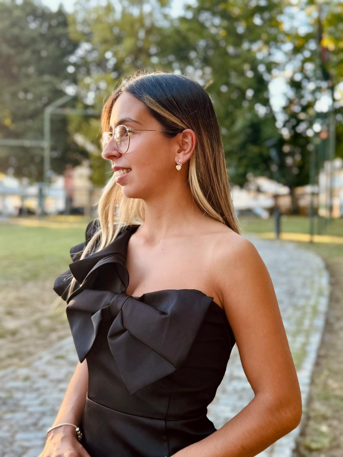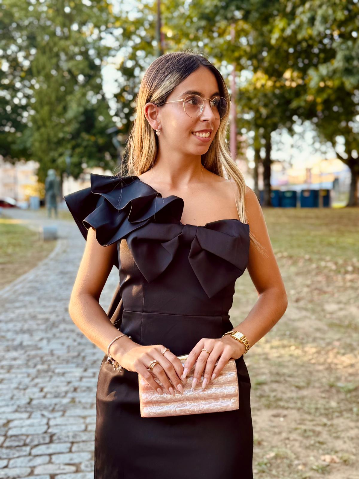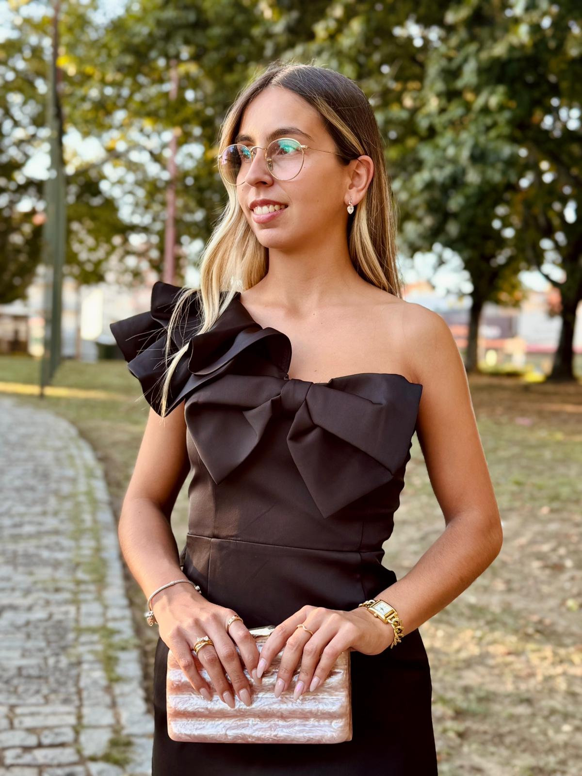 O modelo apresenta um ombro descoberto e um laço na parte frontal, que se prolonga em dois folhos assimétricos à volta do decote, criando um visual sofisticado e feminino.