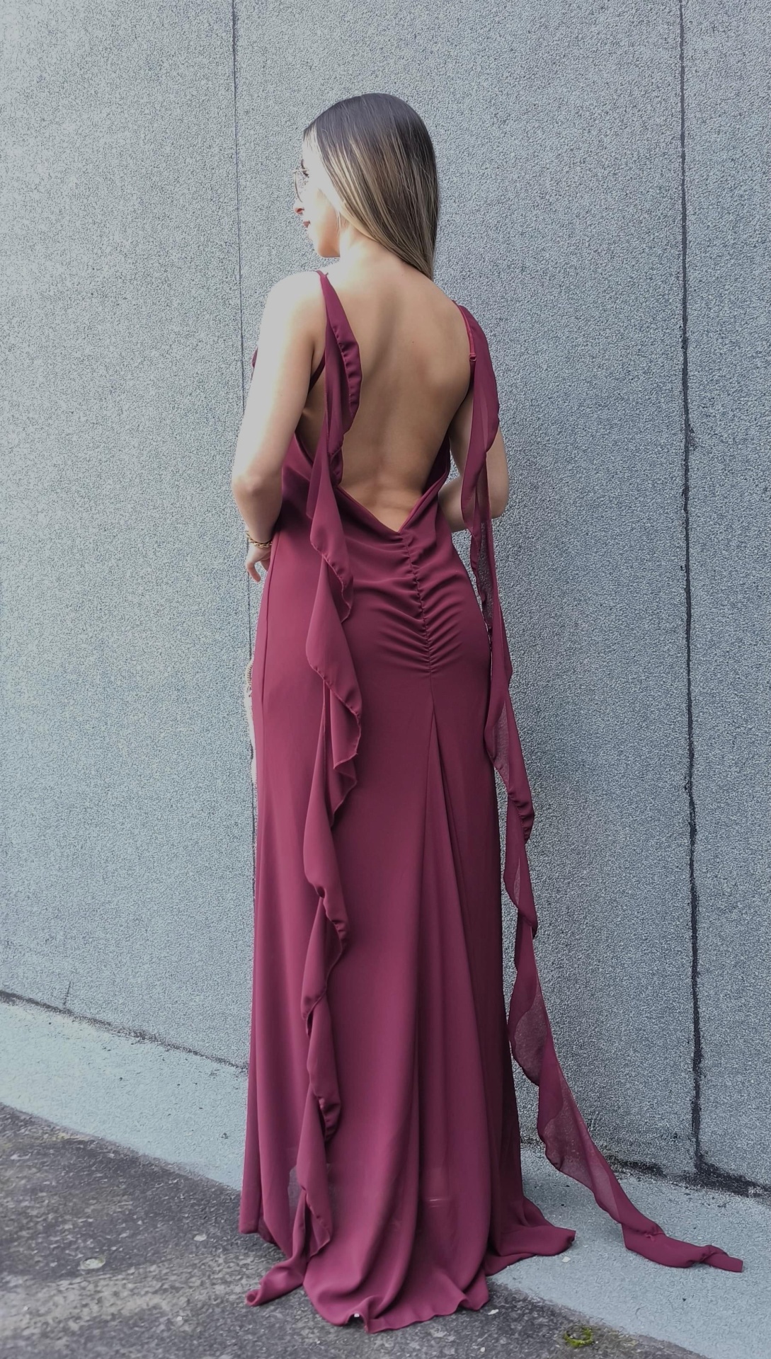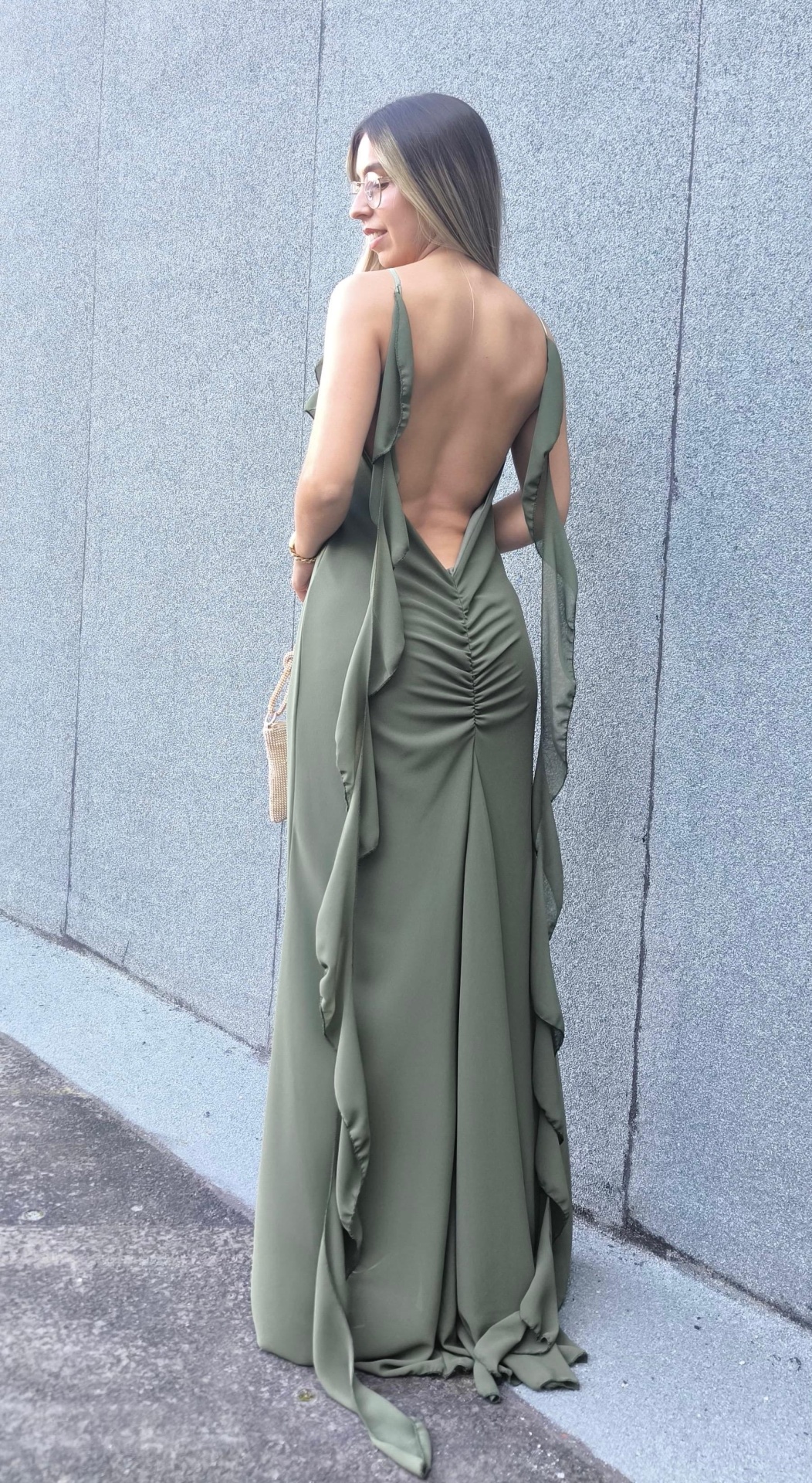 O vestido tem alças finas ajustáveis e decote em “V” com folhos o que oferece um toque romântico e sofisticado. A parte de trás é marcada por um elegante decote profundo com franzido central, realçando a silhueta de forma súbtil e feminina.
