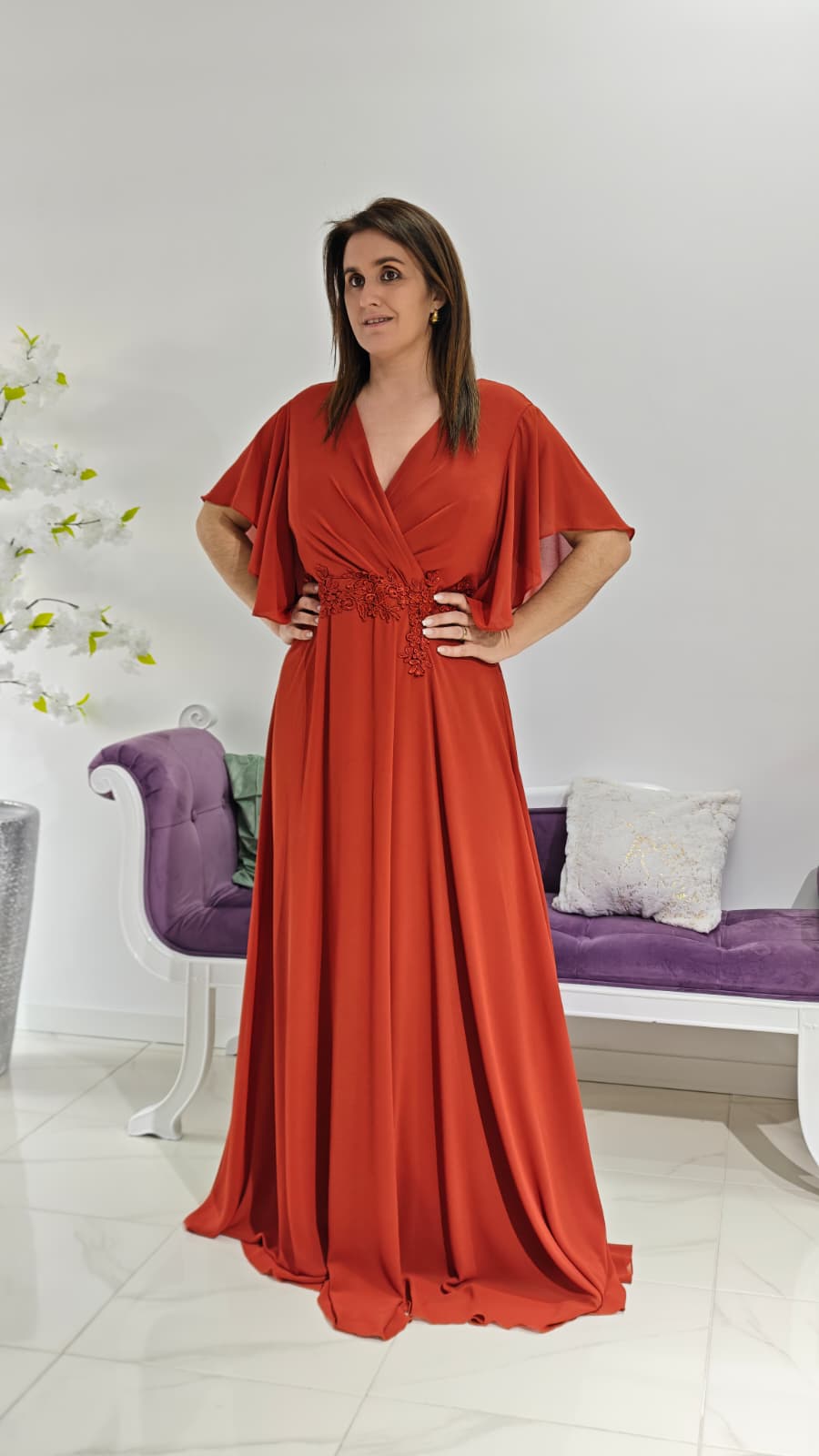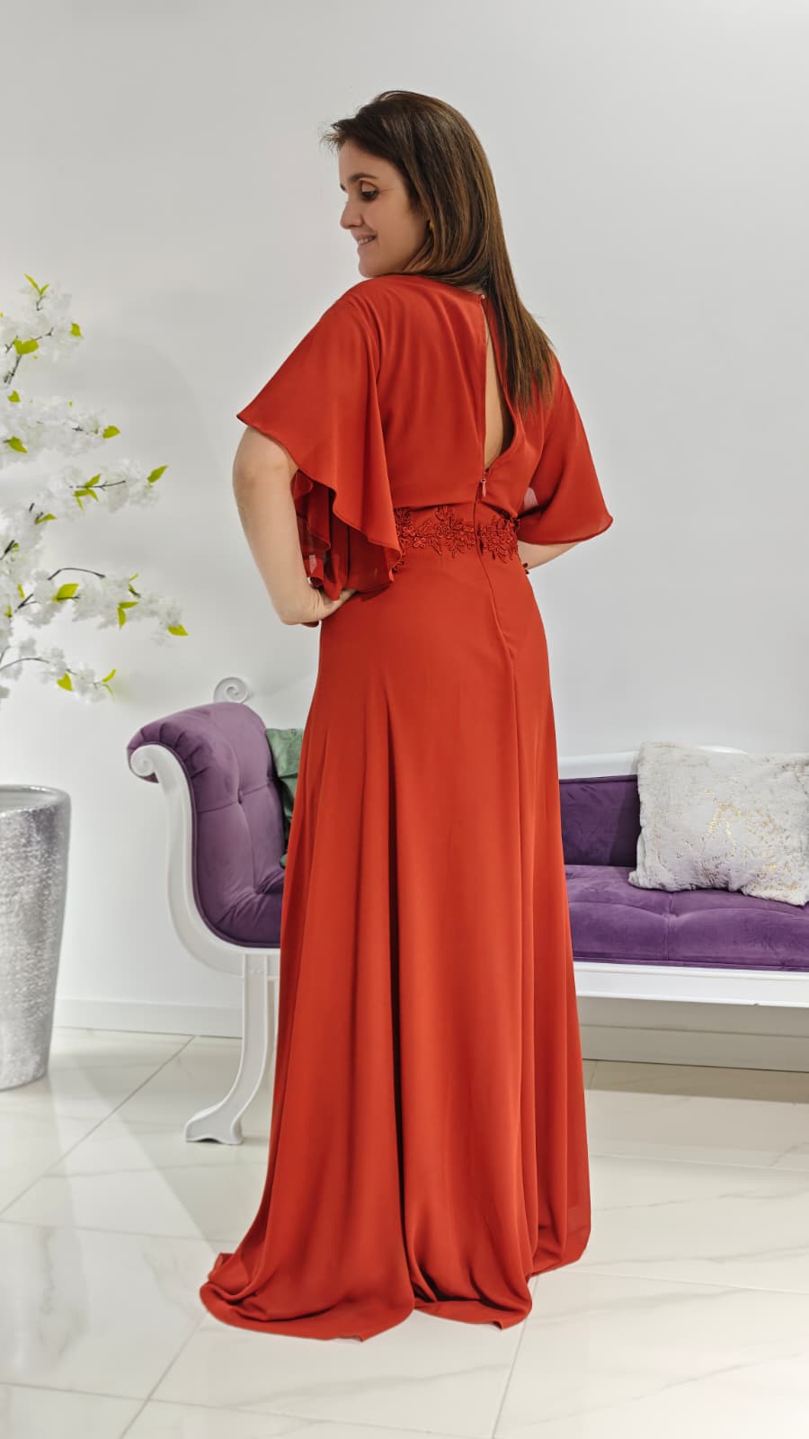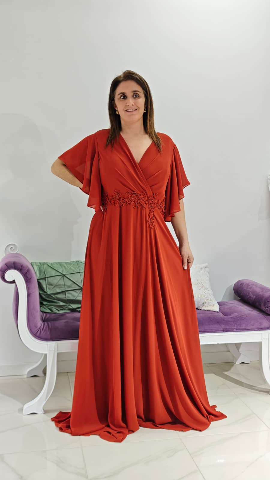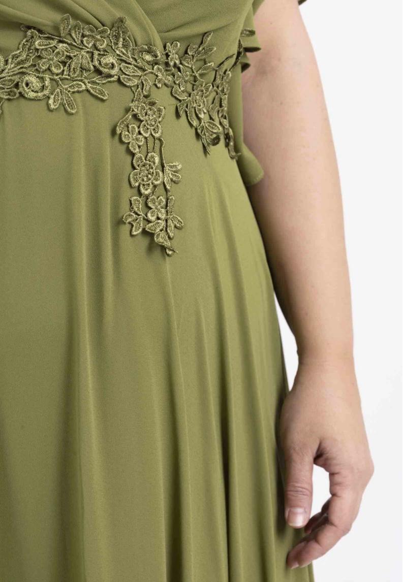 As mangas curtas amplas proporcionam leveza e conforto, enquanto a cintura é adornada com detalhes em renda, garantindo um caimento impecável e um toque romântico à peça. O tecido fluído confere movimento e elegância, tornando este vestido ideal para eventos como casamentos, formaturas e eventos. Tem fecho invisível nas costas.