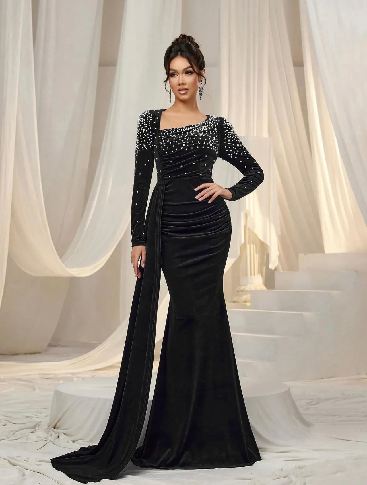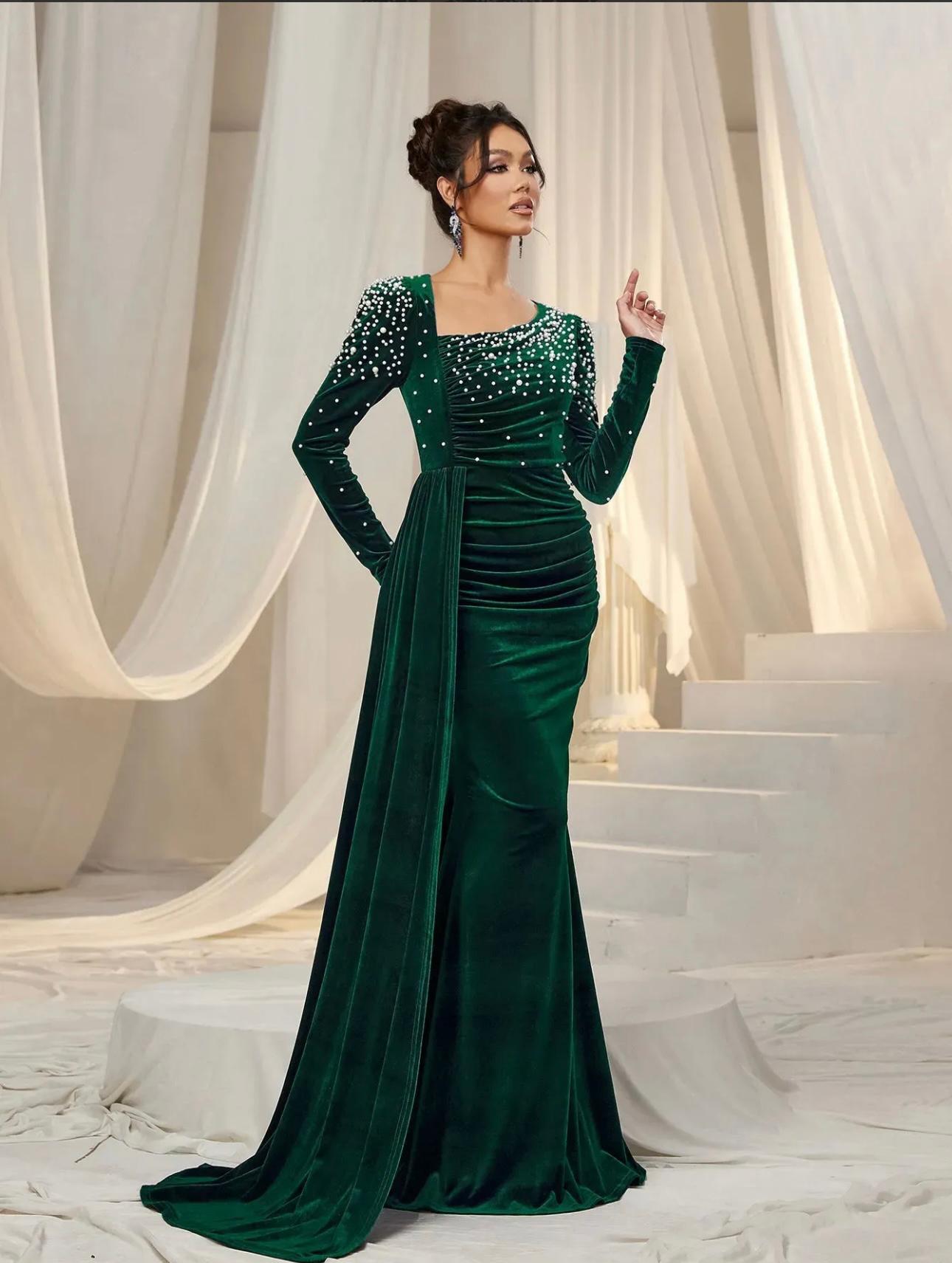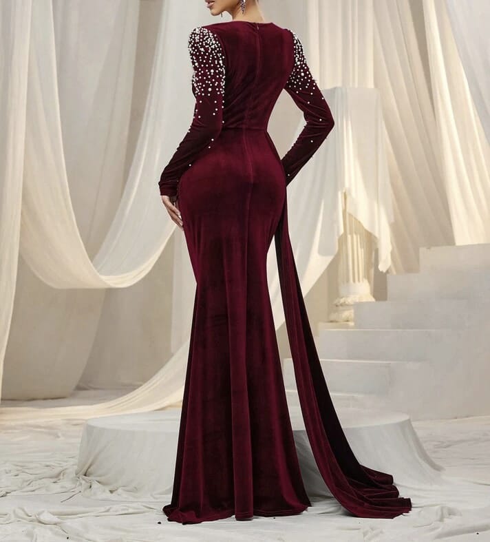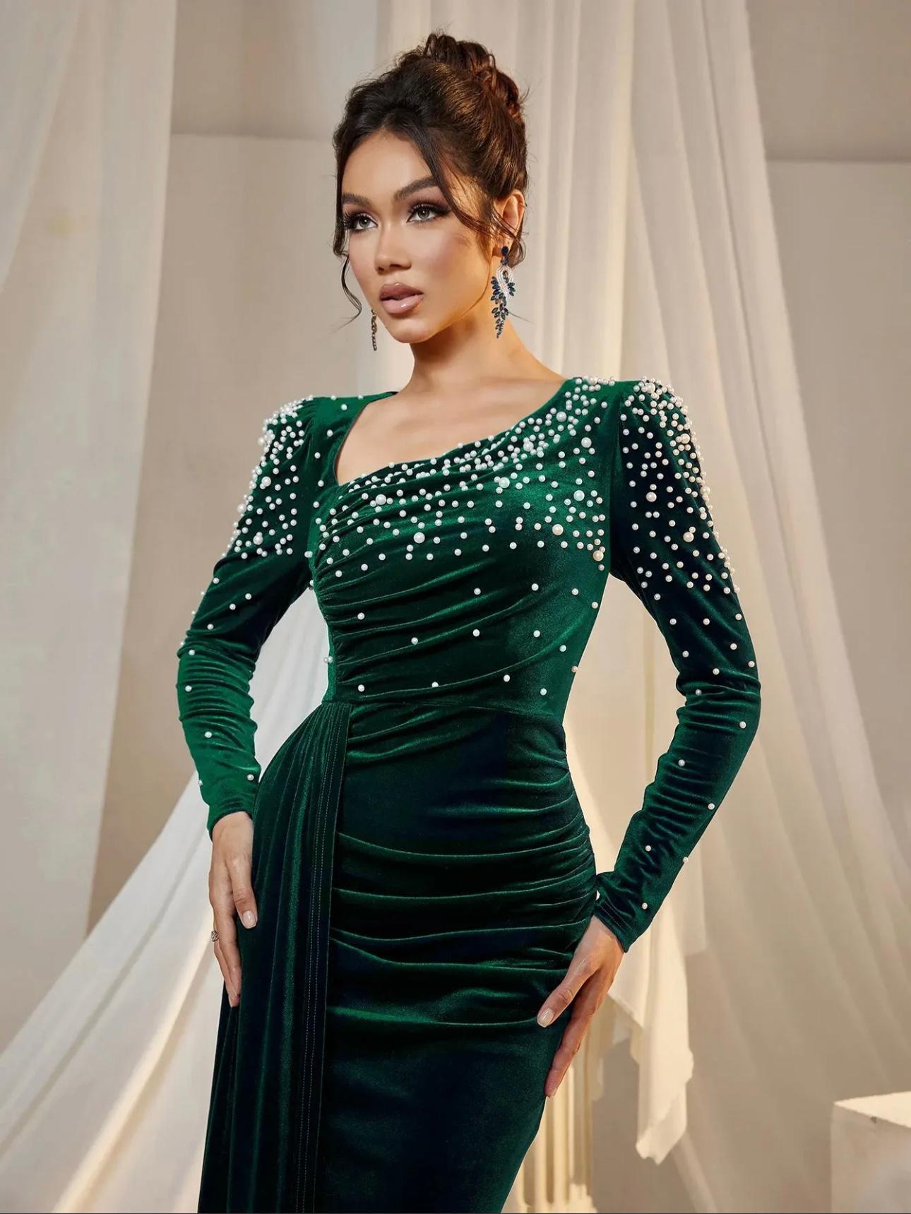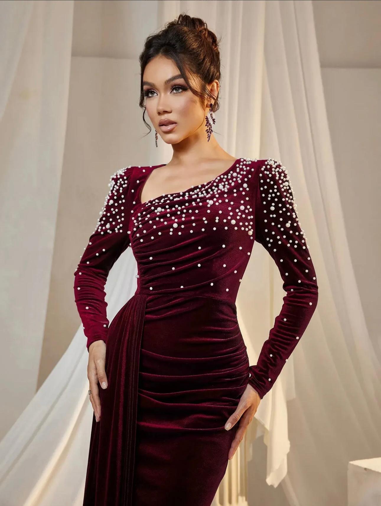 Destaque-se com o nosso vestido de veludo com pérolas. Este vestido elegante apresenta uma silhueta ajustada que realça as suas curvas, enquanto o design drapeado adiciona um toque de sofisticação. O vestido tem mangas compridas com pérolas criando um visual real e atemporal.