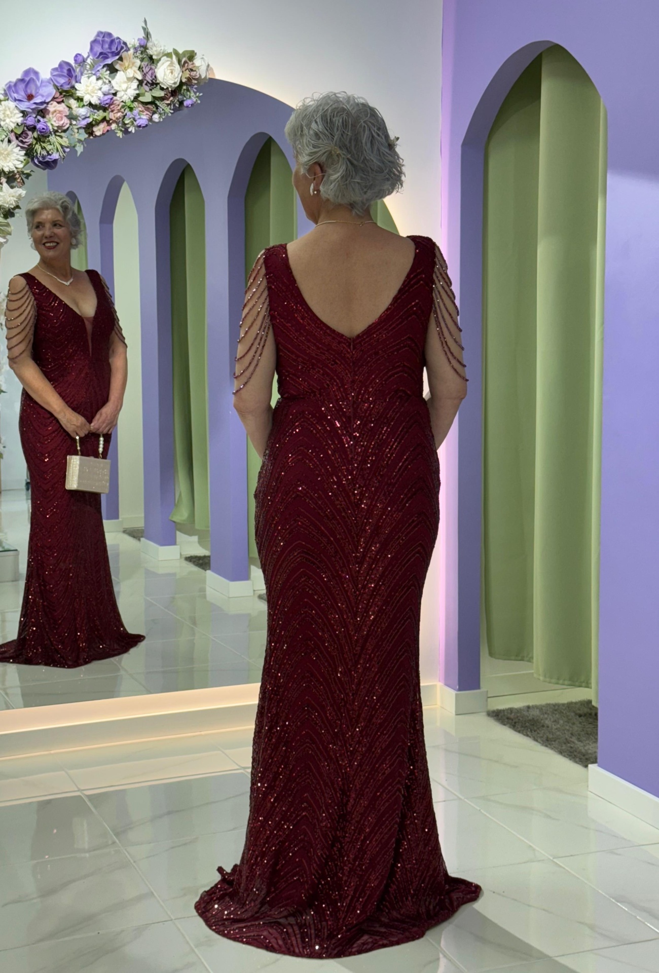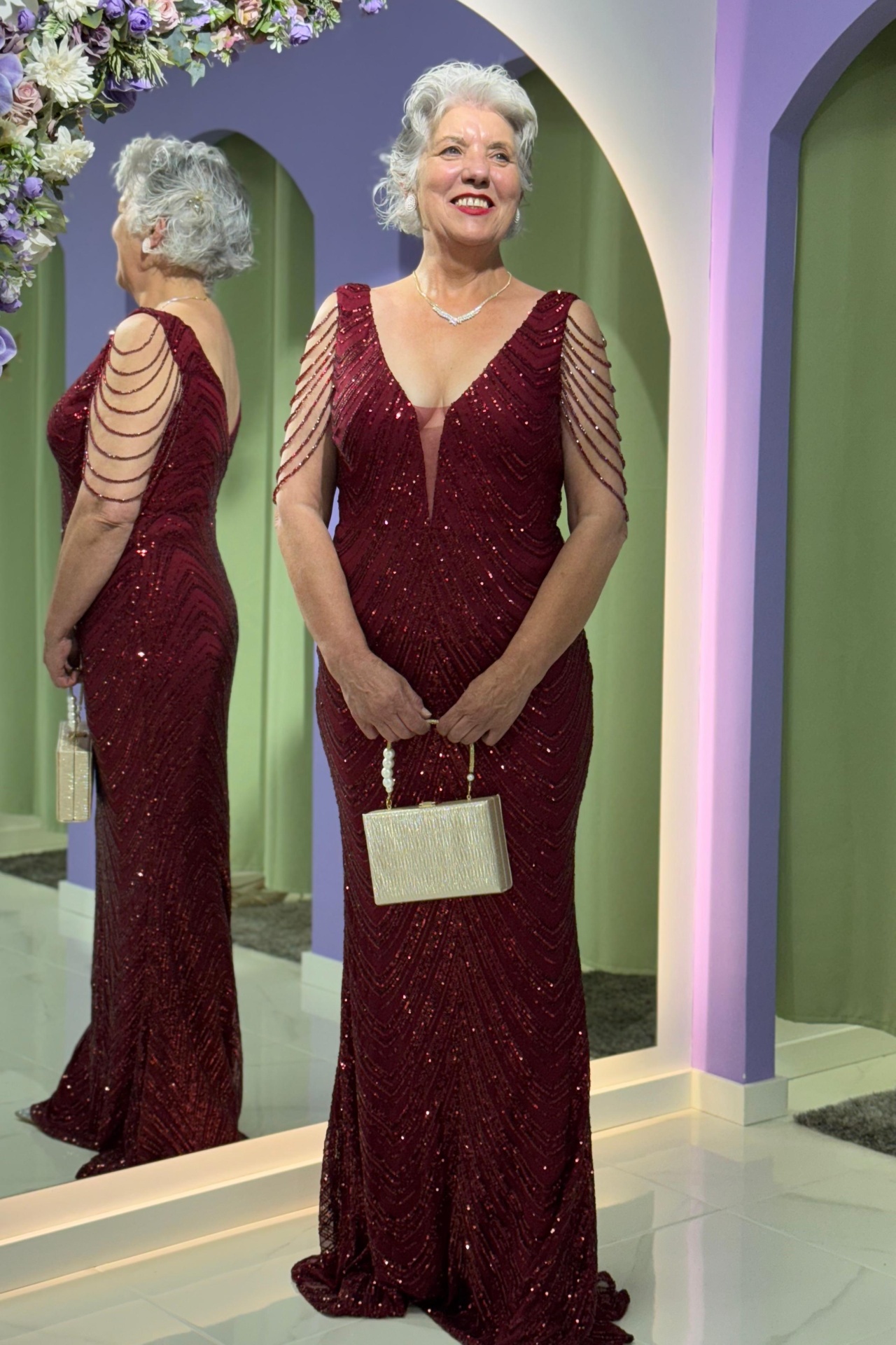 Com um corte que abraça as curvas com elegância, este modelo em lantejoulas destaca-se pelo decote em V profundo com tule e pela manga de missangas delicadas, que conferem leveza e sofisticação ao visual.