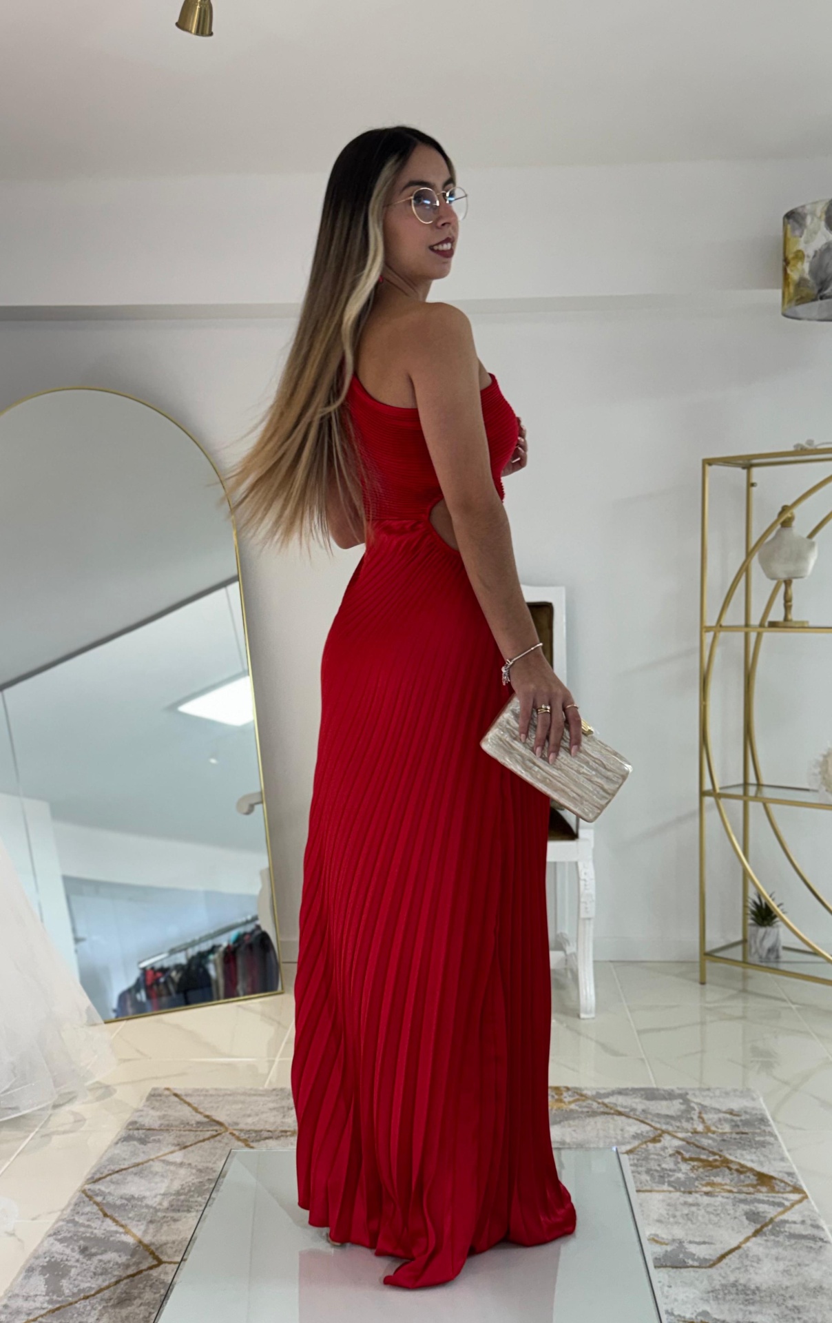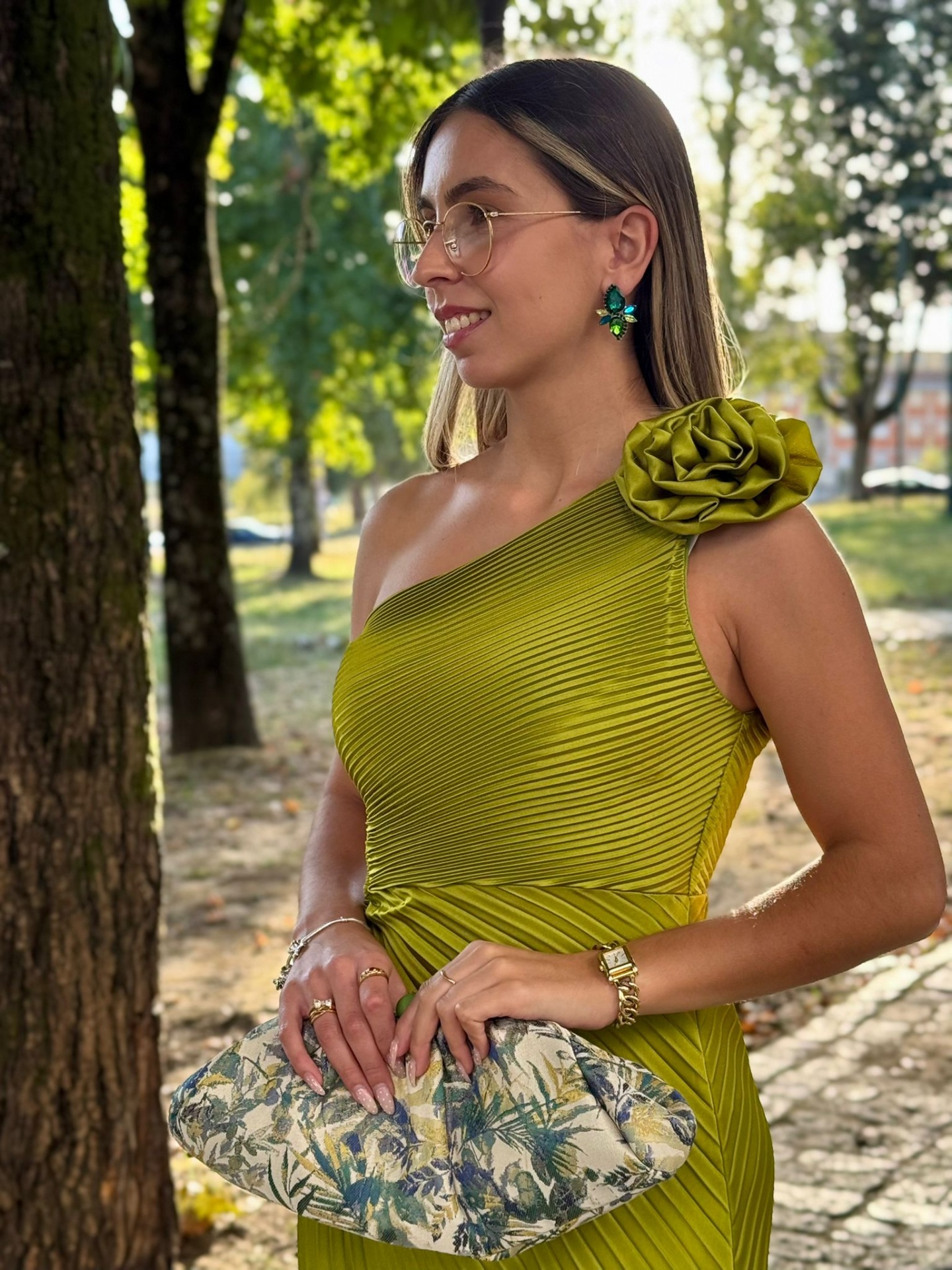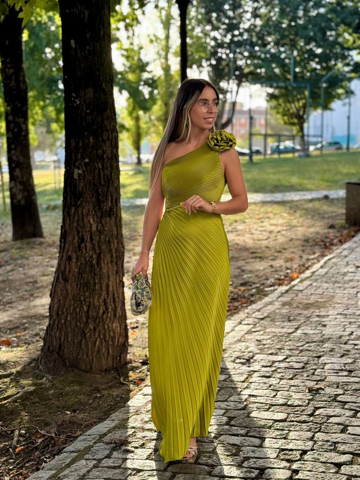 Confecionado em tecido plissado acetinado, o modelo oferece movimento e fluidez a cada passo. O detalhe da flor removível no ombro permite personalizar o look conforme a ocasião — para um toque mais clássico ou mais minimalista.