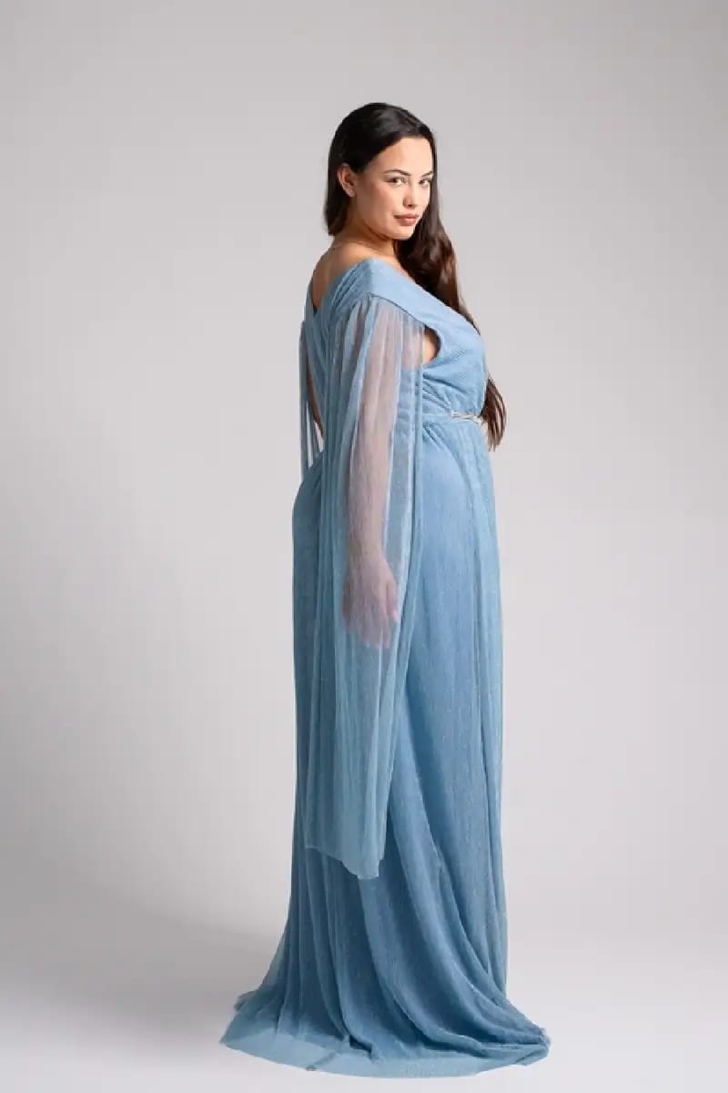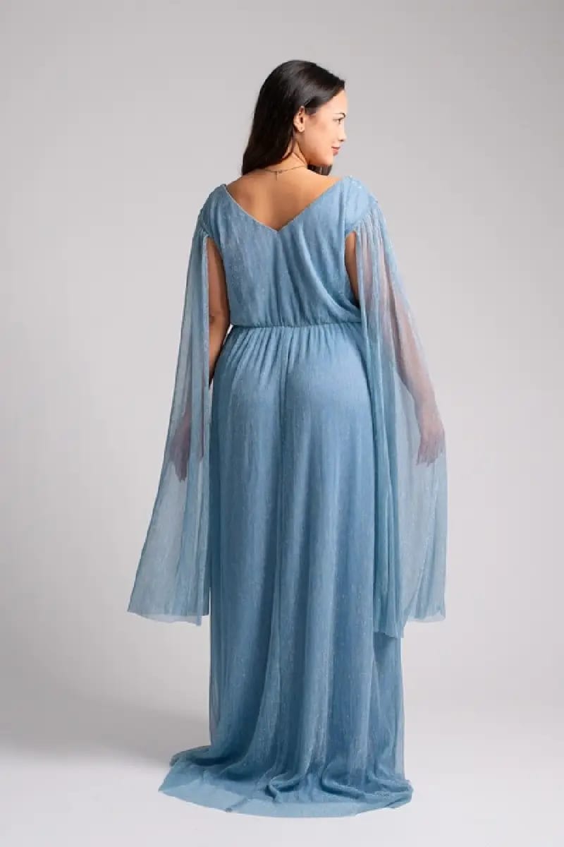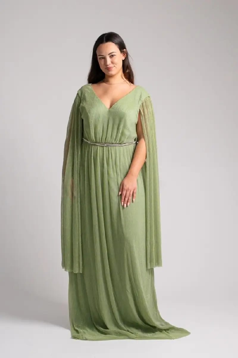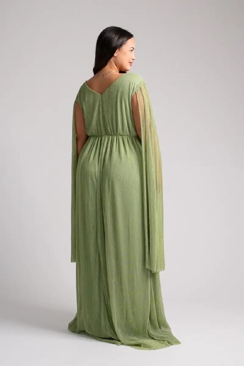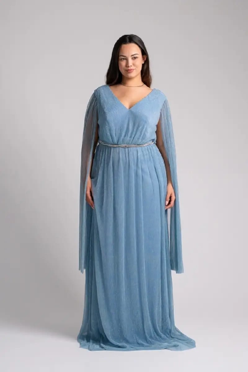 Vestido longo e fluído da linha XLSize, pensado para quem procura elegância e conforto em ocasiões especiais. Confecionado num tecido leve e ligeiramente brilhante, apresenta decote em V que alonga a silhueta, cintura marcada com cinto delicado e saia de caimento suave. O grande destaque está nas mangas-capa, que conferem movimento e um toque sofisticado ao look, evocando inspiração romântica e contemporânea ao mesmo tempo.