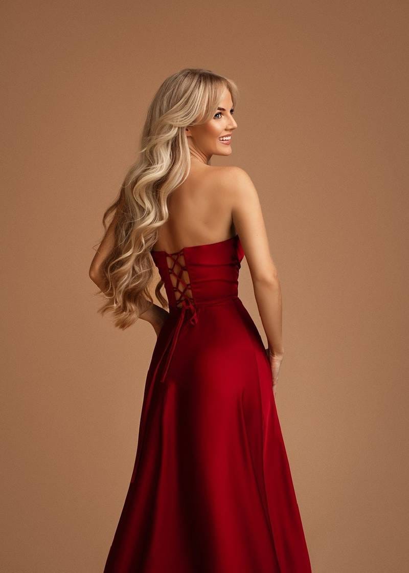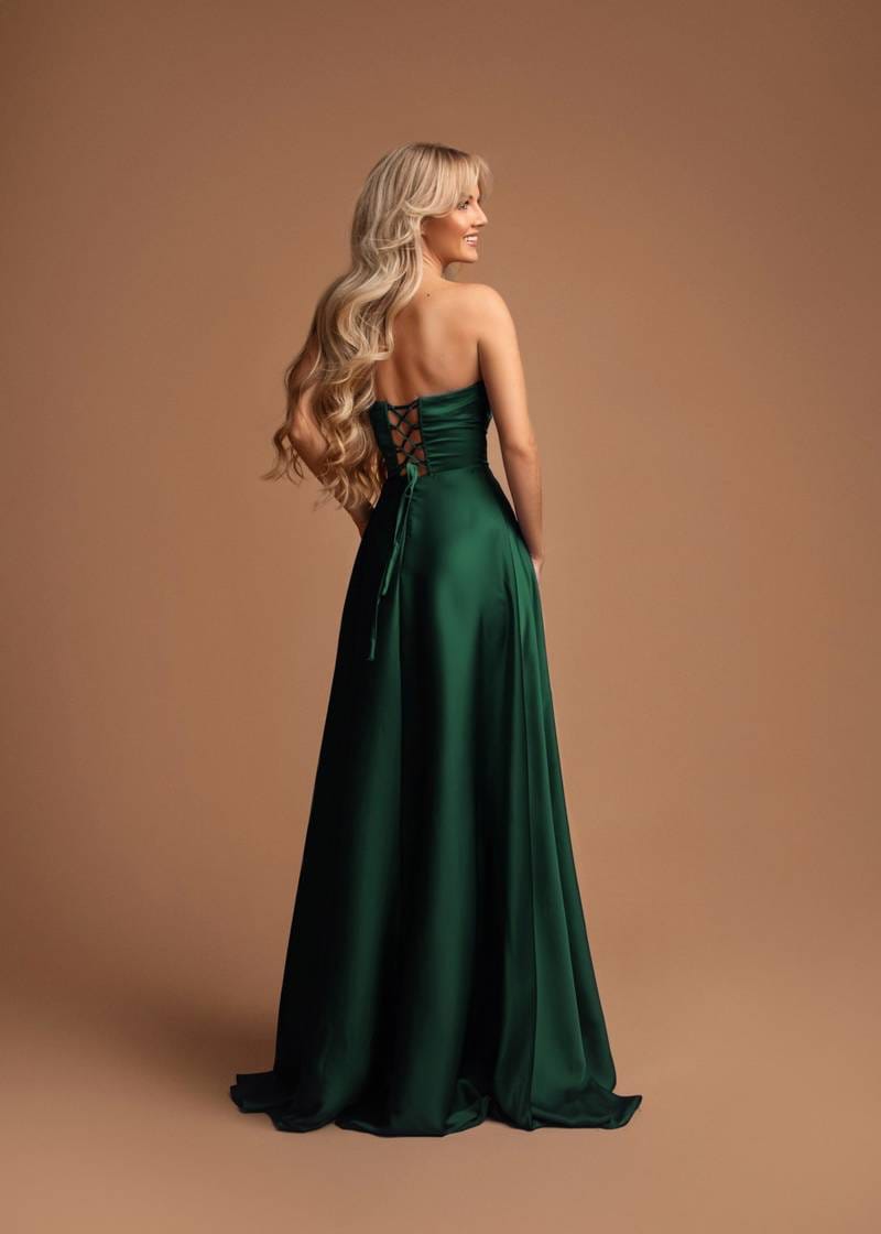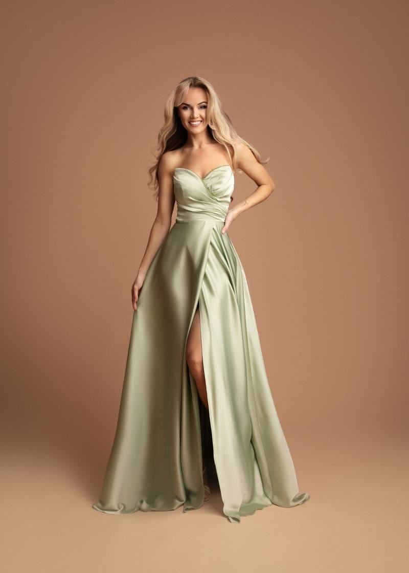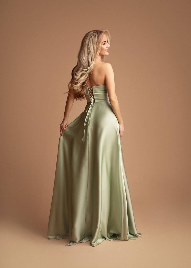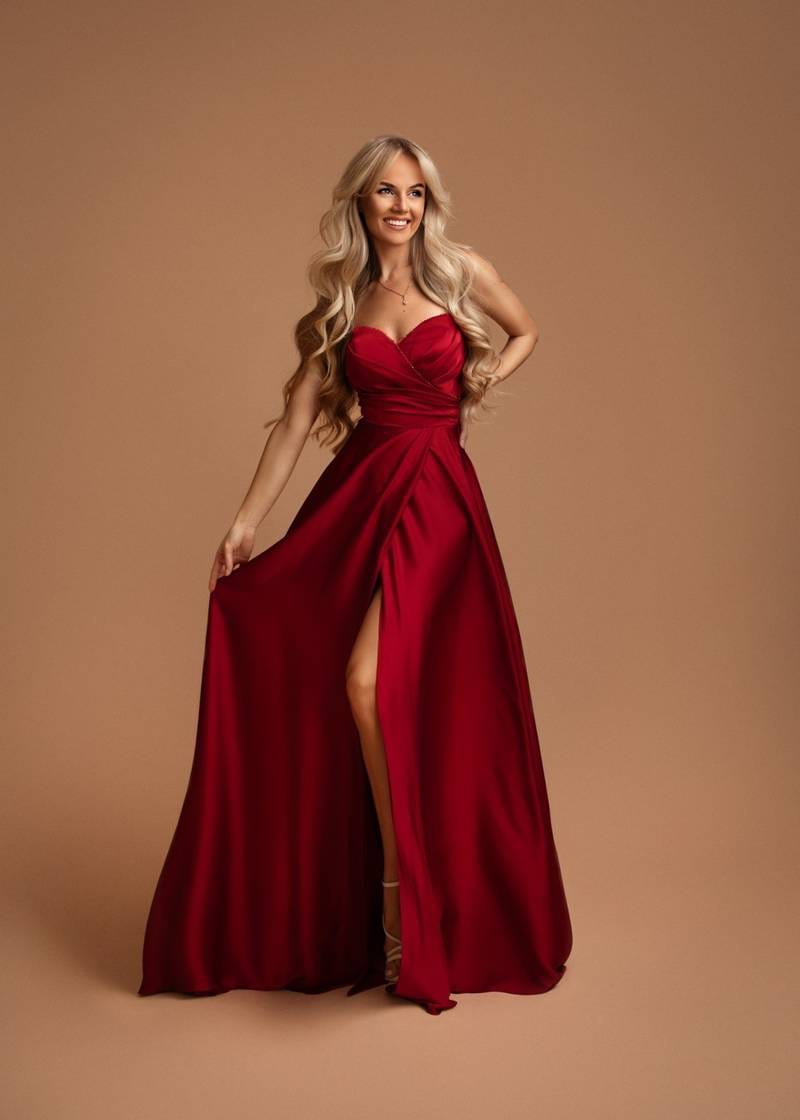 O corpete estruturado com drapeado define a silhueta de forma harmoniosa, enquanto a saia fluida com abertura frontal proporciona movimento e um toque de sensualidade.