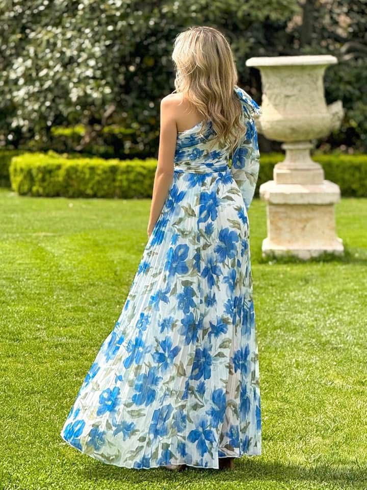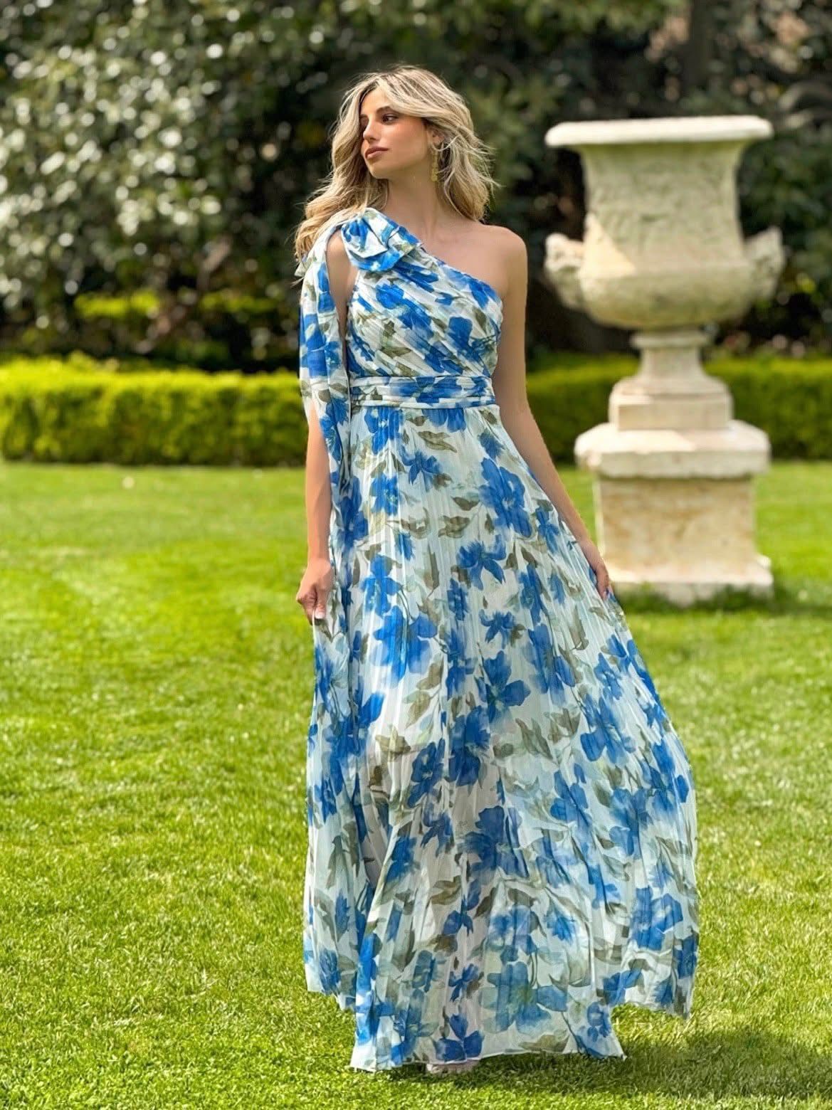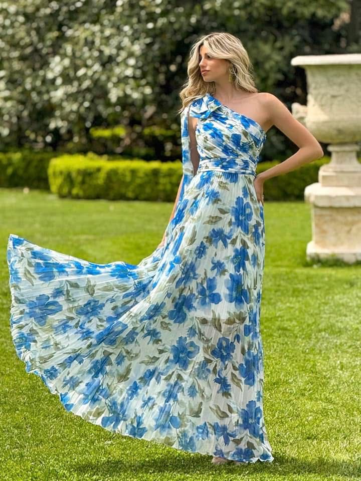 Eleve a sua elegância em qualquer evento especial com este deslumbrante vestido de cerimónia de silhueta fluida e romântica. Confecionado num tecido leve e plissado, este modelo destaca-se pelo seu estampado floral em tons de azul safira e verde água sobre um fundo off-white, evocando a frescura e a sofisticação de um jardim em flor.