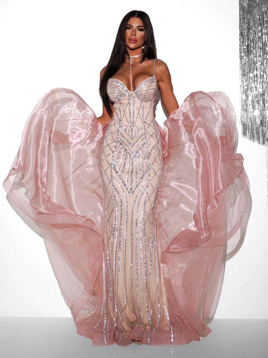 Vestido de cerimónia de cortar a respiração, pensado para quem procura um look verdadeiramente marcante e luxuoso. Com uma silhueta ajustada que acompanha delicadamente as curvas do corpo, este modelo destaca-se pelo seu trabalho minucioso em pedraria, disposto em padrões geométricos verticais que alongam a figura e criam um efeito visual elegante e sofisticado.