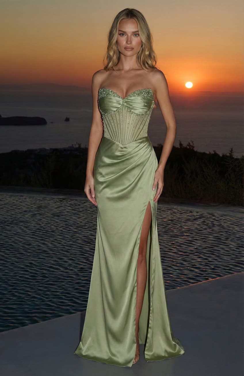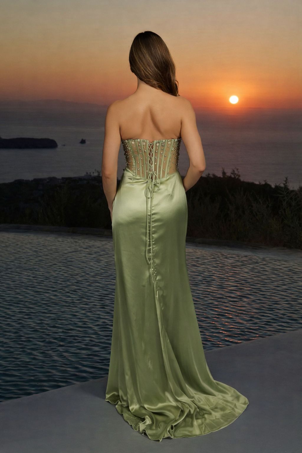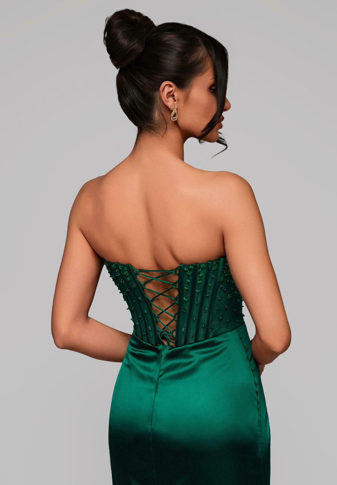 Nas costas, o fecho em atilhos permite um ajuste perfeito ao corpo, garantindo conforto e suporte. Um vestido pensado para convidadas, madrinhas ou eventos de gala, que alia estrutura, brilho subtil e fluidez.