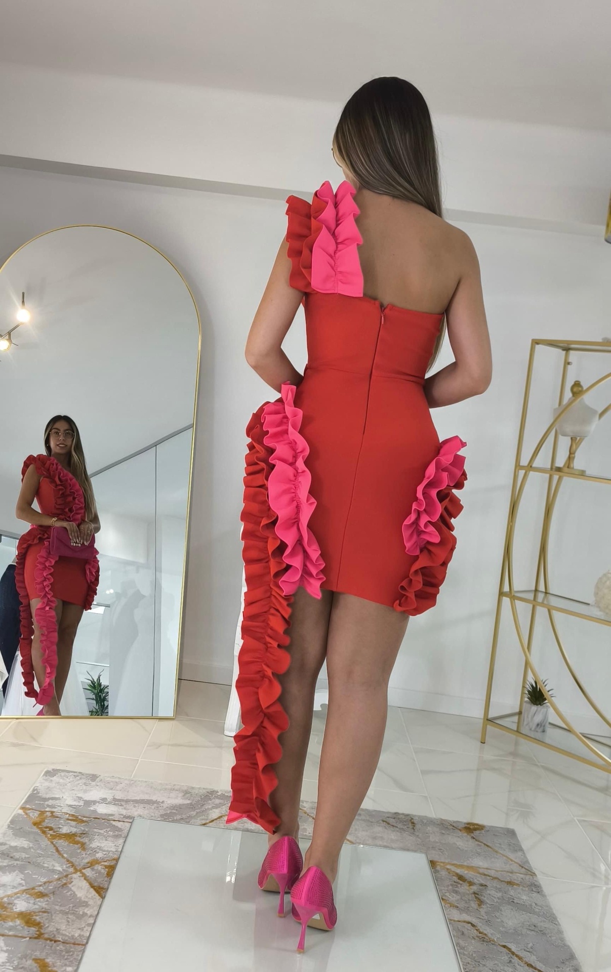 Vestido com impacto pensado para mulheres que se querem destacar em qualquer evento. O design assimétrico em vermelho intenso destaca-se pelos volumosos volantes que percorrem toda a peça, criando um visual moderno, ousado e cheio de movimento. O corte curto ajustado valoriza a silhueta, enquanto o detalhe de um ombro só confere sofisticação e irreverência.