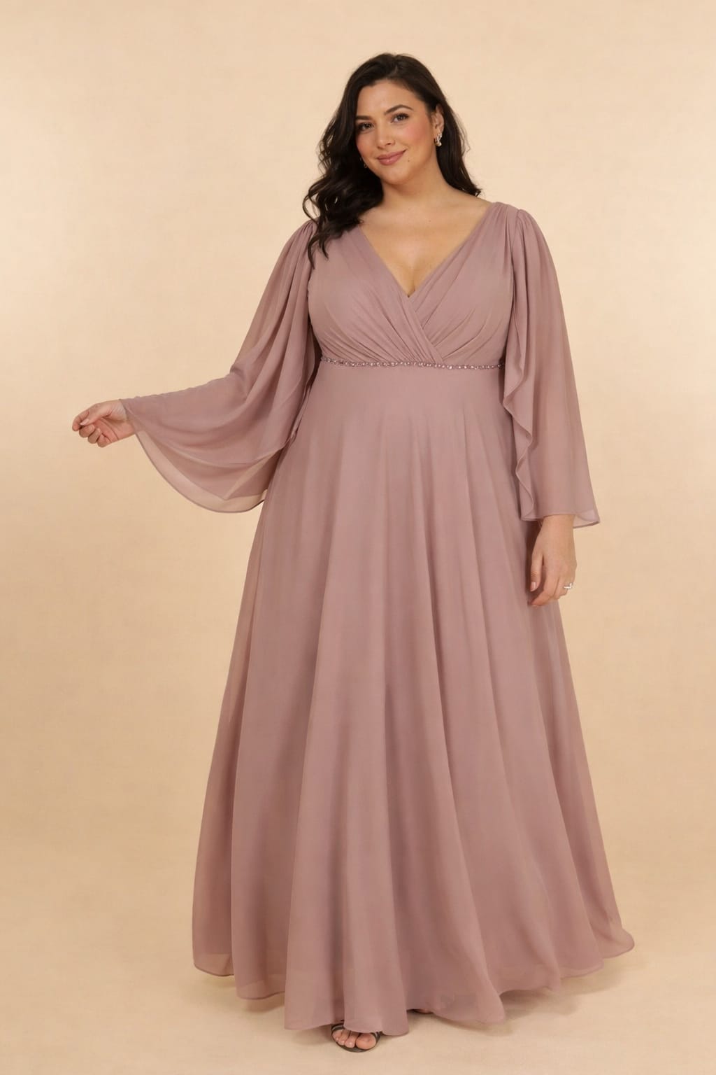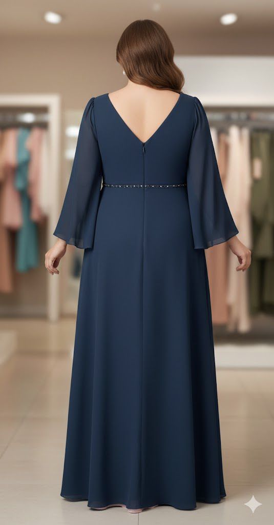 O design apresenta um decote em V transpassado que valoriza o colo de forma subtil, complementado por espetaculares mangas de sino fluídas em chiffon, que conferem movimento. Na cintura, uma delicada aplicação de pedraria fina cria um ponto de luz sofisticado, definindo a silhueta antes de dar lugar a uma saia longa de corte evasé, que flui suavemente a cada passo.