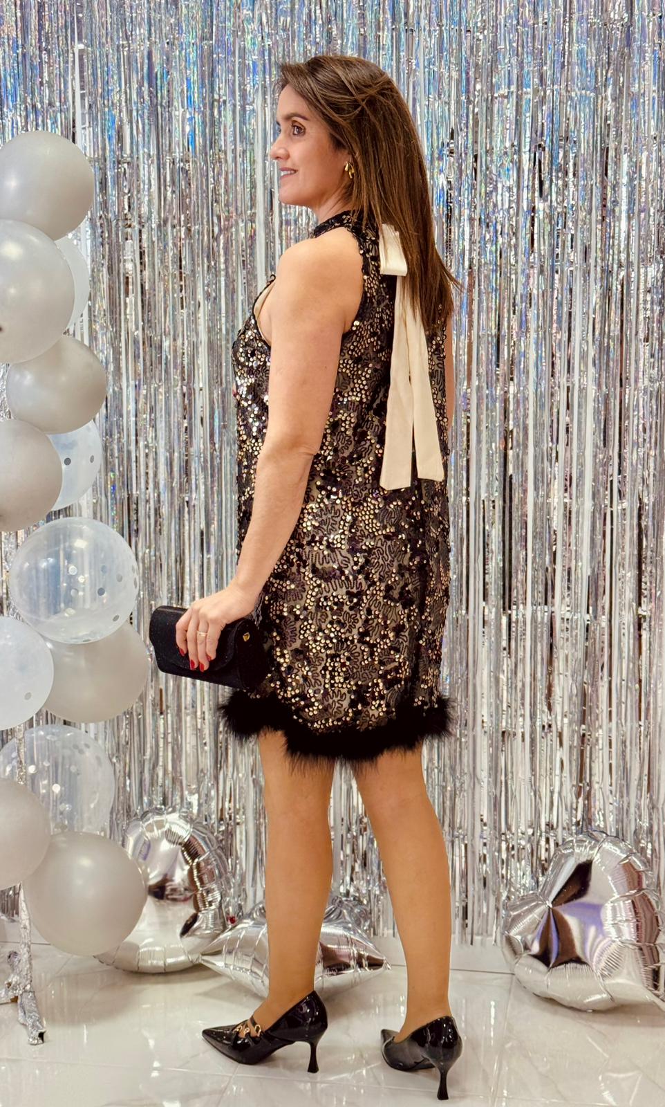 O acabamento nas costas inclui um elegante laço em cetim, que acrescenta feminilidade e charme ao modelo. O tecido é confortável e tem ótimo caimento, permitindo liberdade de movimento sem comprometer o brilho.