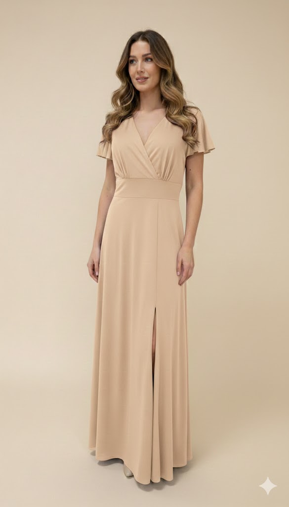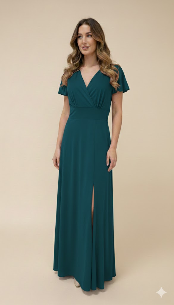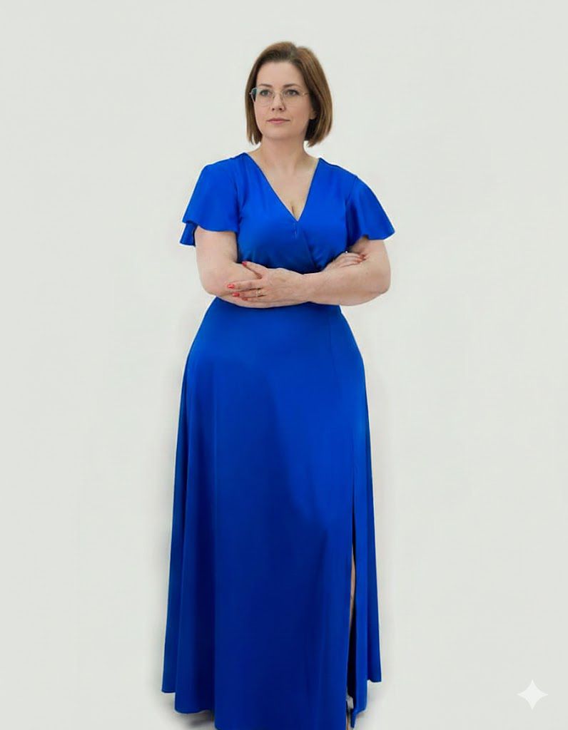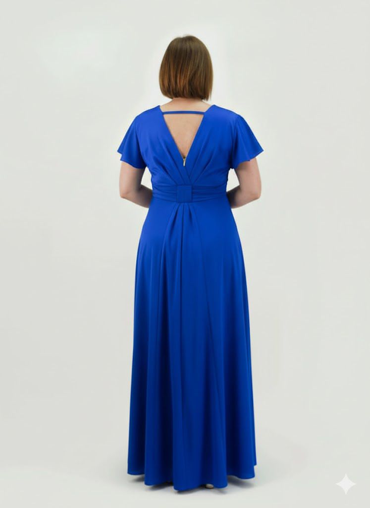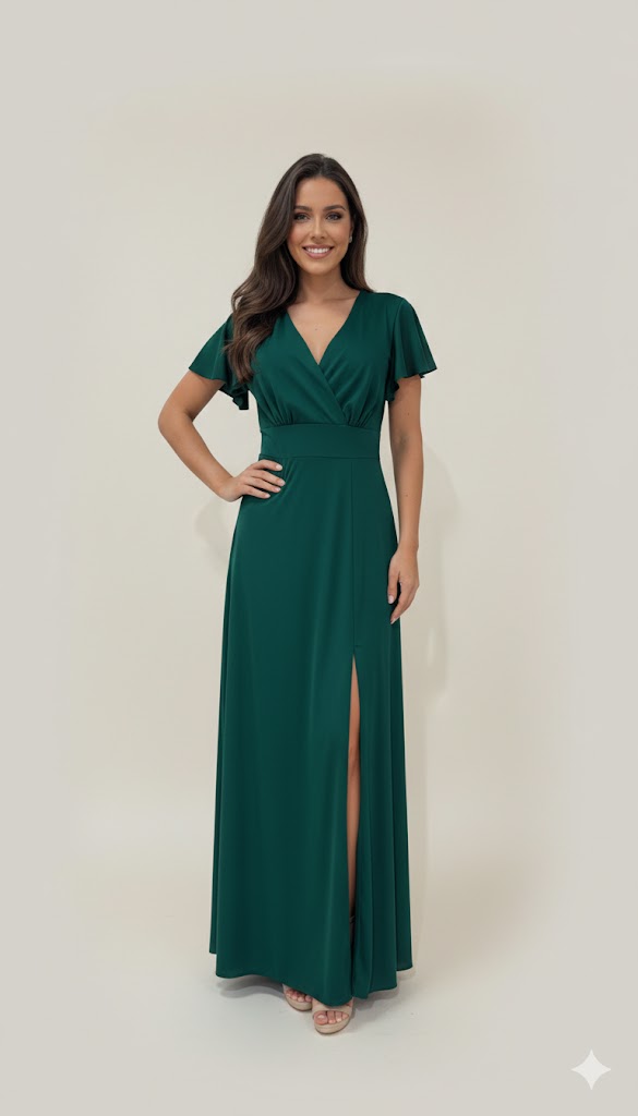 A saia longa e evasê cai de forma leve e fluída, alongando a silhueta, e inclui uma racha discreta que acrescenta sofisticação e liberdade de movimentos. Nas costas, o decote em V complementa o design, criando um efeito elegante e equilibrado.