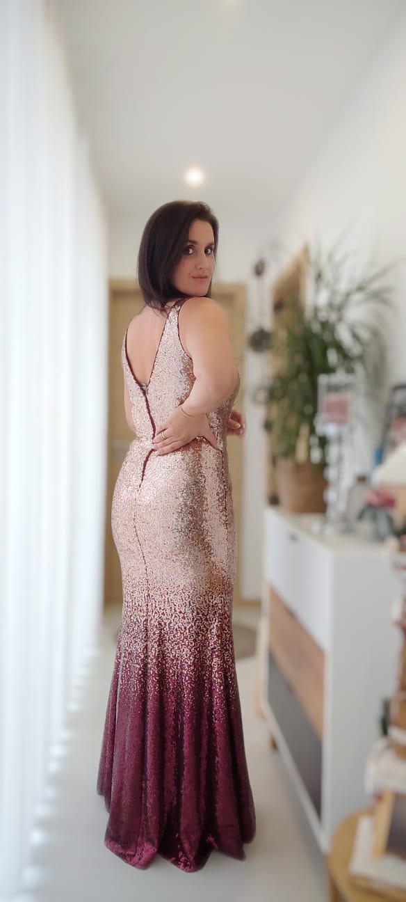 Vestido em lantejoulas com degradê disponível em três cores: Dourado/Preto, Dourado/Bordô e Dourado/Prata.