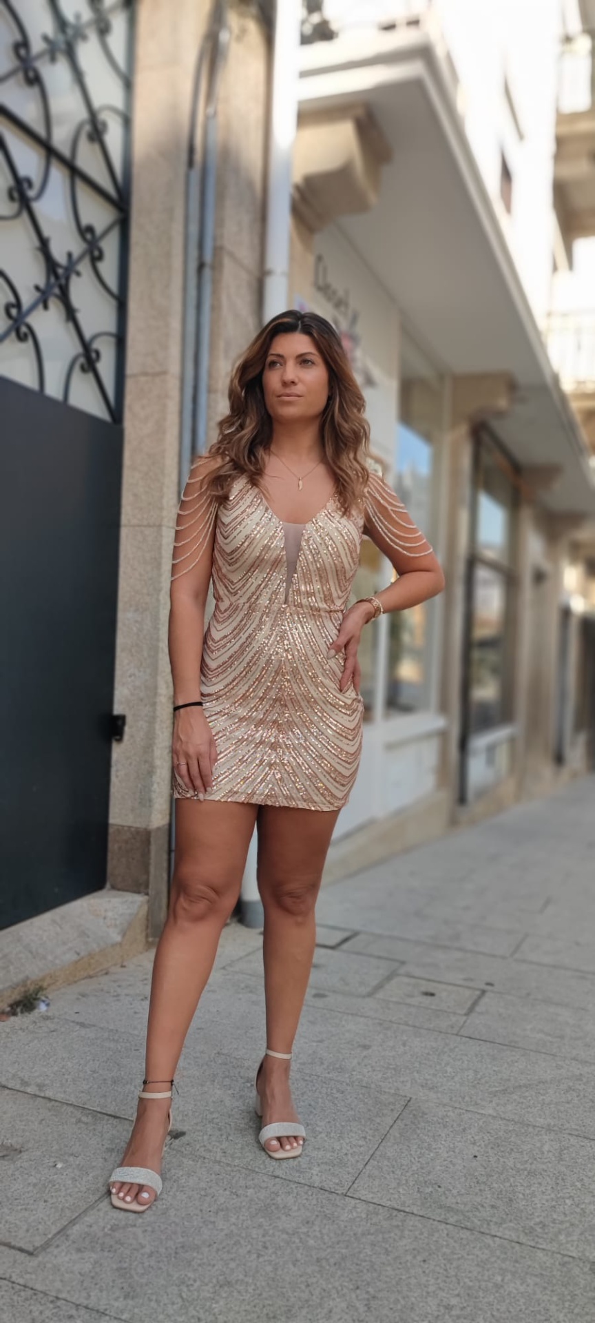 - Vestido com lantejoulas, que captura aluz e cria um brilho incrível;