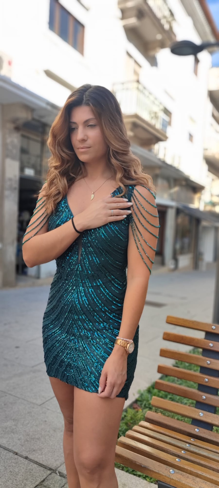 - Fios de lantejoulas que caem pelo ombro.