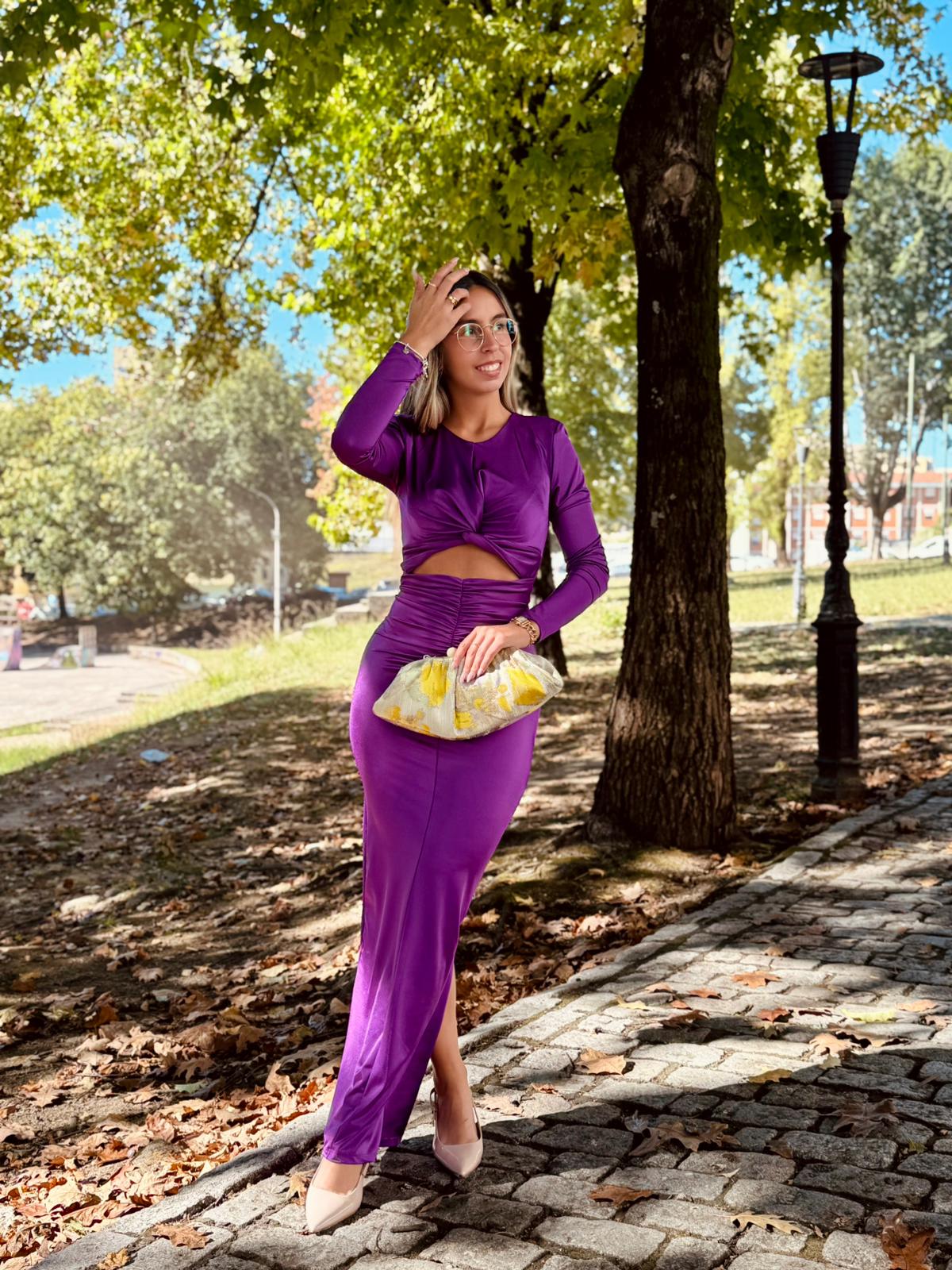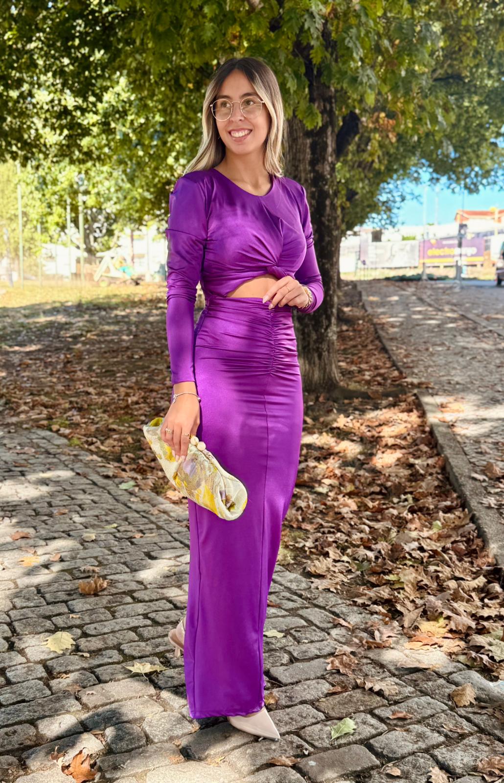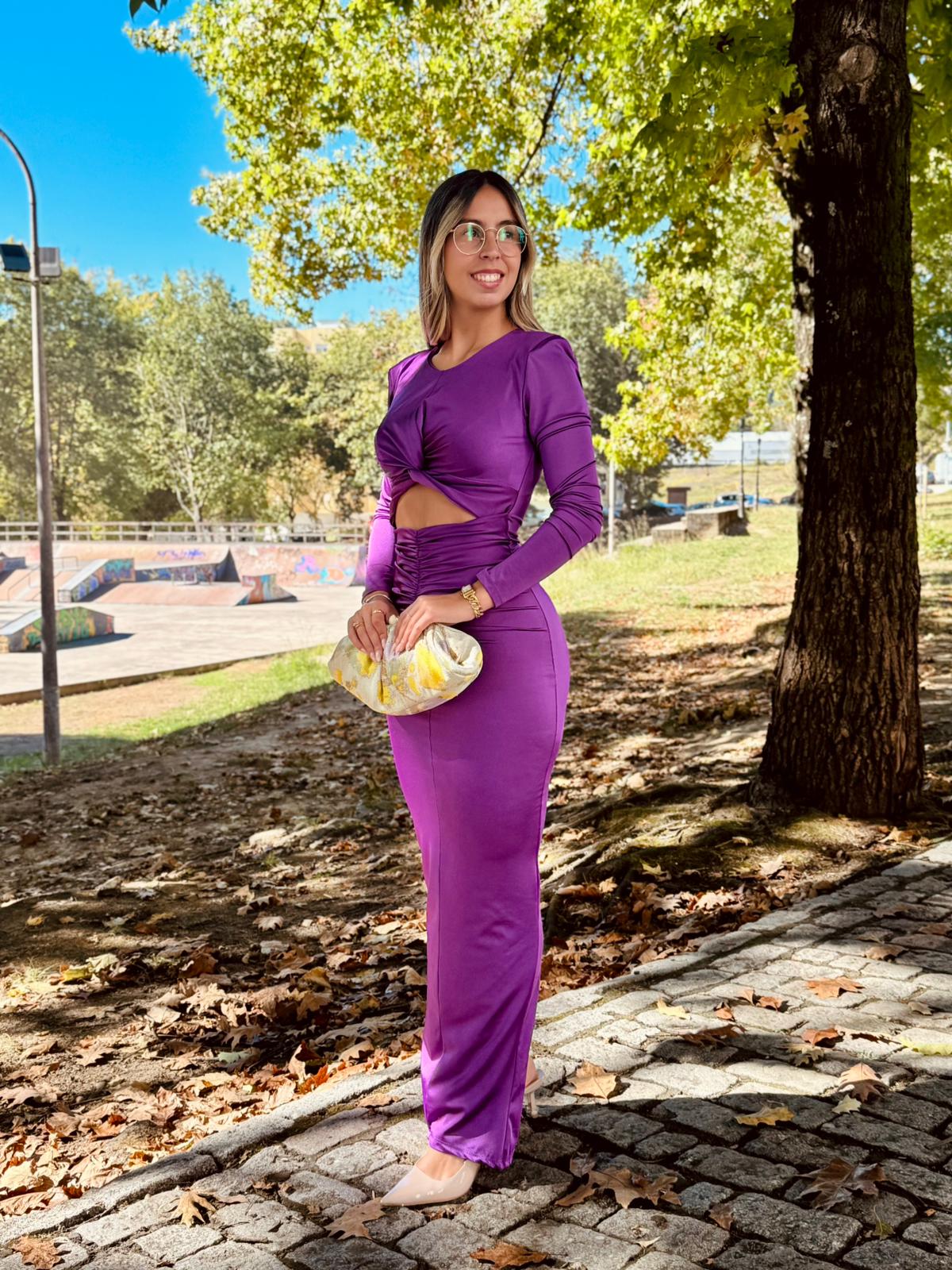 Elegância e modernidade num só modelo! Este vestido longo é confecionado num tecido acetinado com brilho subtil, que realça a silhueta de forma sofisticada.