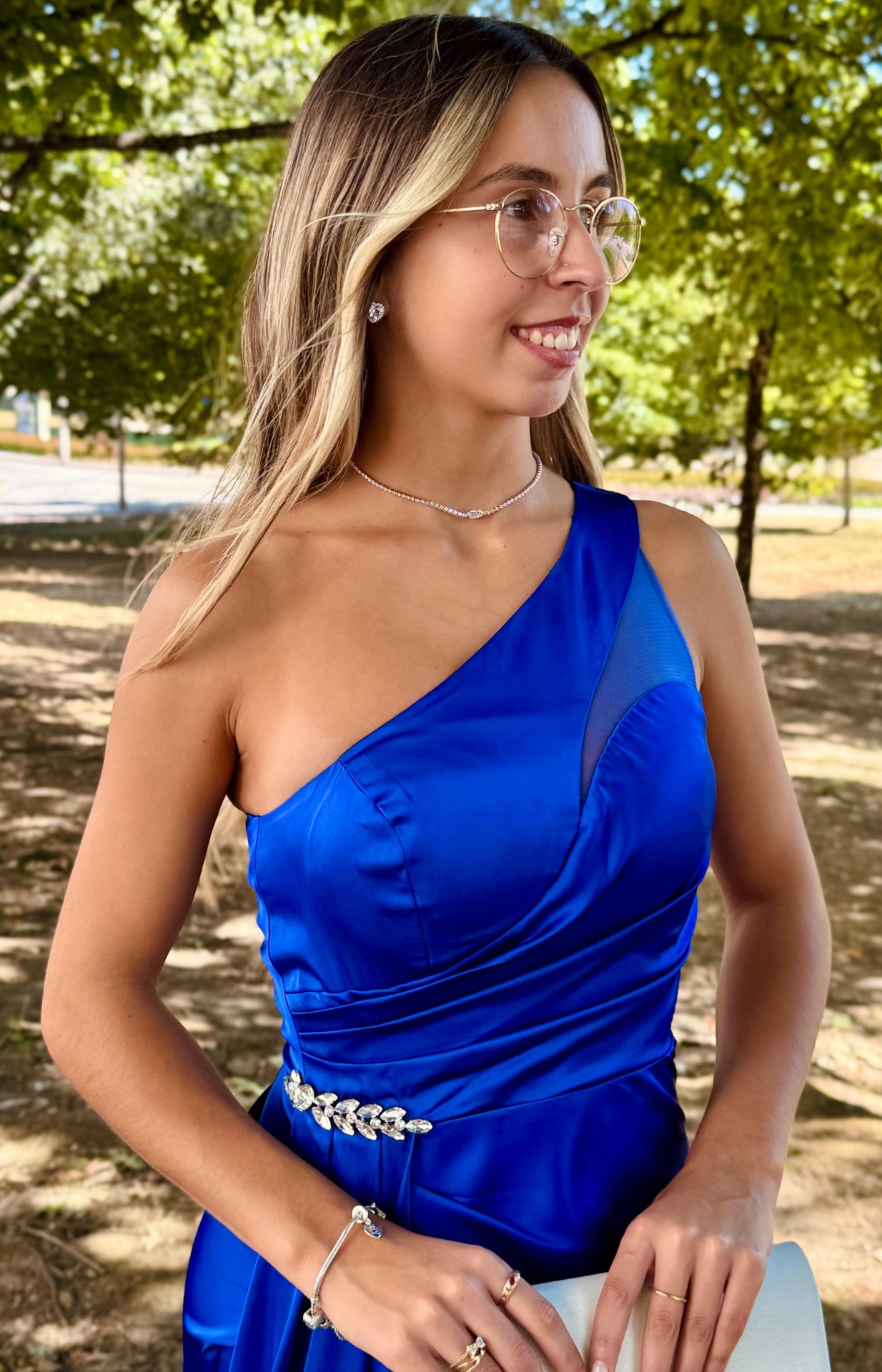 Um modelo cheio de glamour e sofisticação. Este vestido comprido destaca-se pelo seu design assimétrico de um ombro só, que confere um toque moderno e elegante. O corpete drapeado modela a silhueta e realça o busto com delicadeza, enquanto o pormenor brilhante na cintura acrescenta um detalhe de luxo e realce à zona mais feminina.