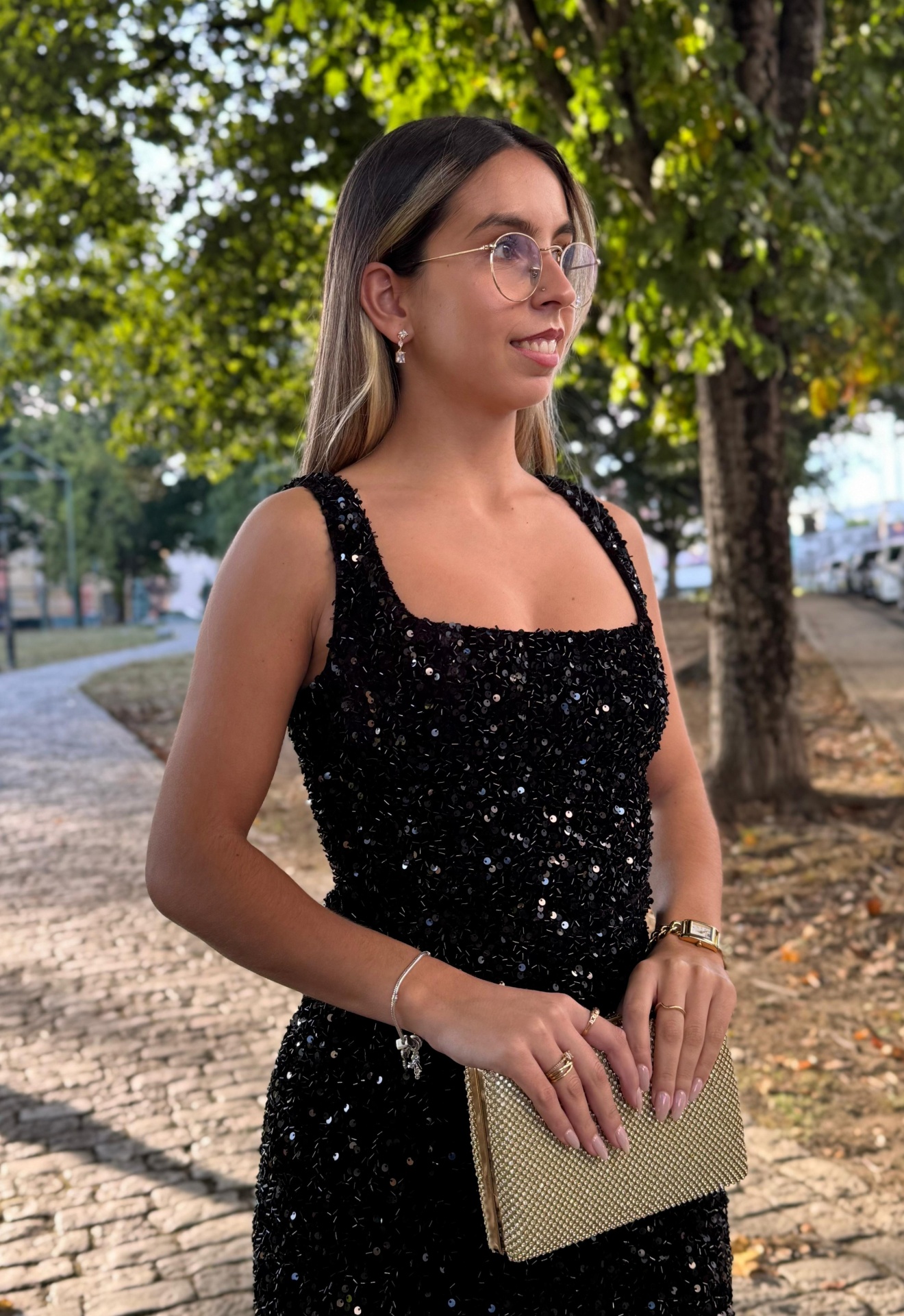 Um modelo que combina brilho e sofisticação, ideal para eventos noturnos e ocasiões especiais. Totalmente coberto por lantejoulas, este vestido curto destaca-se pelo decote quadrado elegante e alças largas, que proporcionam sustentação e conforto sem perder o charme.