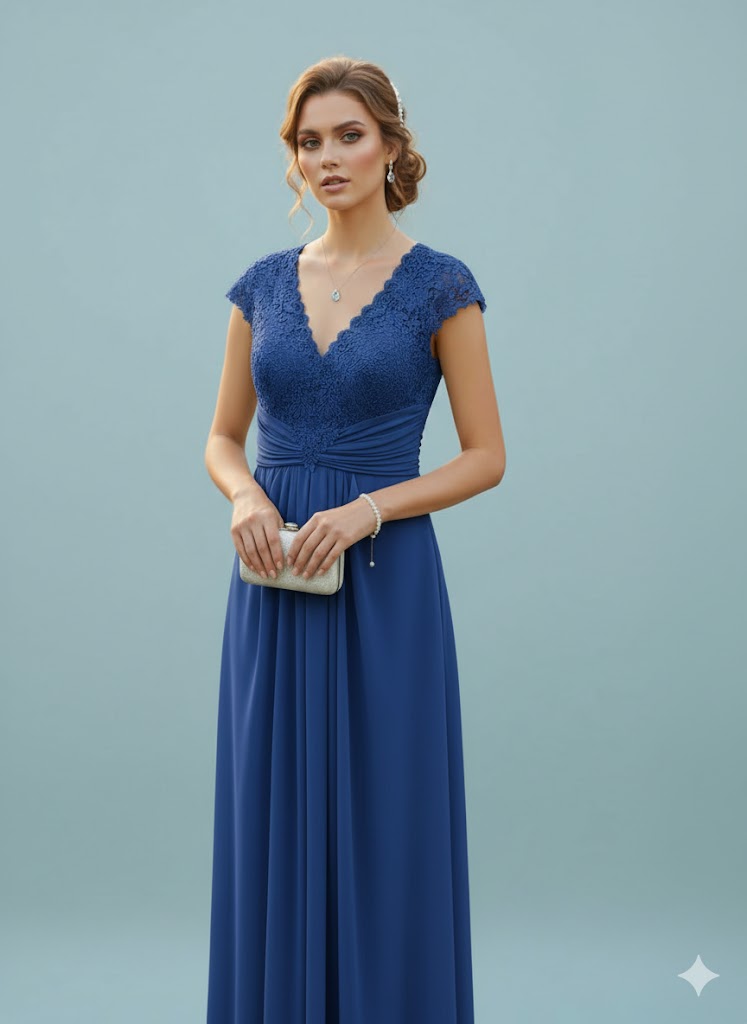 Com um caimento impecável e um ar sofisticado, este vestido é ideal para madrinhas ou convidadas de cerimónias formais que procuram um look discreto, mas luxuoso.