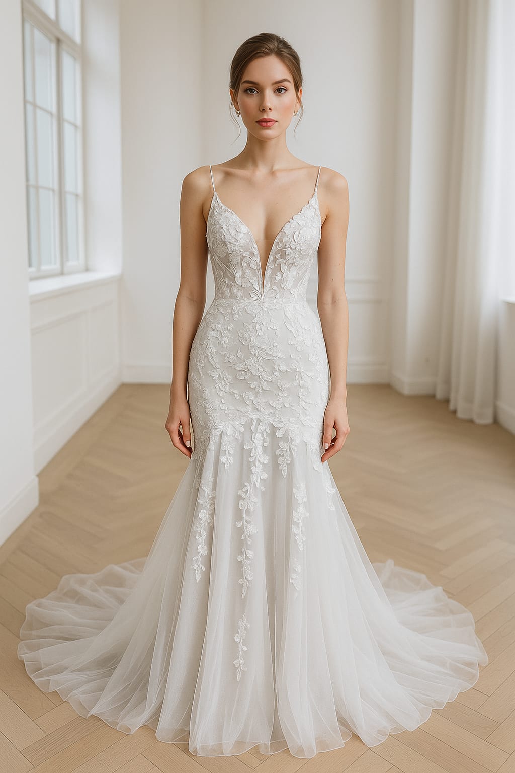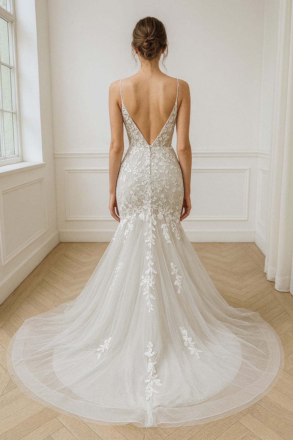 Este vestido de noiva é a expressão perfeita da sensualidade elegante e do romantismo moderno. O decote profundo em V, com alças finas e delicadas, valoriza o colo de forma sofisticada, enquanto as costas em V acentuam a silhueta com ousadia equilibrada.