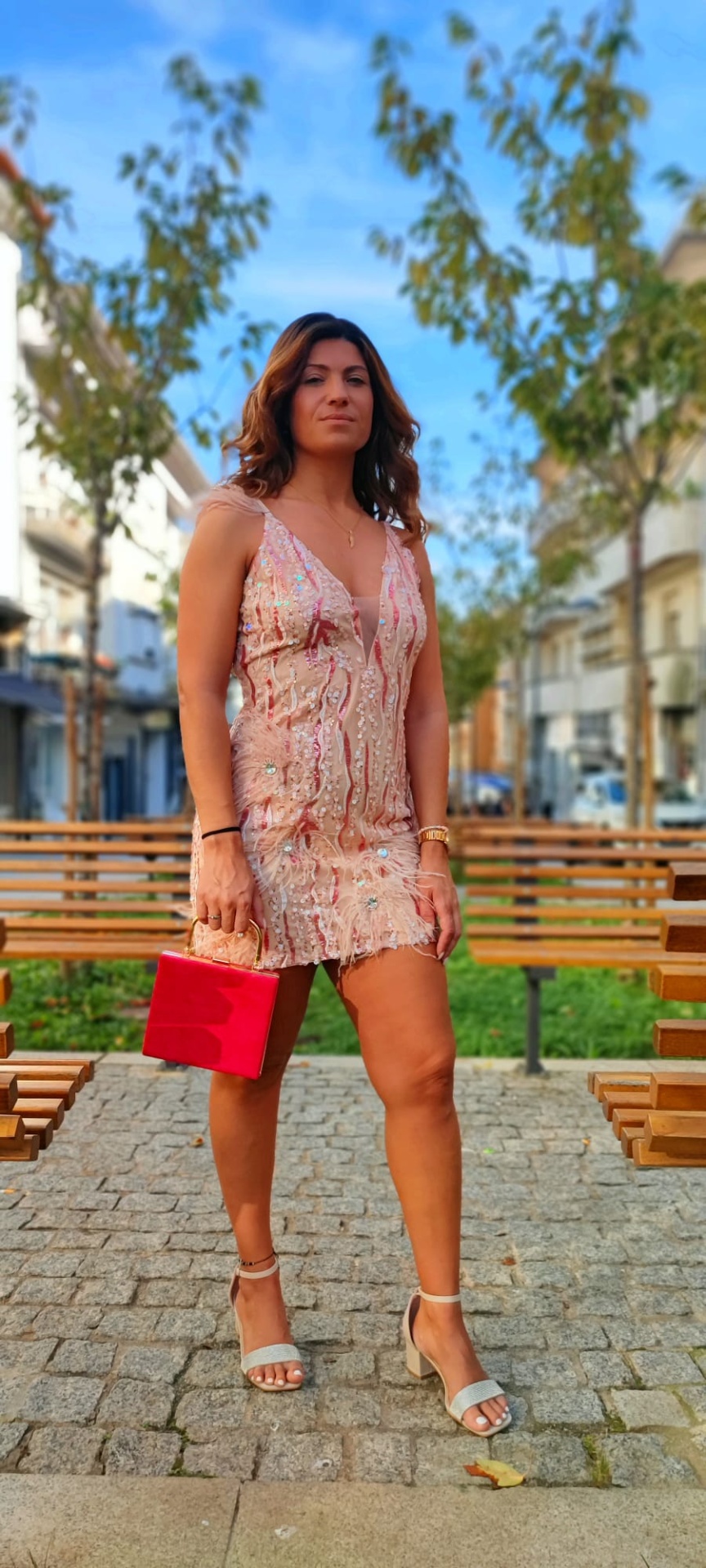 - Vestido com lantejoulas e plumas;