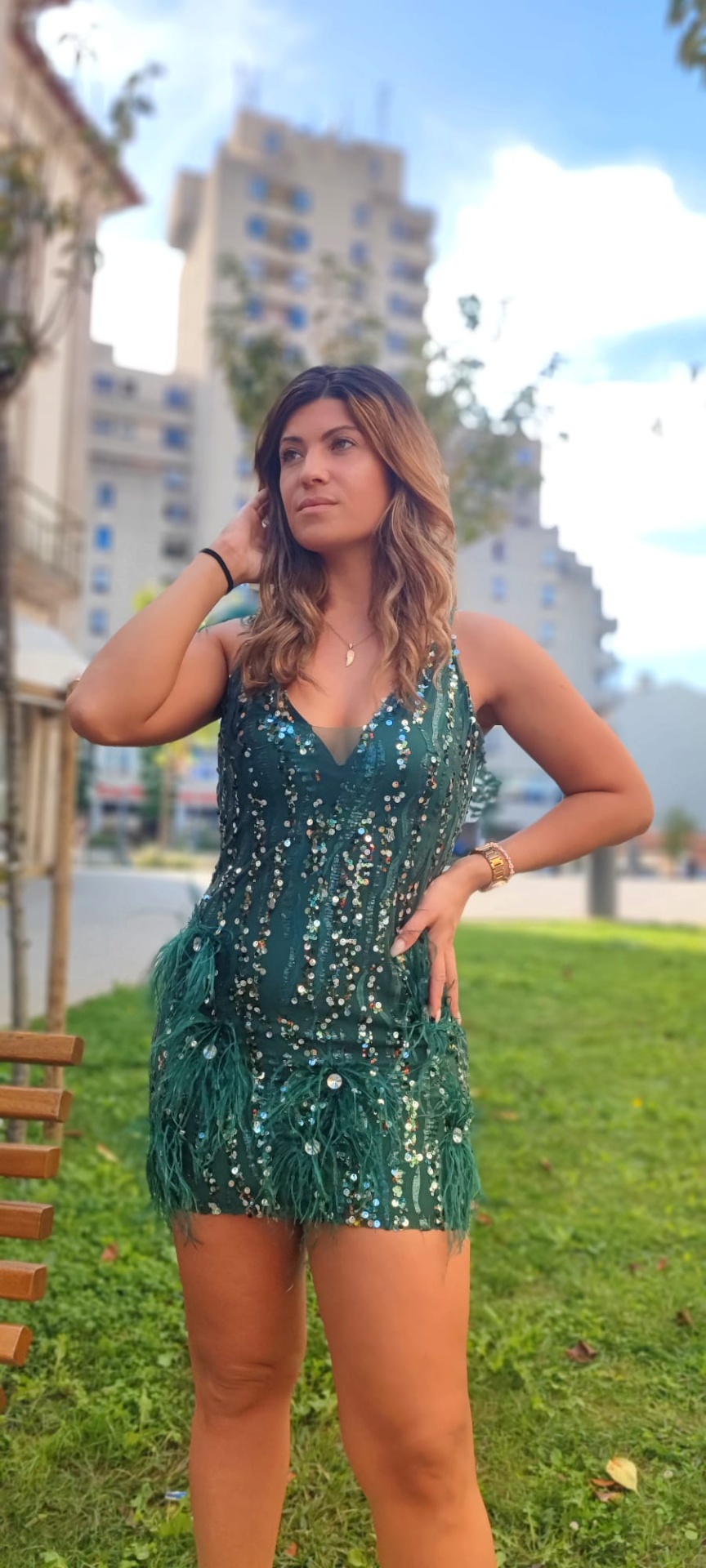 Bem vinda ao mundo da moda exuberante e elegante!! Apresentamos-lhe o nosso mais recente vestido, com brilho deslumbrante e um toque de luxo com plumas. Este vestido é a escolha perfeita para quem deseja brilhar.