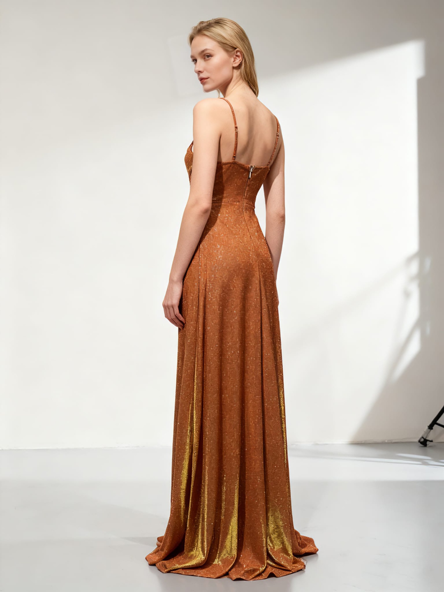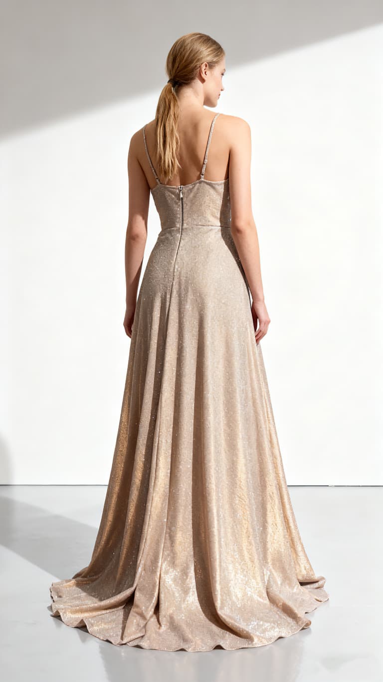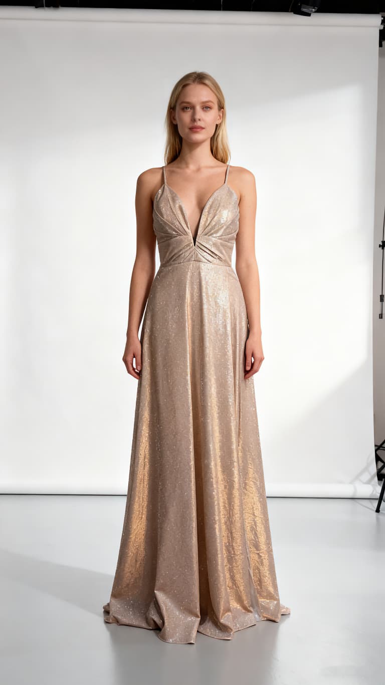 Confecionado em tecido com brilho, este vestido longo destaca-se pelo decote profundo em V com pregas delicadas, que valorizam o busto de forma elegante.