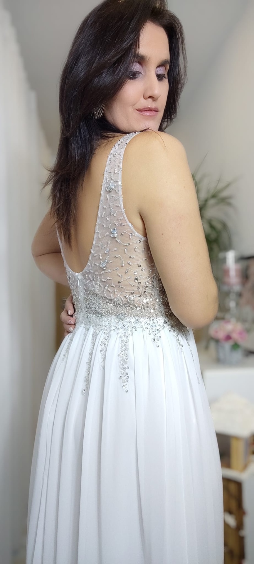 A parte de cima é adornada com brilhos, acrescentando um toque de glamour com transparência. Com copas que oferecem suporte e estrutura, este vestido tem uma saia de tecido fluído, conferindo movimento e graciosidade.