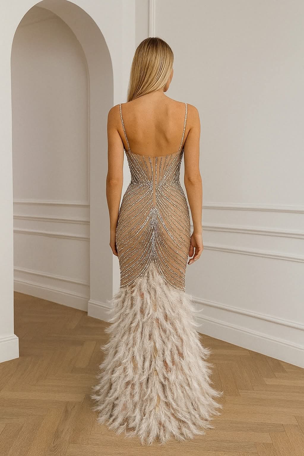 A saia em corte sereia é adornada com camadas de plumas suaves, proporcionando movimento e um toque de alta-costura digno dos grandes eventos.