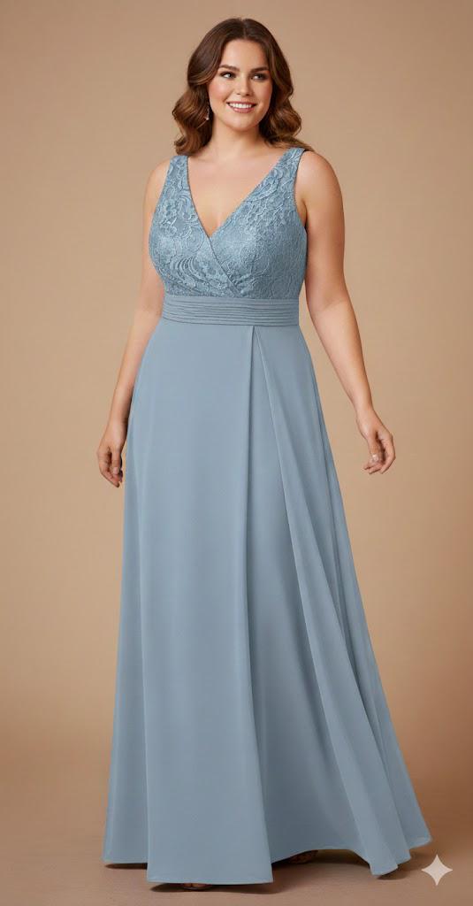 O modelo destaca-se pelo seu corpete meticulosamente trabalhado em renda floral delicada, apresentando um decote em "V" que alonga a silhueta e valoriza o colo de forma elegante.