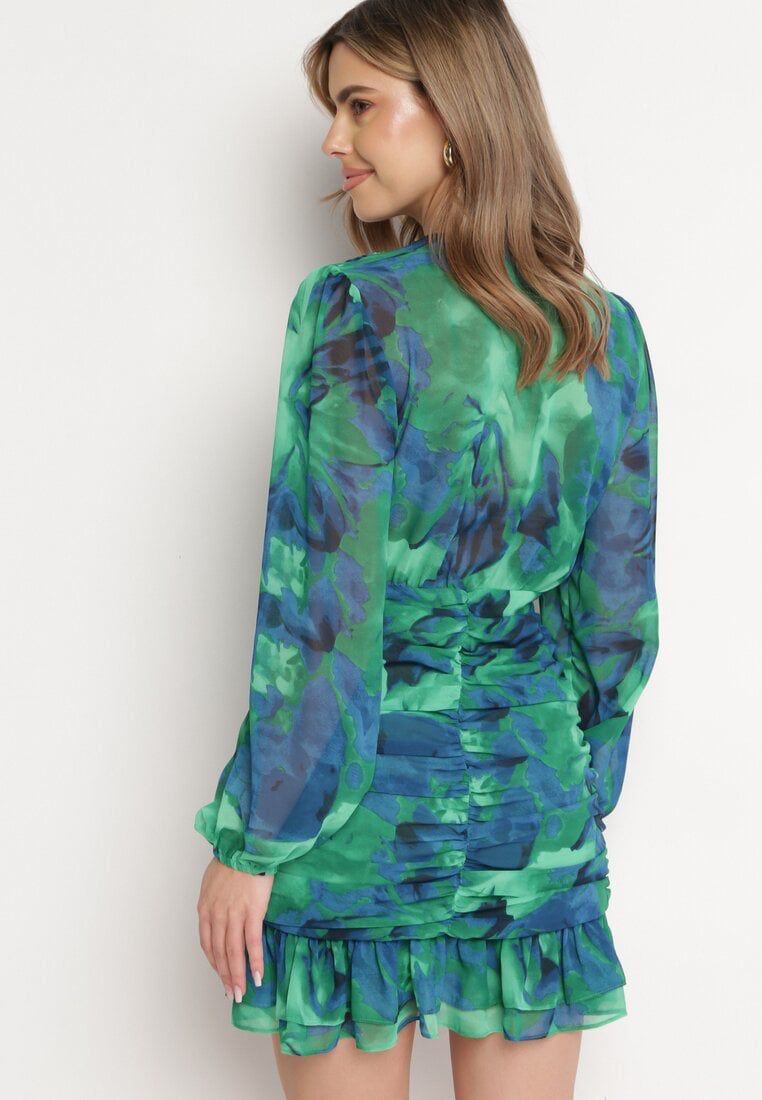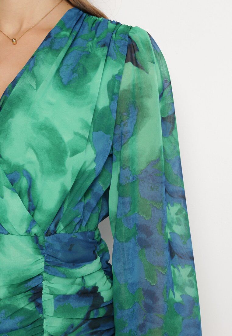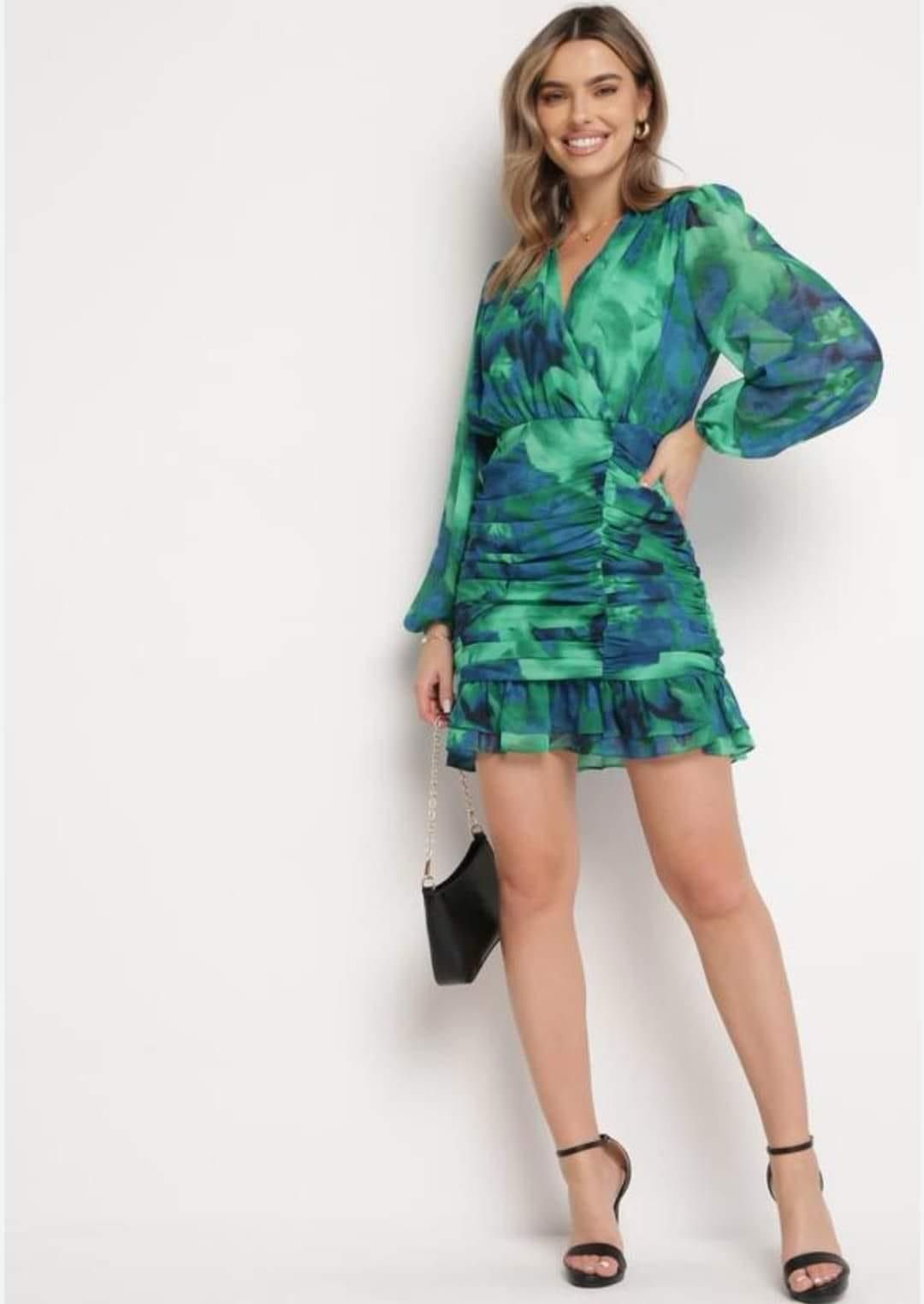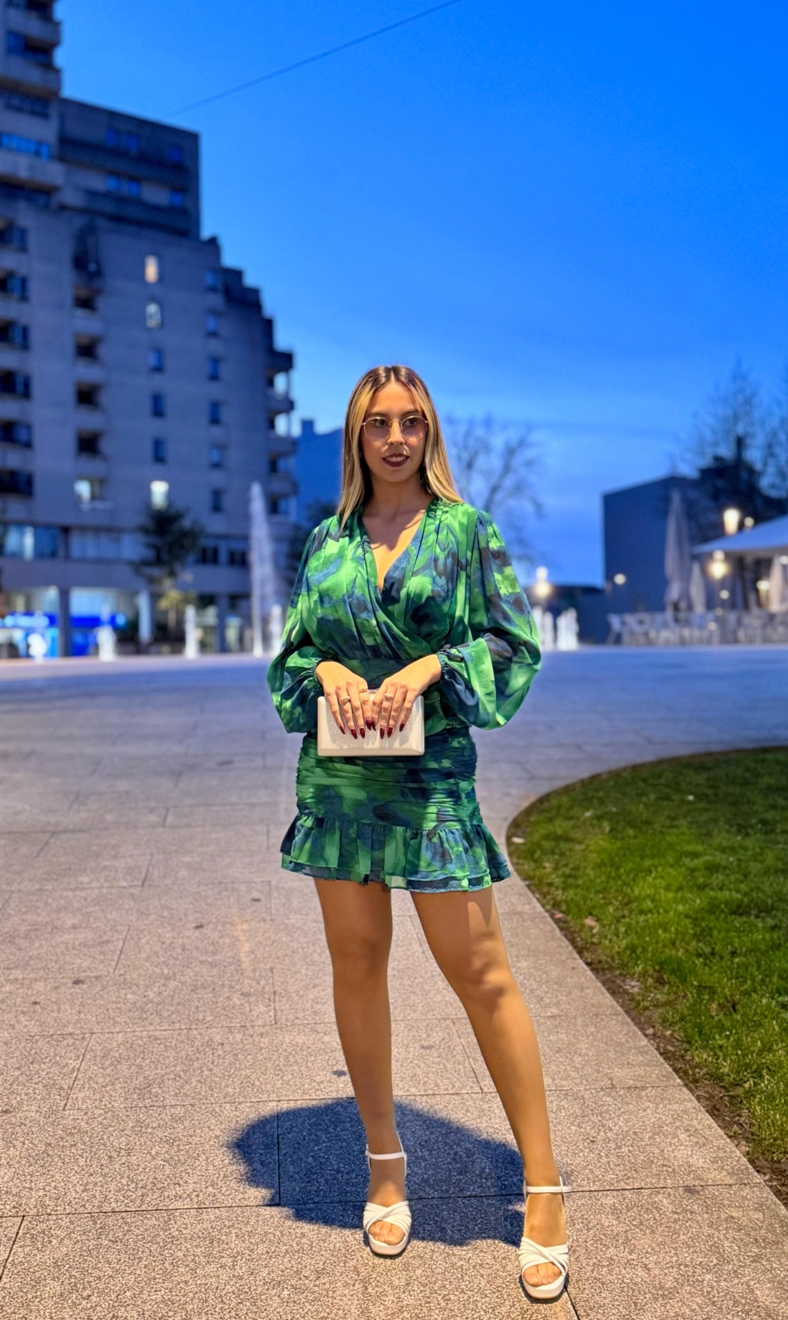 Vestido com padrão vibrante em tons de azul e verde, que evoca uma sensação de frescor e vitalidade.