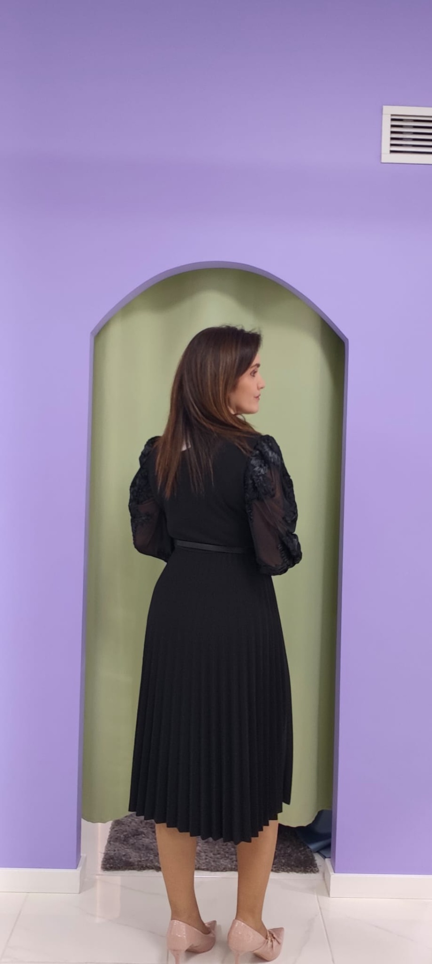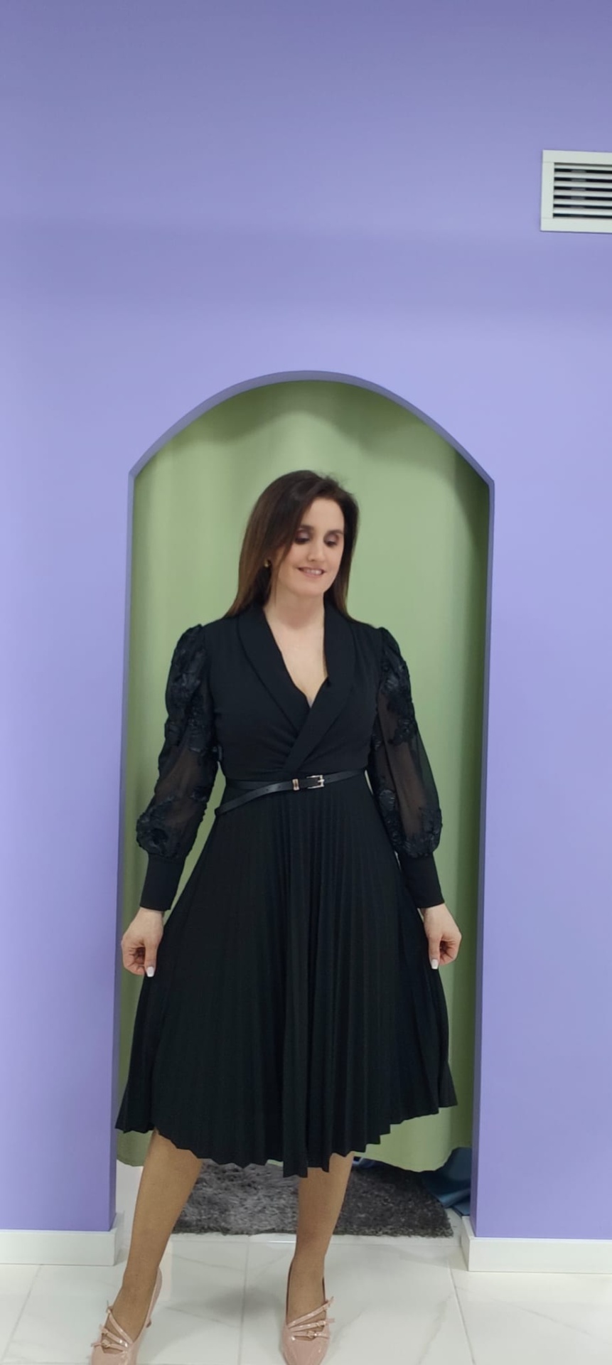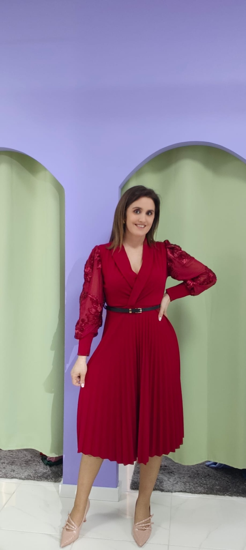 A cintura é marcada por um cinto fino removível, que define a silhueta e proporciona um ajuste mais elegante. A saia midi com pregas finas confere movimento e fluidez ao caminhar, garantindo conforto sem perder estrutura.