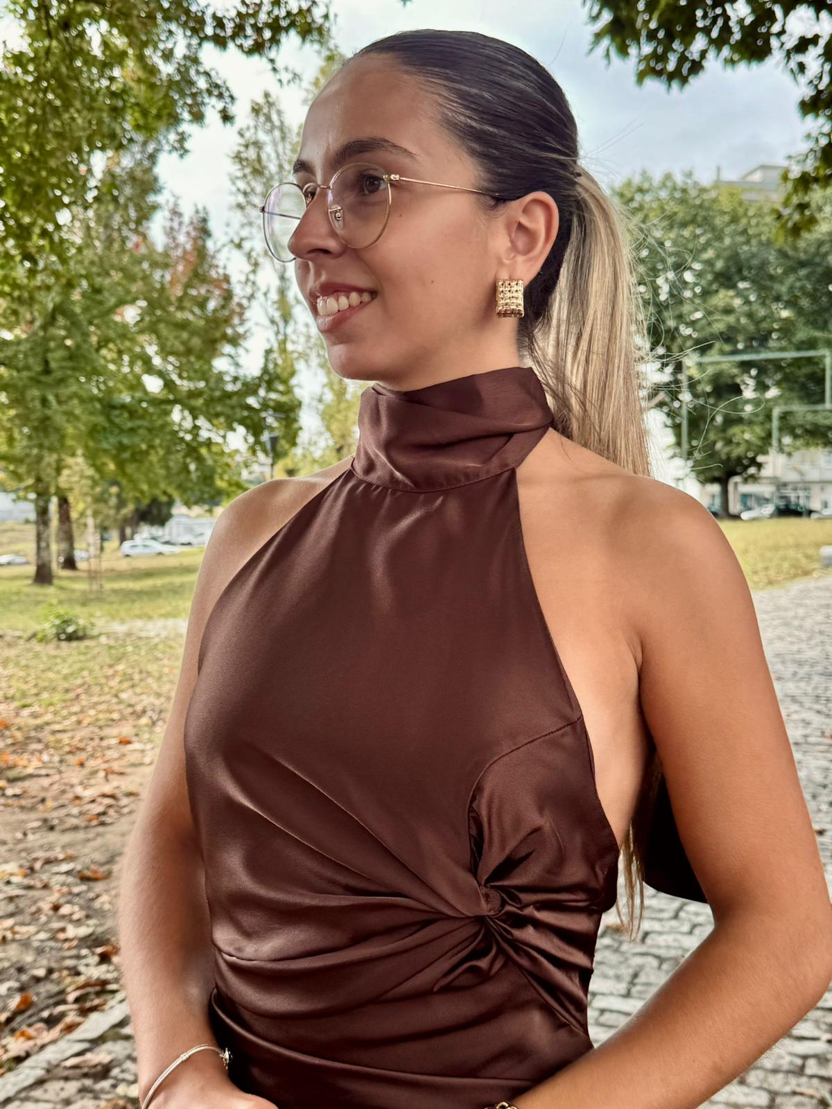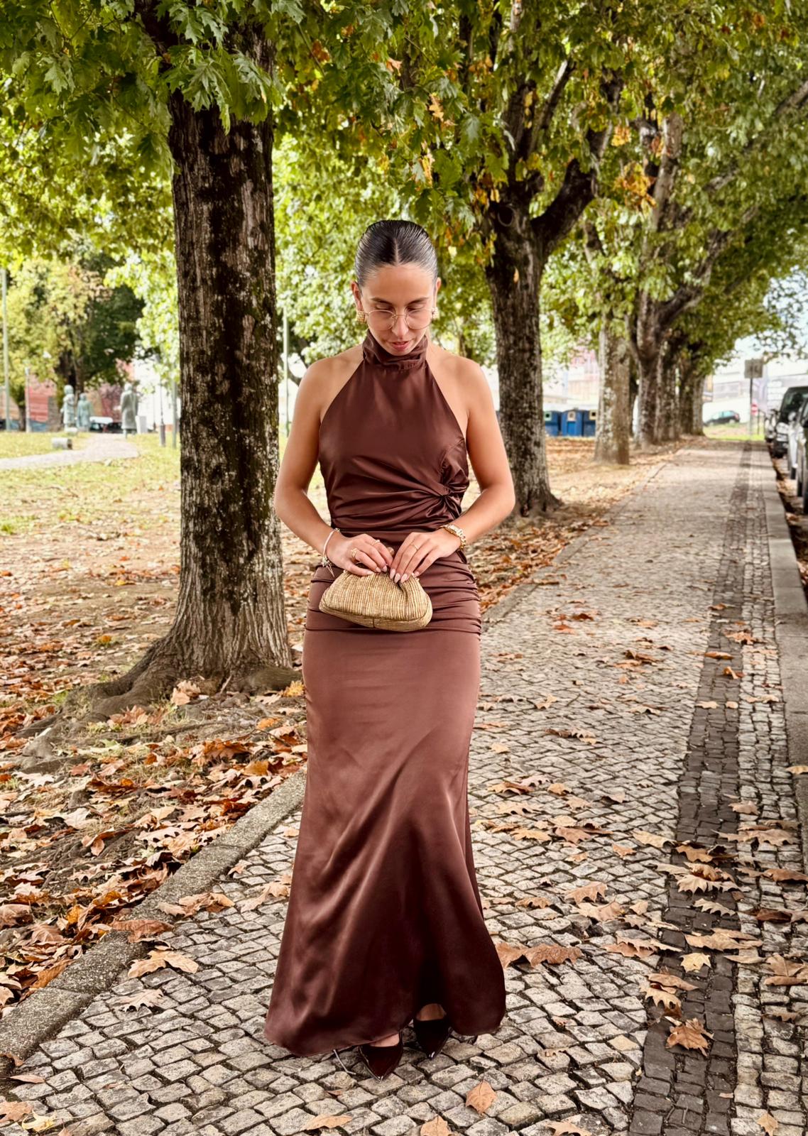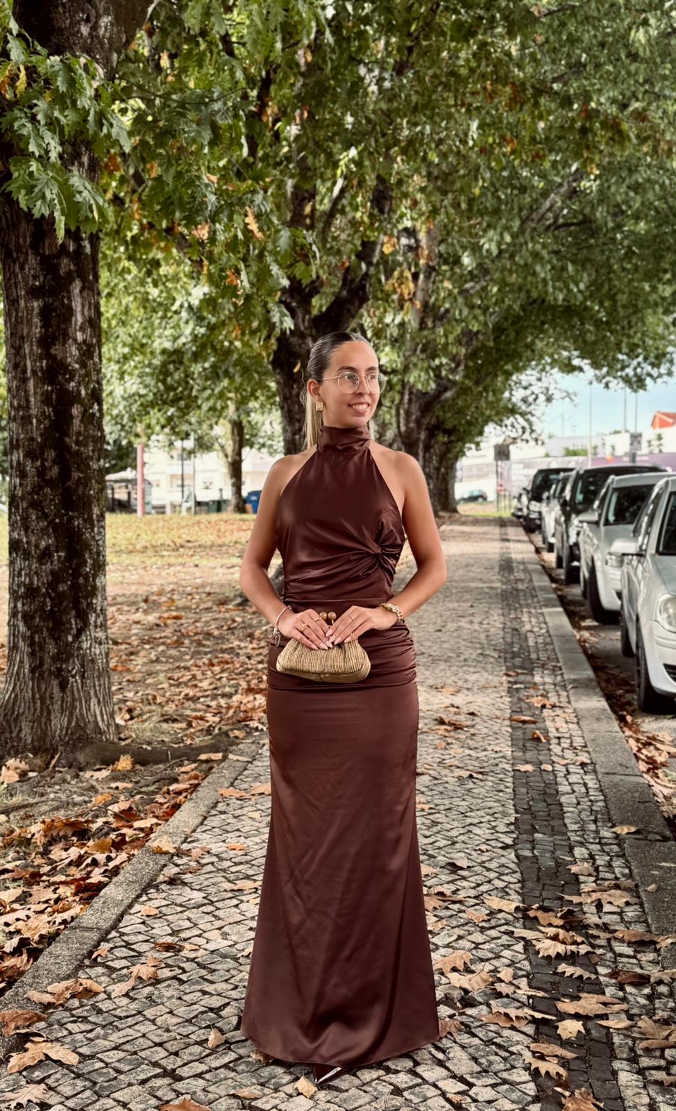A abertura nas costas, com laço fluído e caída elegante, confere sensualidade na medida certa, perfeita para eventos formais e noites especiais.