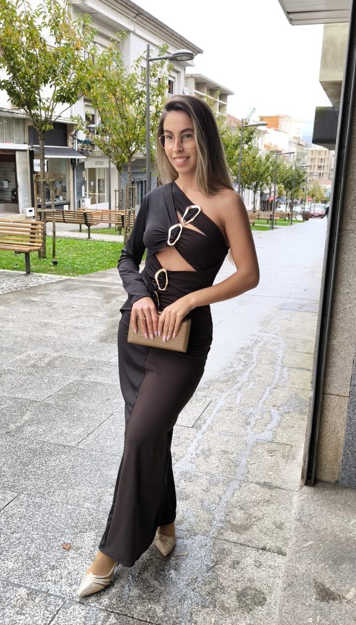 Um vestido elegante e arrojado, perfeito para ocasiões especiais. O seu design de um só ombro, com manga comprida de um lado e recortes estratégicos na frente, cria um visual moderno e sofisticado.