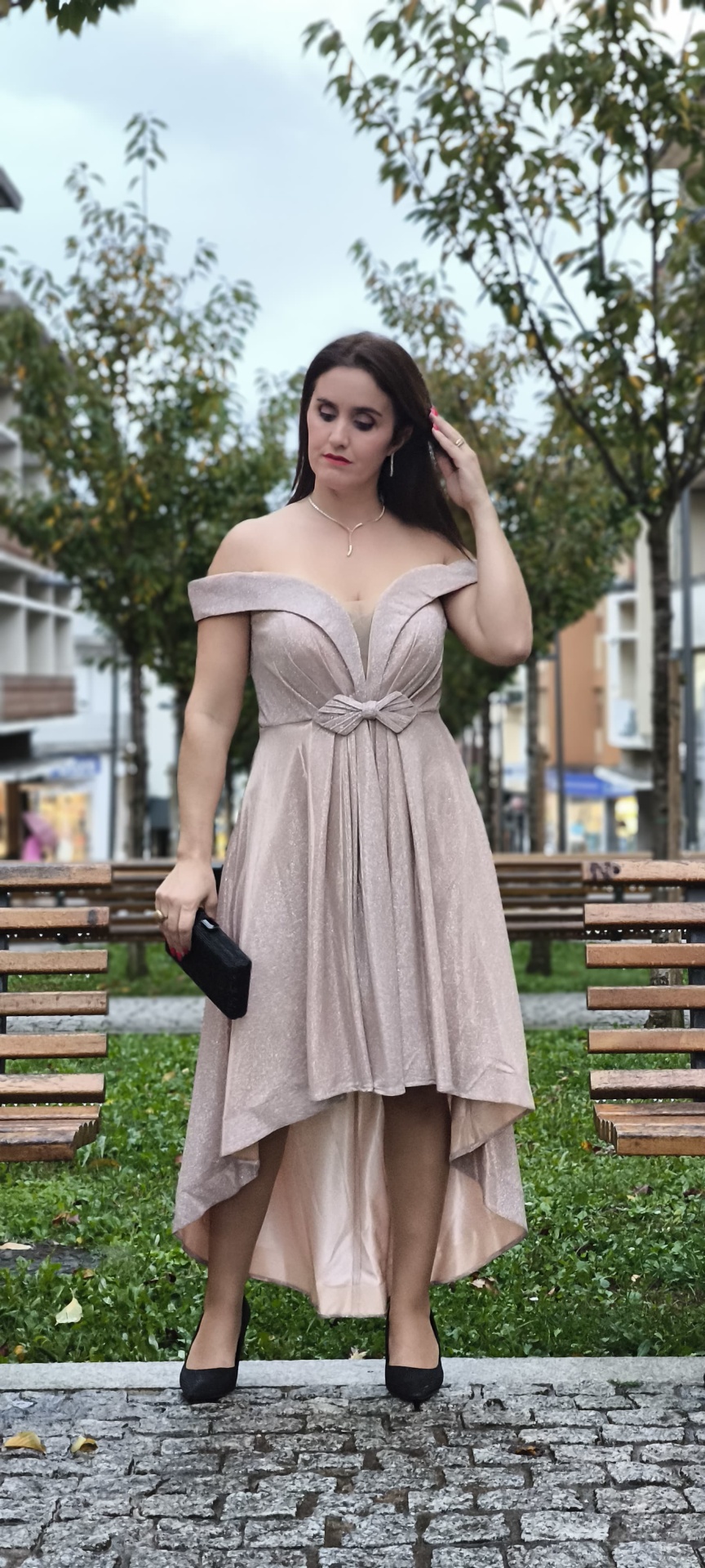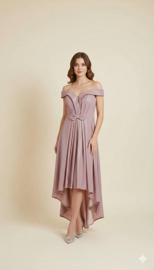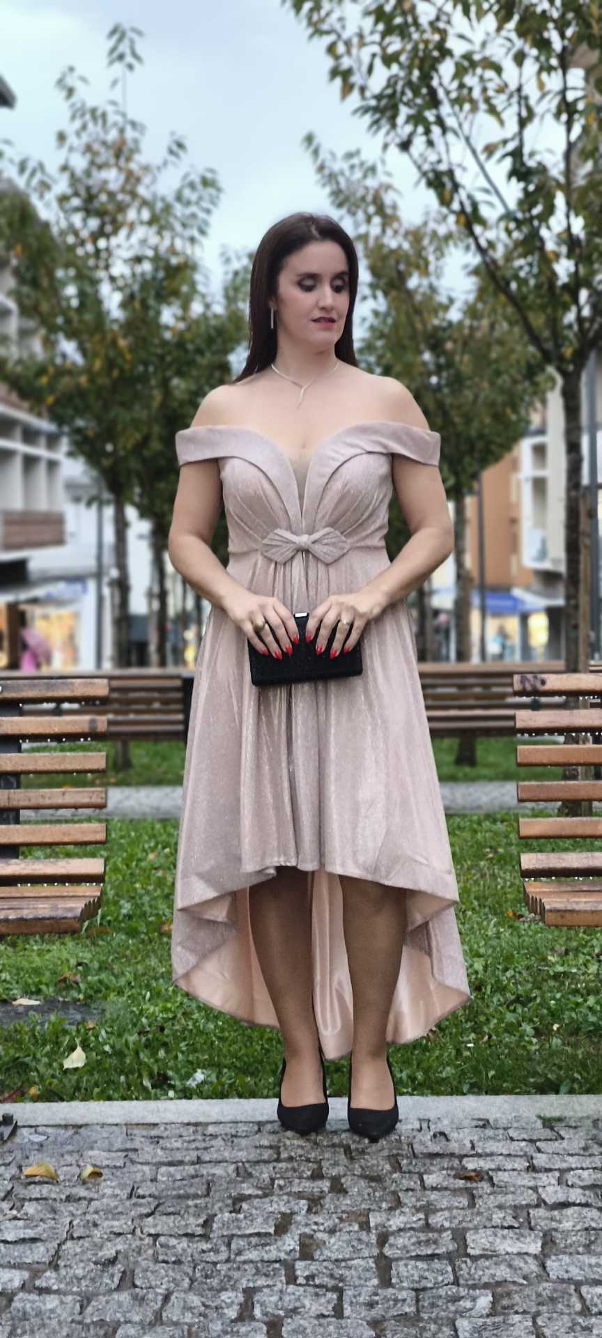 Vestido com tecido brilhante, curto à frente e comprido atrás. Tem decote à barco, com copa e um laço na cintura. Tem atilhos nas costas para um ajuste perfeito.