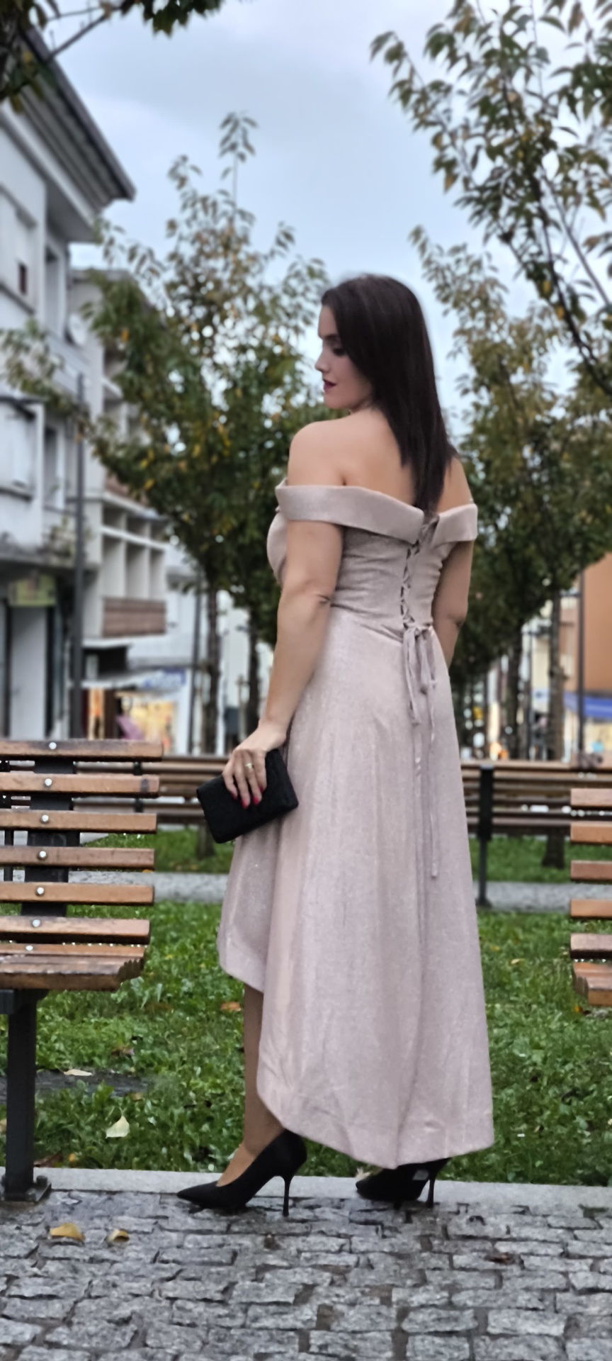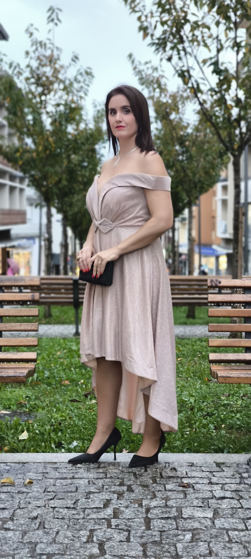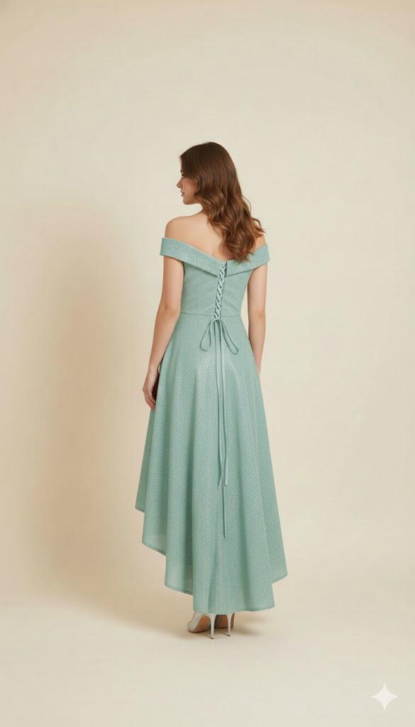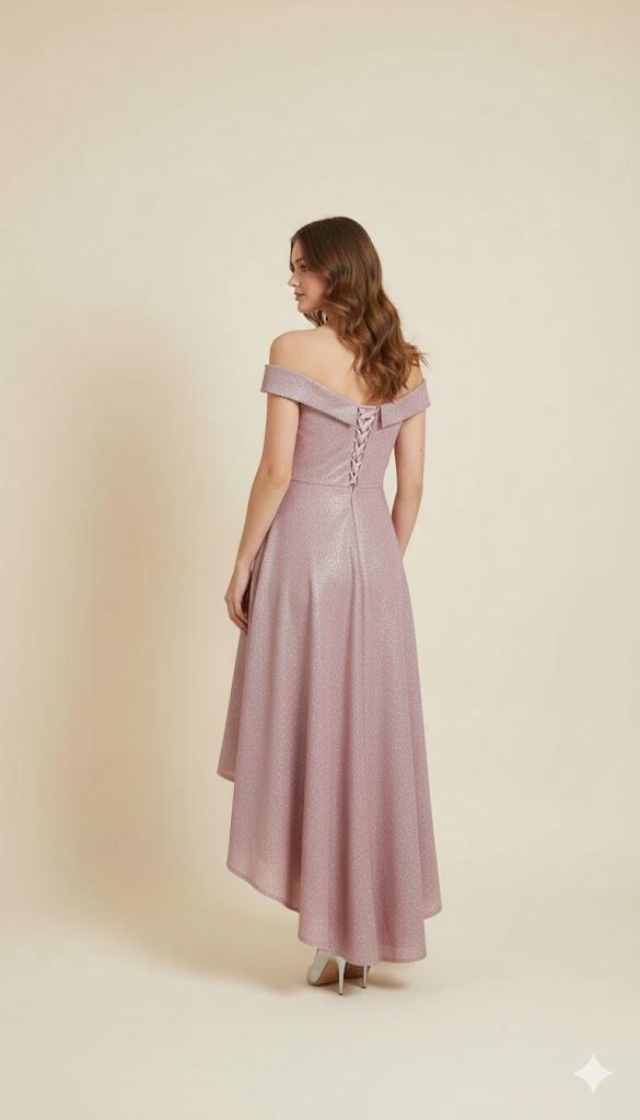 Vestido com tecido brilhante, curto à frente e comprido atrás. Tem decote à barco, com copa e um laço na cintura. Tem atilhos nas costas para um ajuste perfeito.