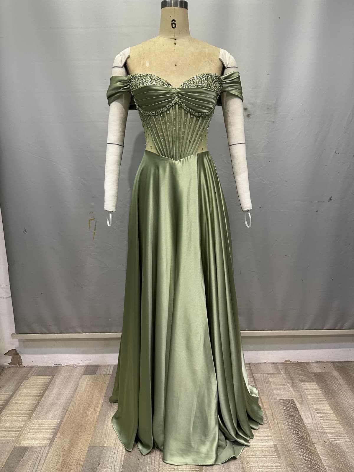 Vestido de cerimónia longo em cetim de brilho suave, com um design romântico e sofisticado. O decote coração com efeito drapeado realça o busto, enquanto as mangas caídas nos ombros acrescentam um toque delicado e feminino.