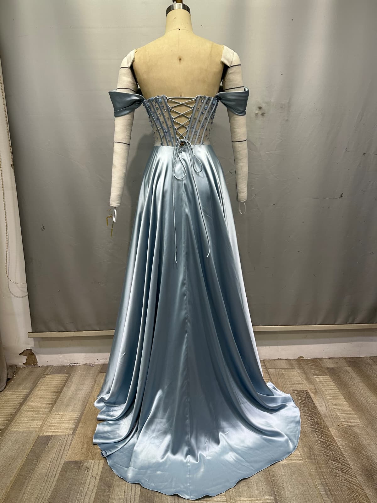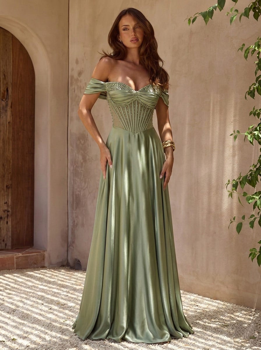 O corpete estilo corset, define a silhueta e proporciona um efeito estruturado e elegante. A saia longa e fluída cai de forma leve, criando movimento e um caimento impecável.