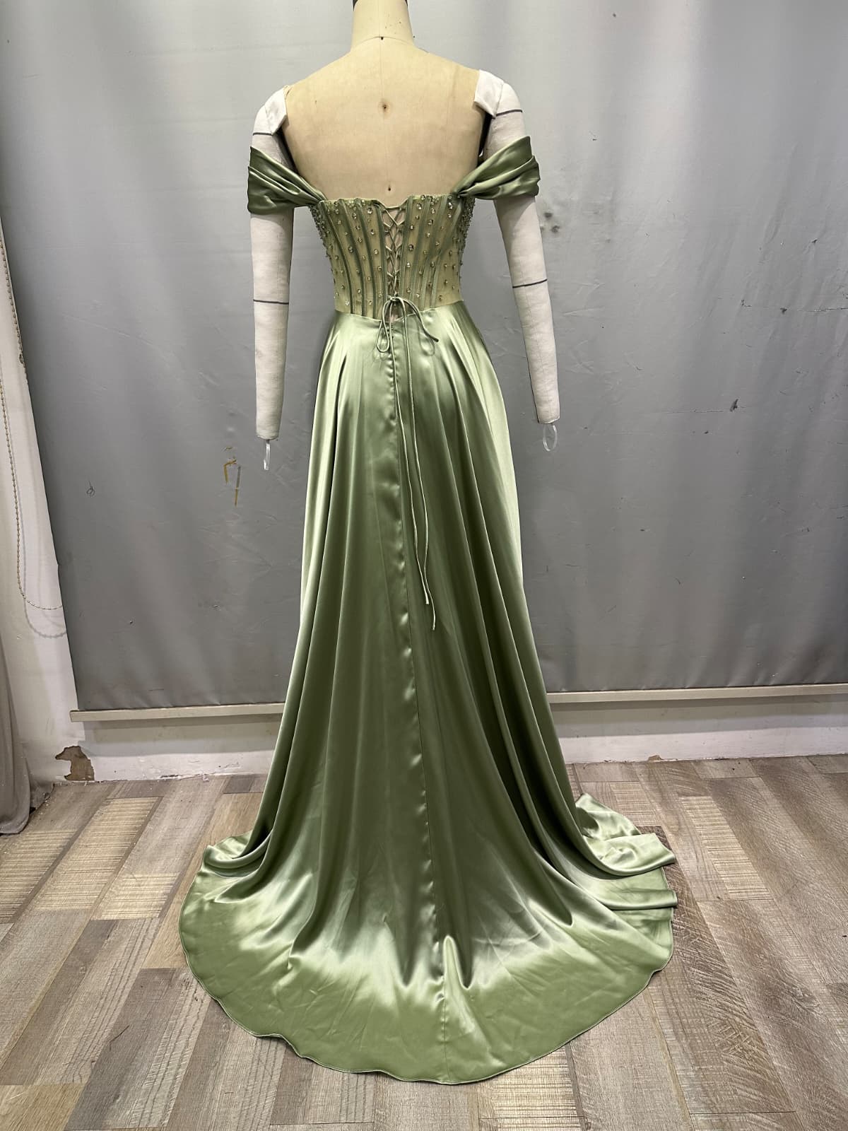 Nas costas, o destaque vai para o sistema de aperto tipo laço (lace-up), que permite ajustar o vestido ao corpo de forma perfeita, além de criar um detalhe visual muito elegante. O corte mantém-se fluído na parte inferior traseira, acompanhando o movimento natural do corpo com sofisticação.