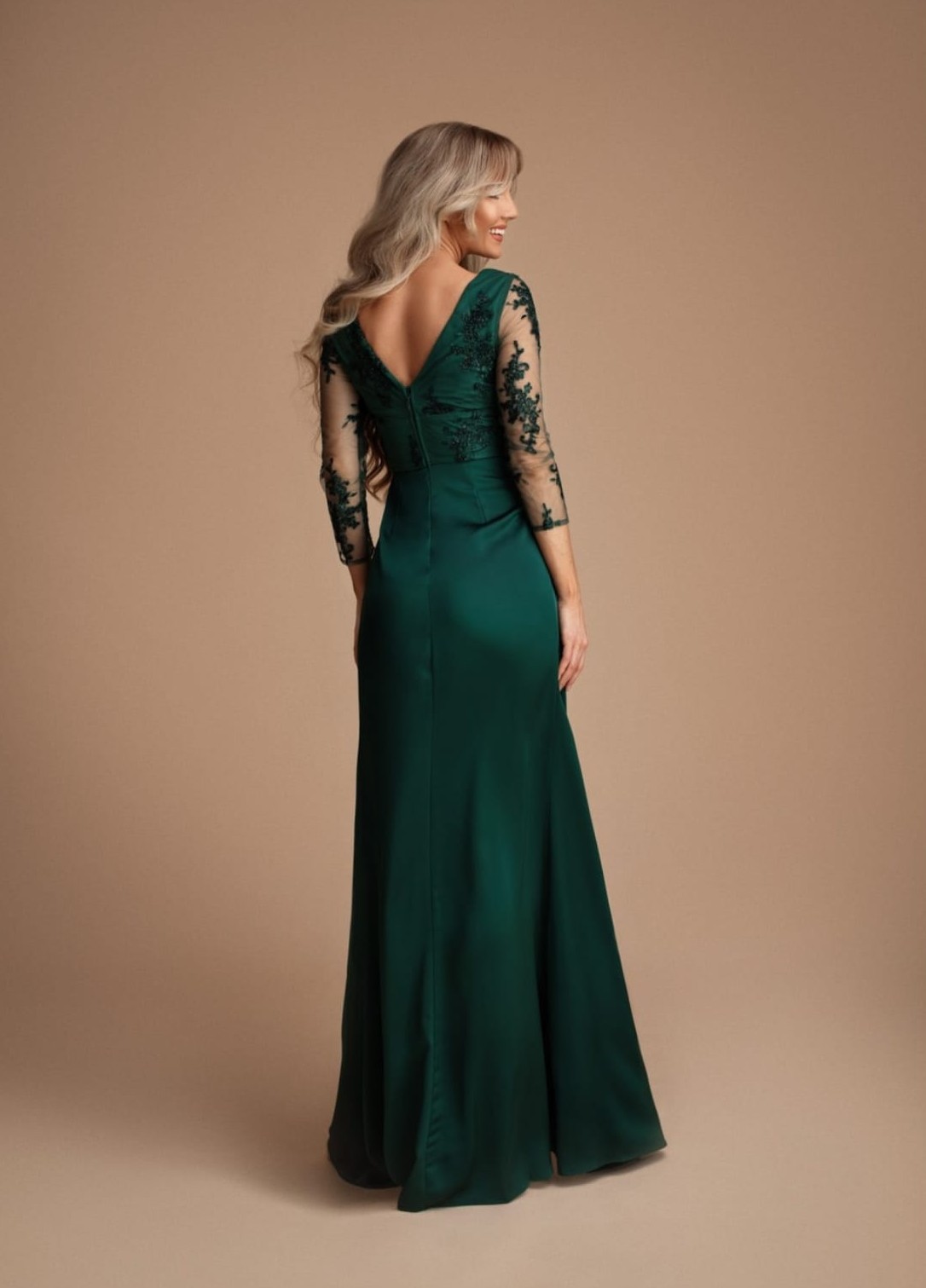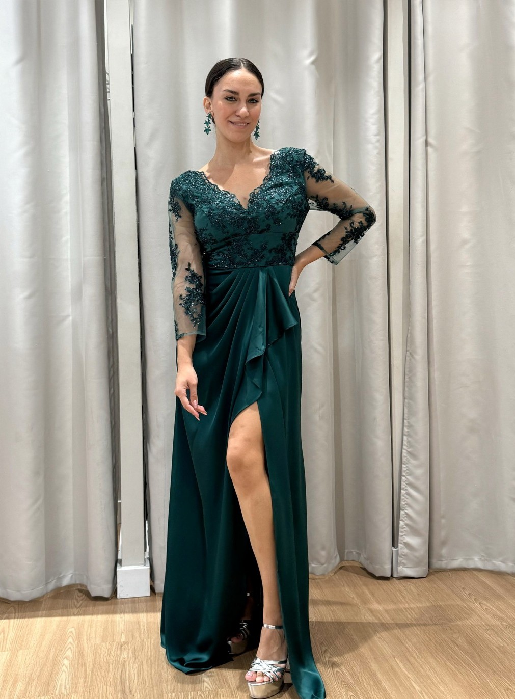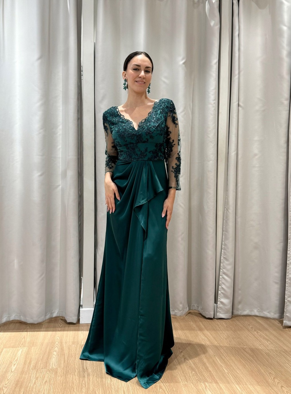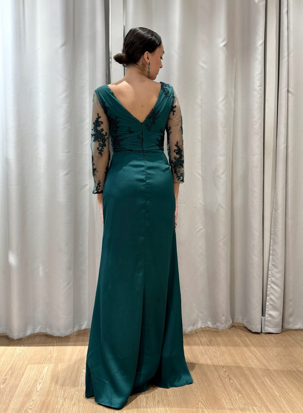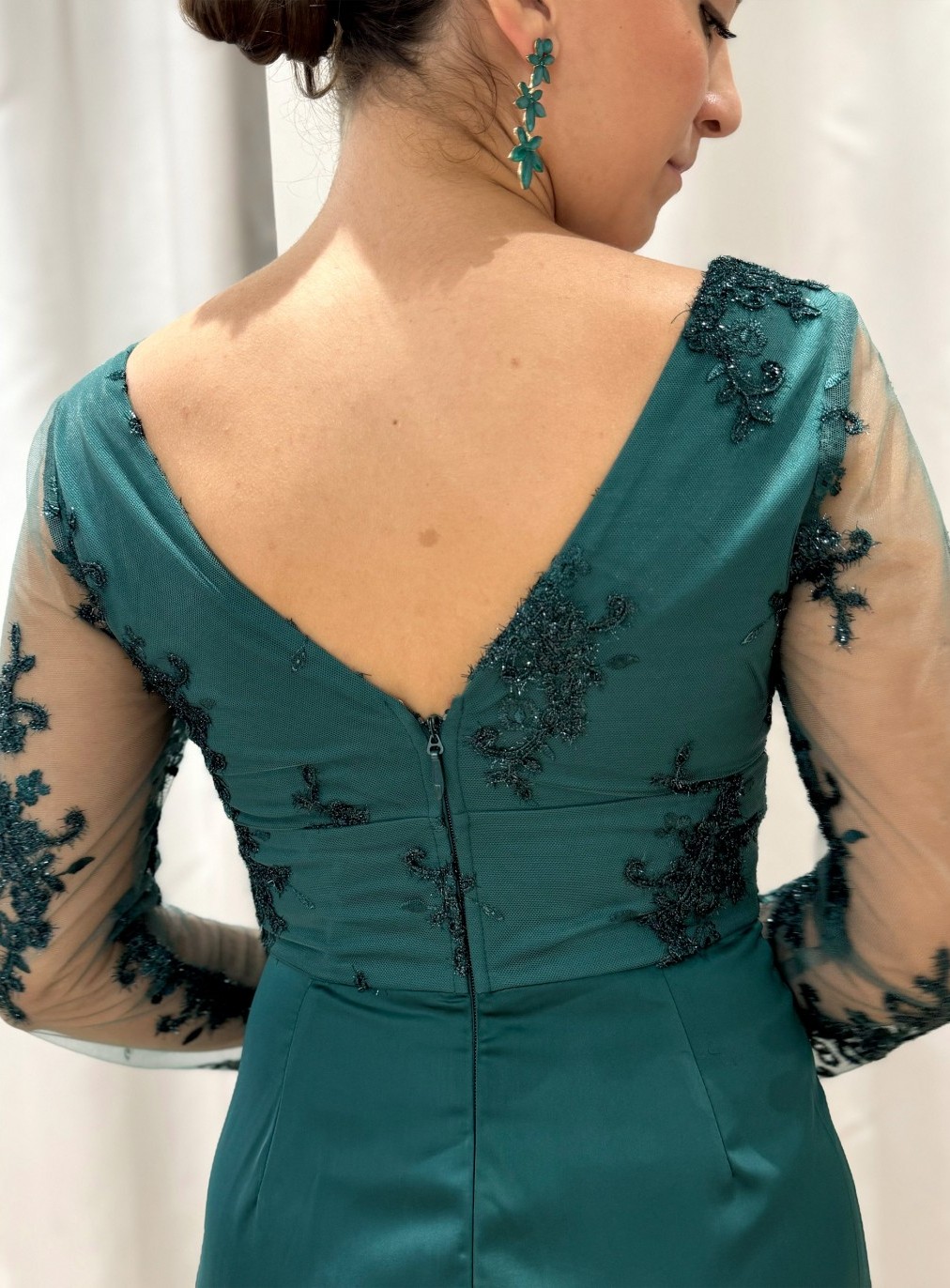 Arrase em qualquer ocasião especial com este magnífico vestido de cerimónia, disponível do tamanho 42 ao 46. O modelo apresenta um corpete bordado em renda delicada com transparência subtil nas mangas, conferindo um toque de elegância e sofisticação.